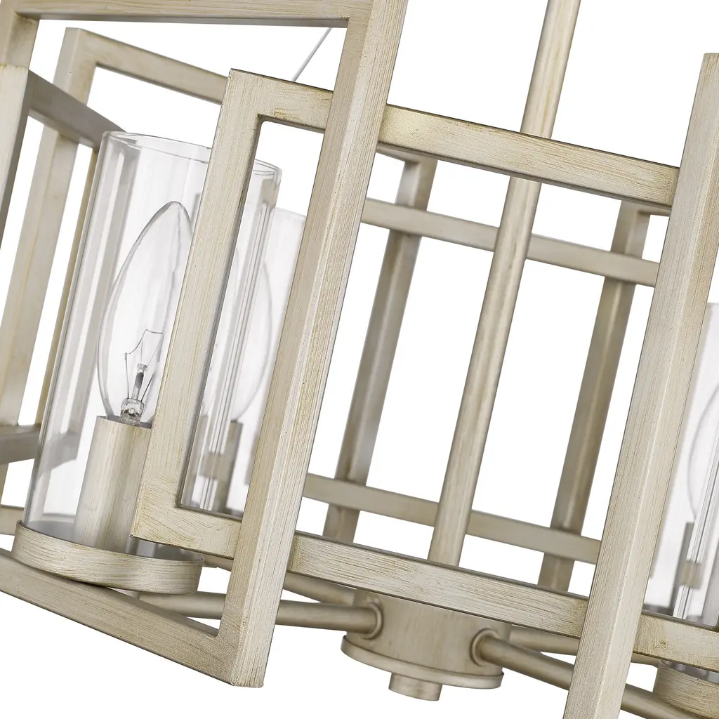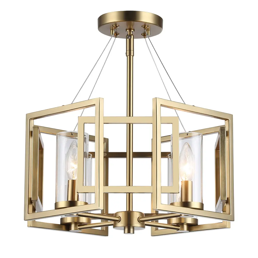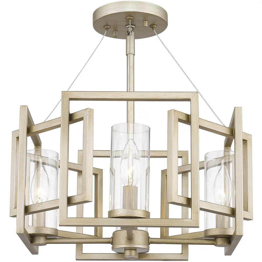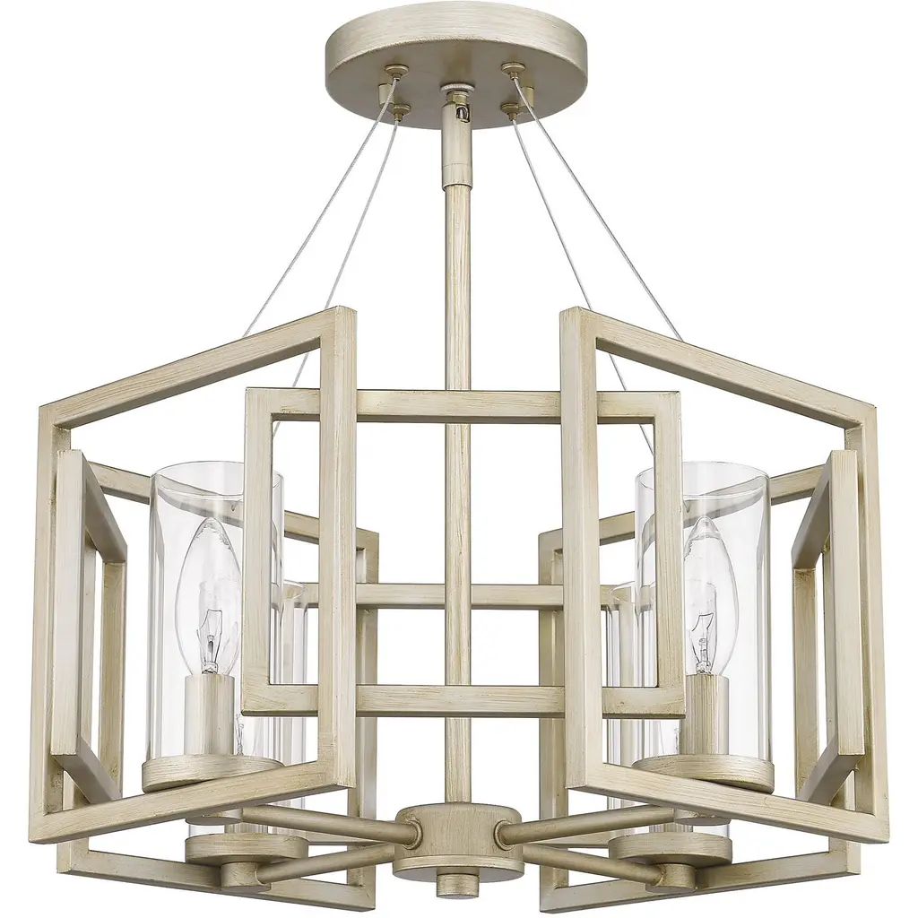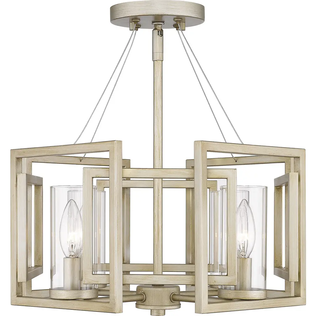 Bring Modern elegance into your home with the Golden Lighting Marco 4-light Semi-Flush Mount. Featuring a glass shade and a White Gold frame, it creates a welcoming atmosphere. The Clear Glass shade offers brilliant, unobstructed light, perfectly complementing your decor while enhancing the beauty of the bulbs. Its sophisticated, hand-applied finish blends warmth and coolness, adding an artisanal glamour to any space. This semi-flush mount light is ideal for various rooms, including entryways, kitchens, and living areas with mid-height ceilings. It's rated for damp locations, suitable for spaces like covered porches and bathrooms, and offers a convertible design with adjustable height for both sloped and flat ceilings (ranging from 10.625" to 16.375"). Overall dimensions measure 16"W x 10.63"H x 16"D, and it requires four E12 candelabra base bulbs (not included) with a maximum wattage of 60 per bulb. Enhance your home with this quality fixture that balances style and functionality.