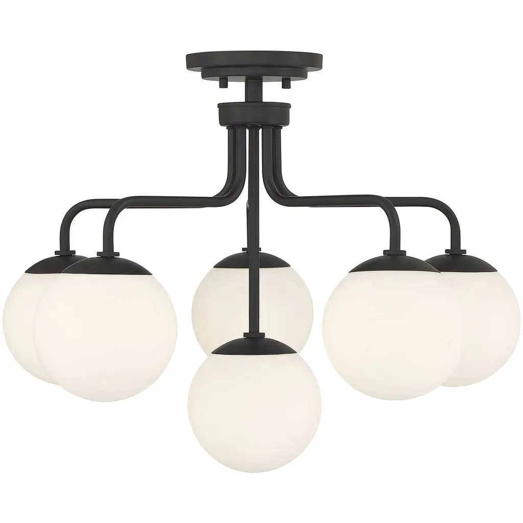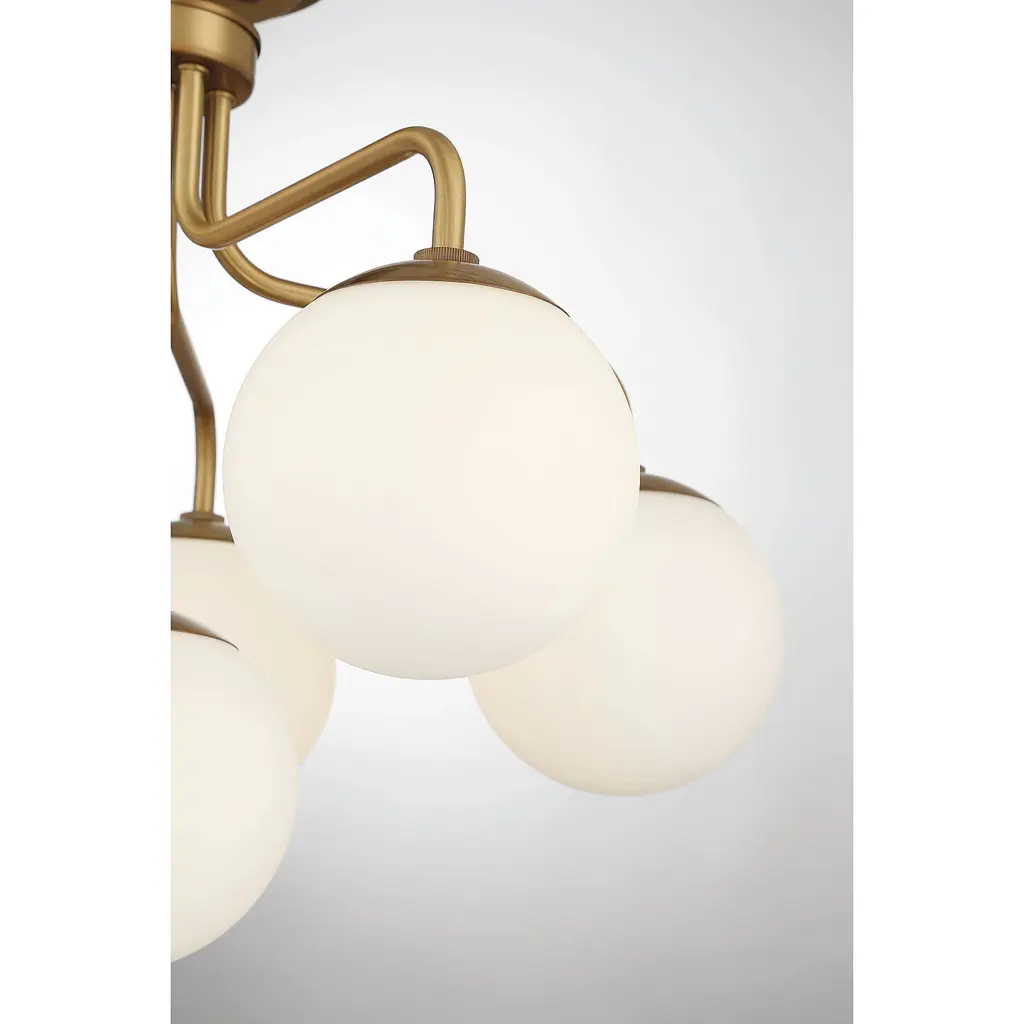 The Savoy House Marco 6-light ceiling light delivers a sleek lighting look that is inspired by midcentury modern style. A minimal design finished in warm brass keeps the focus on the light coming from shades of clear glass. Marco is 18.25" in height and 24" in width. It uses six candelabra size bulbs of up to 60 watts per bulb.