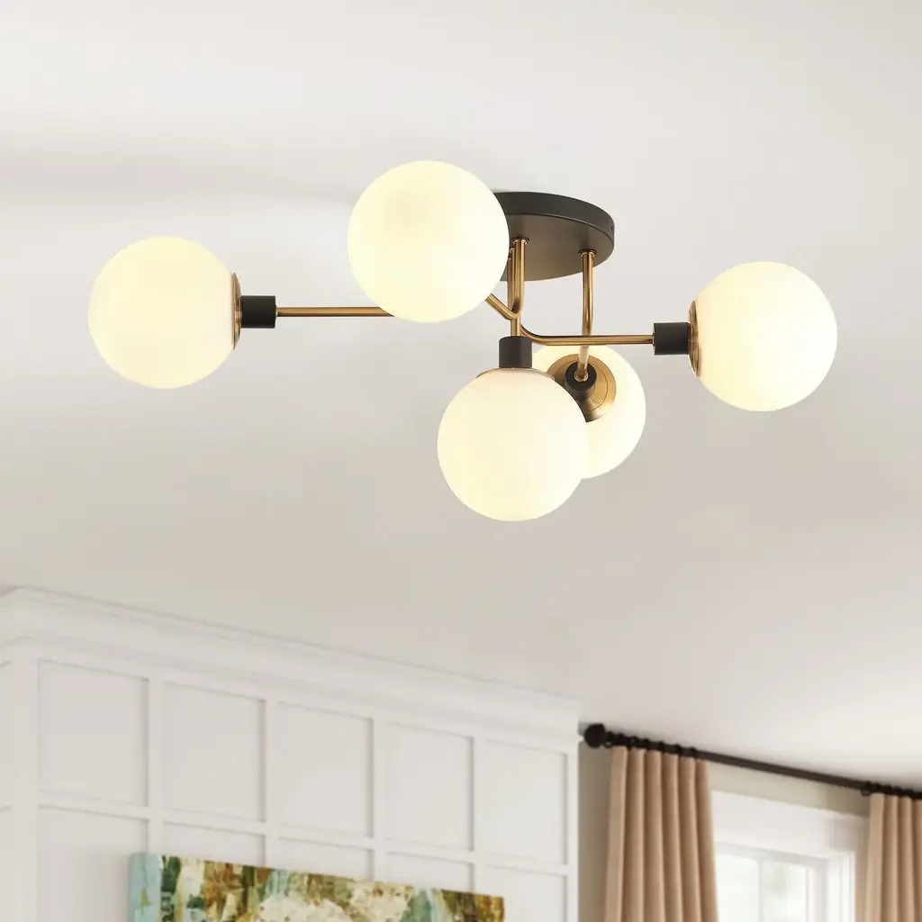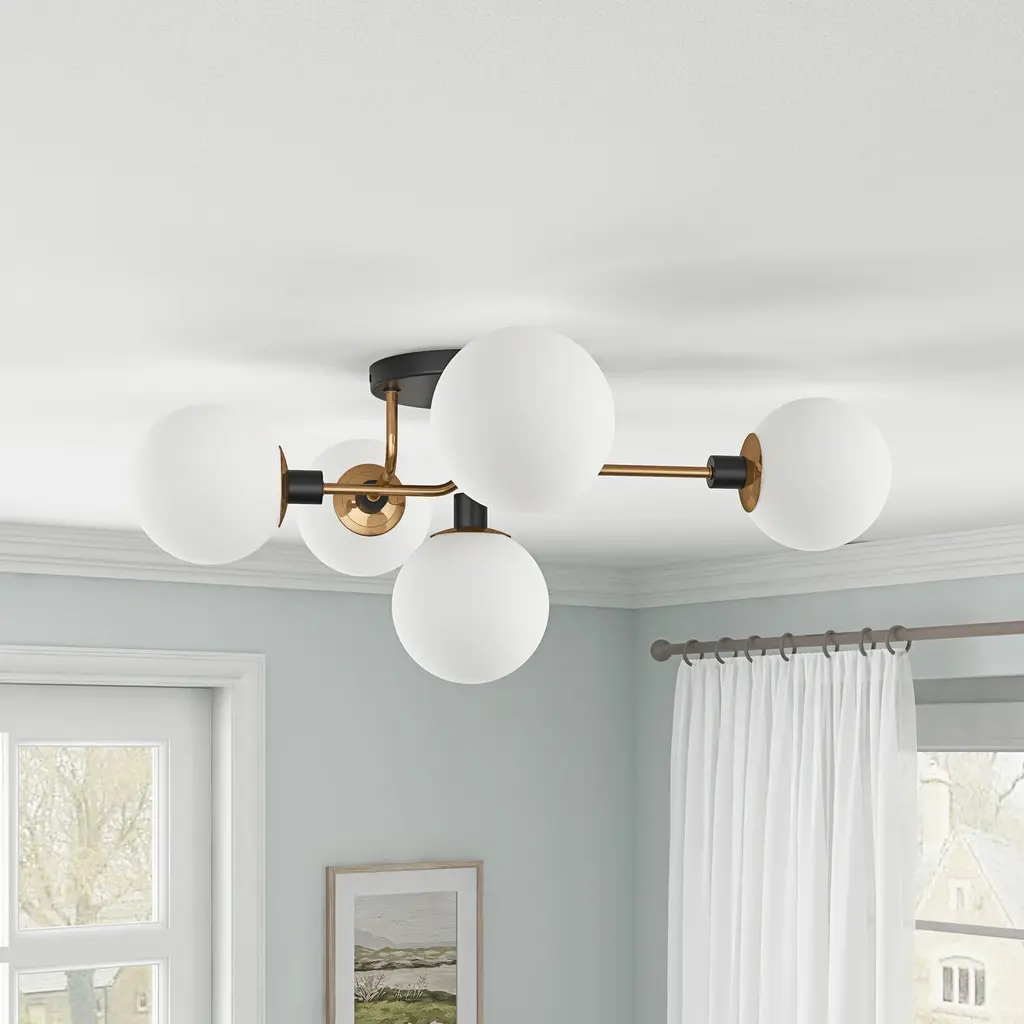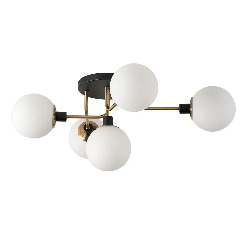 Matte Black 5-Light Semi Flush Mount Close To Ceiling Light With White Glass Shades - Black