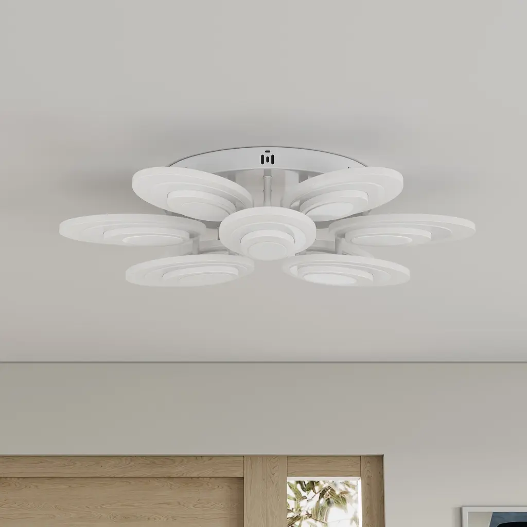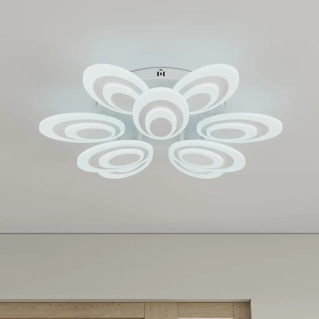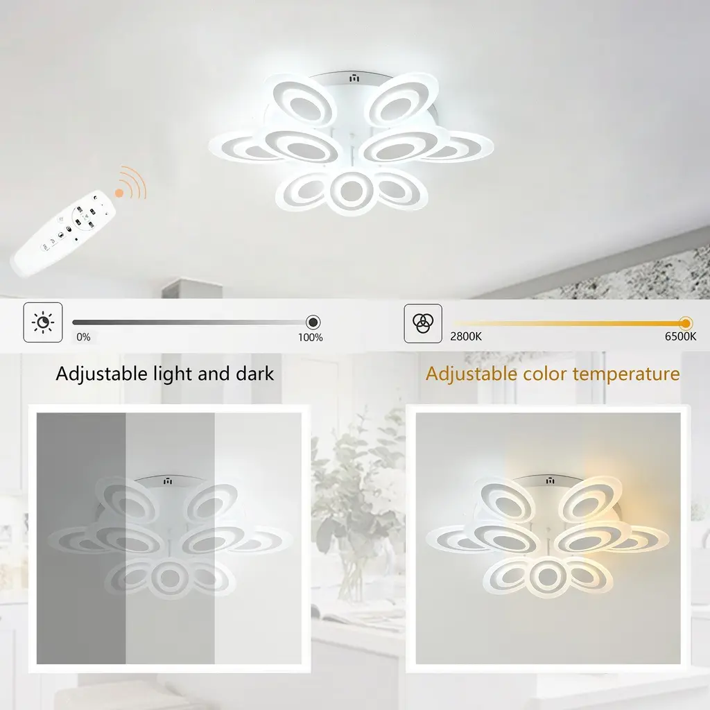 Specifications: Unique Design: The flush-mounted light has a design that resembles 7 petals, which gives off a stylish and sophisticated vibe in your household. The uncomplicated and sleek lines enhance its three-dimensional appearance. Ideal for use in various areas such as the bedroom, living room, kitchen, and apartment.Quality Assurance: High-quality metal and acrylic materials were used to craft the ceiling light. All products in the factory have to undergo rigorous safety monitoring, to ensure quality and safety, which is beautiful, corrosion-resistant, and durable for a long time.Easy to Assemble: There is no need to worry about the installation difficulty, to achieve installation quickly, all installation hardware and installation instructions are included in the package for you. If you have any problems please feel freely to contact us.Dimming with Remote: This lamp can adjust the light and dark and color temperatures (between 2800K to 6500K) altogether, a remote control will be come with to control it. Meantime, Ideal brightness of up to 3300 lumens which is bright enough for indoor use, it will perfectly meet your various needs.Perfect Decoration: This fresh and simplistic design is an elegant update for traditional and modern homes alike. Ideal for hallway, entryway, kitchen, bedroom, bathroom, dining room, living room, corridor, foyer, storage room, restaurant, cafe and bar.