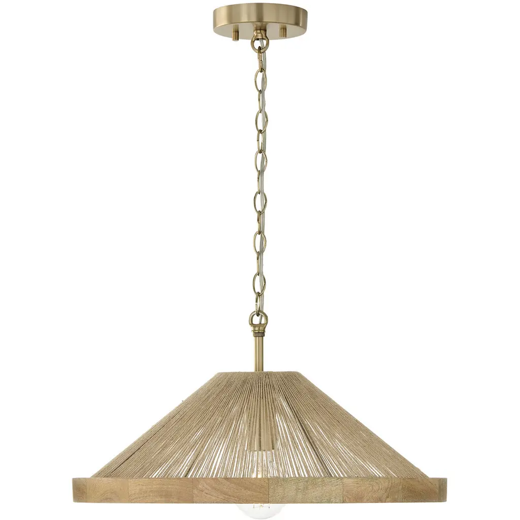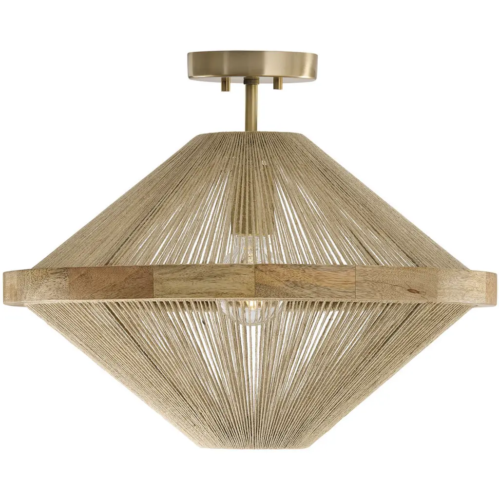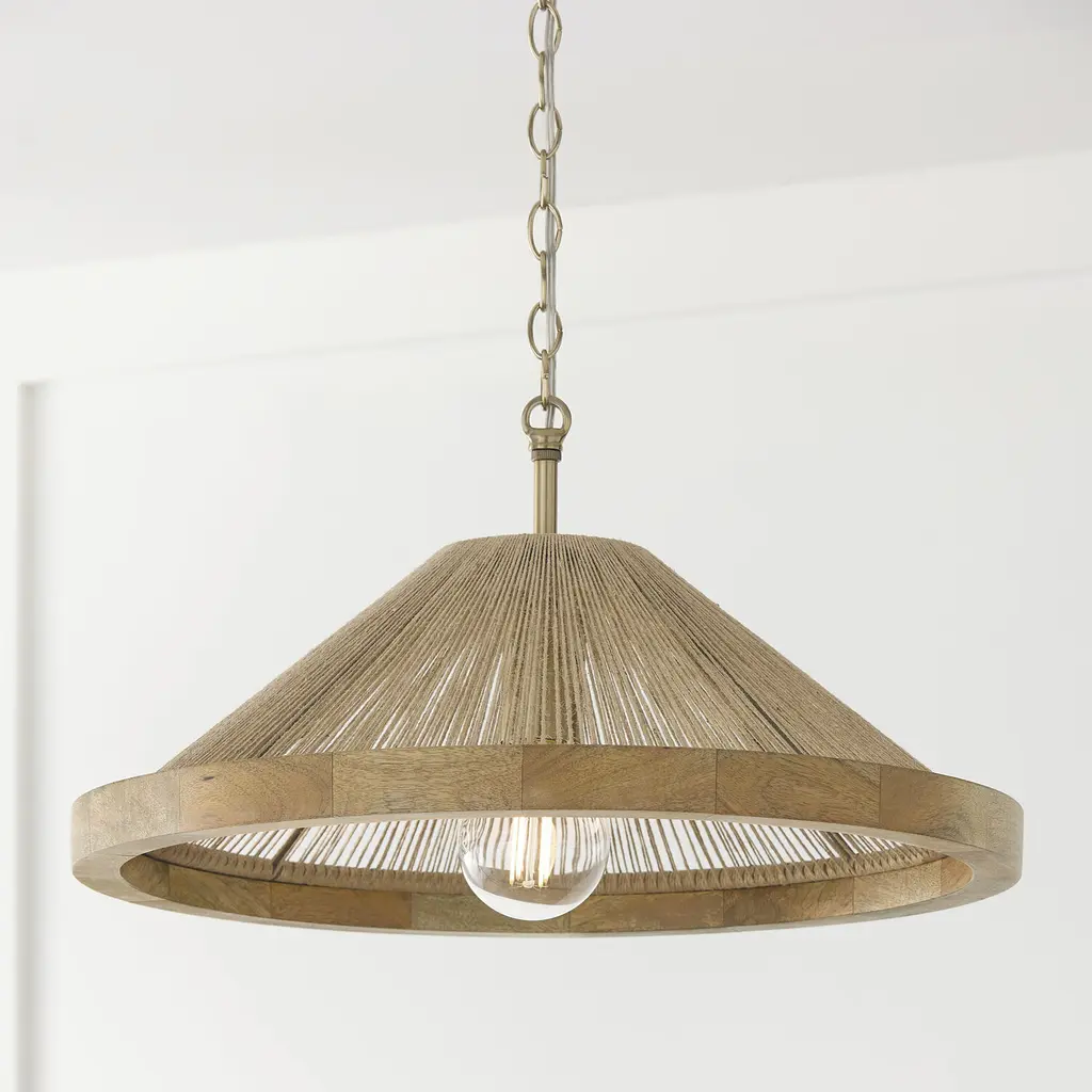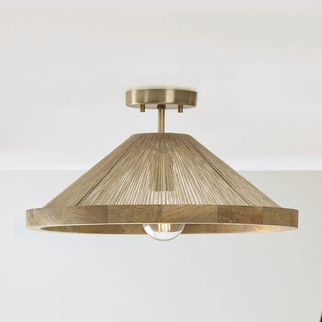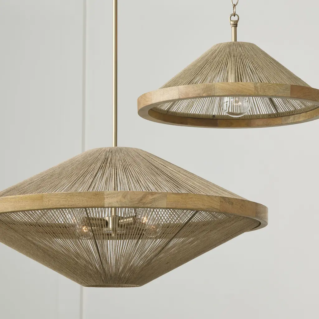 Earthy and elegant with a modern cone silhouette, the Maya Open Dual Mount Pendant uses natural materials to enhance any space. The combination of Light stained mango wood and hand-wrapped Natural Jute Rope creates high design with artisan appeal, while the Matte Brass finish adds a touch of shine. Can be hung as a pendant or a semi-flush.