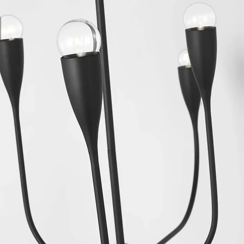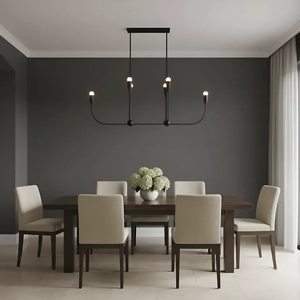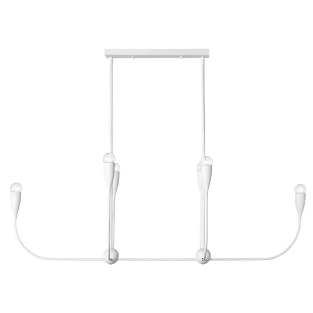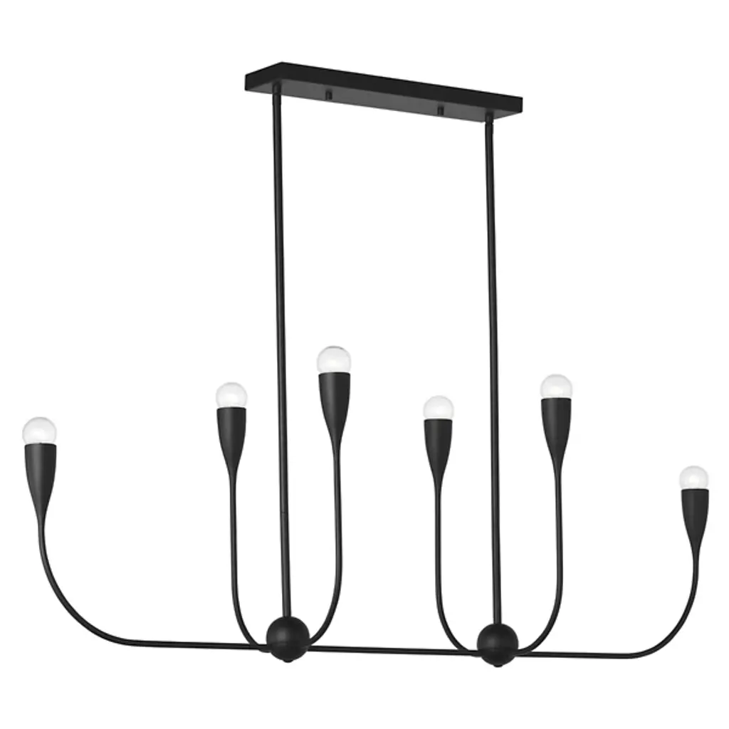 The Maya Linear Suspension from Generation Lighting features curved metal shades that cradle exposed bulbs in a linear arrangement. The flowing framework maintains the same sculptural character while creating broader illumination coverage suitable for dining areas or kitchen islands. This linear pendant brings substantial presence through its extended proportions and multiple light sources. The fixture accommodates clear bulbs that enhance the organic metal forms and offers brightness control through compatible dimming systems for varied atmospheric effects.