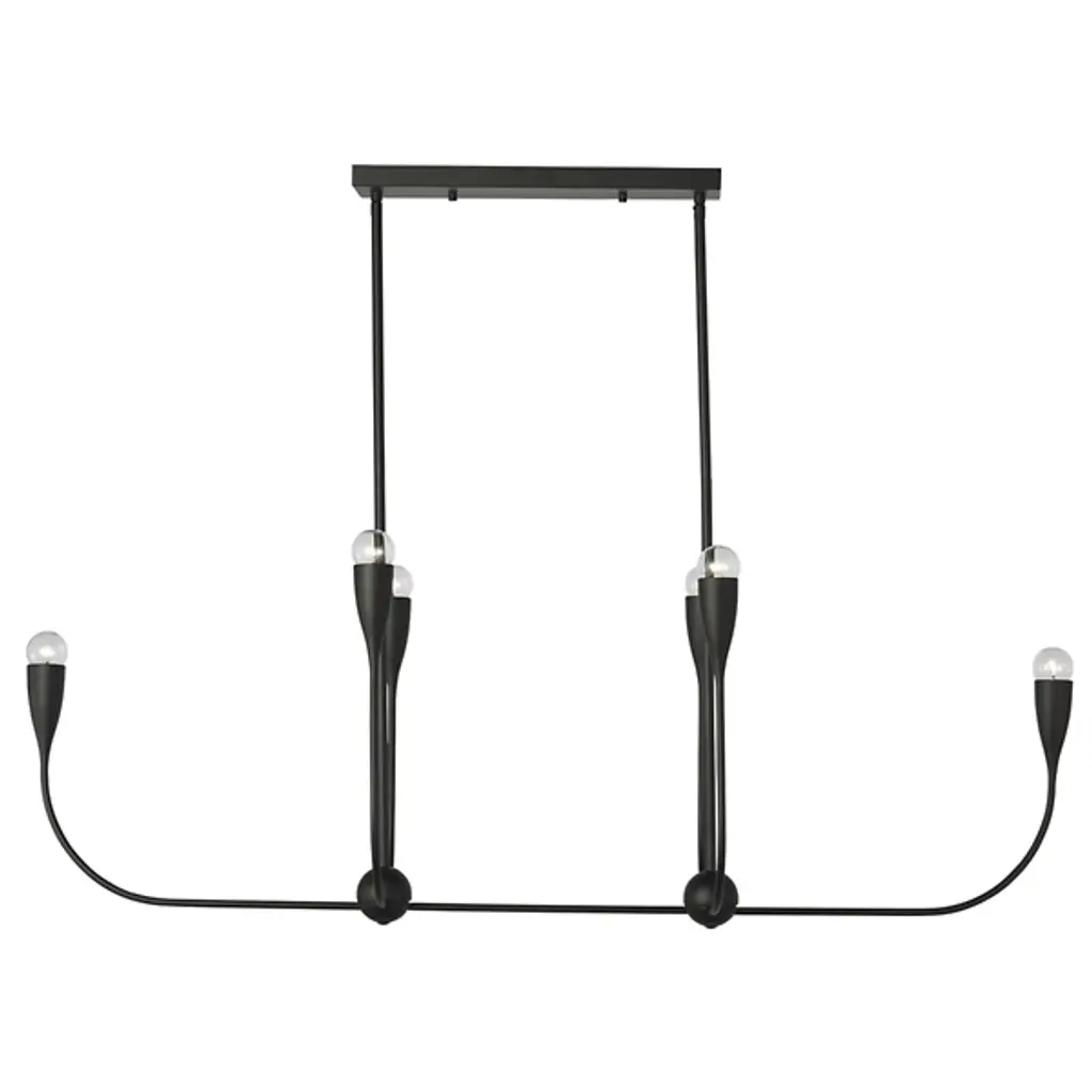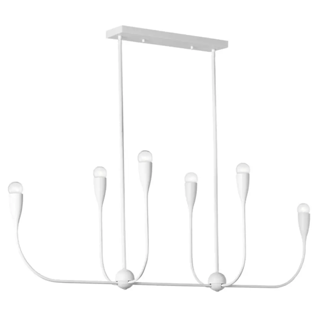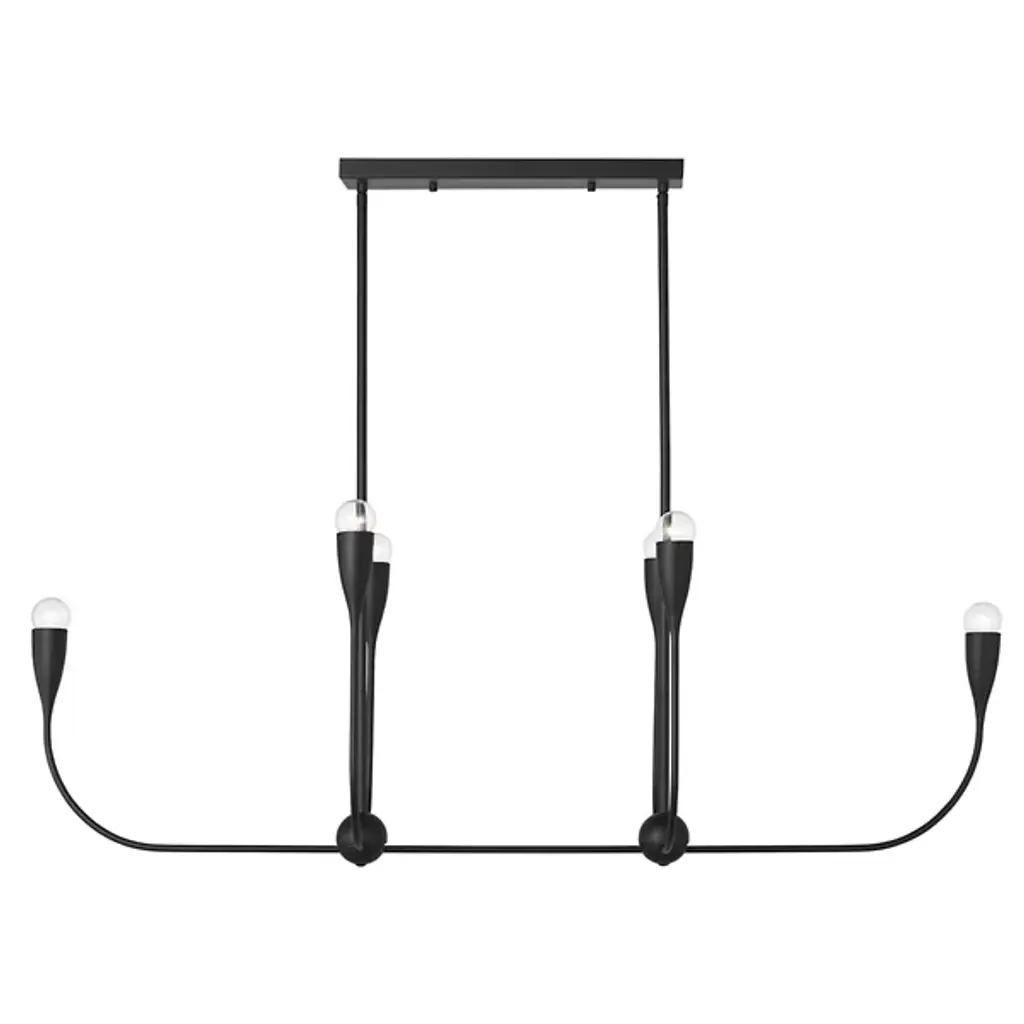 The Maya Linear Suspension from Generation Lighting features curved metal shades that cradle exposed bulbs in a linear arrangement. The flowing framework maintains the same sculptural character while creating broader illumination coverage suitable for dining areas or kitchen islands. This linear pendant brings substantial presence through its extended proportions and multiple light sources. The fixture accommodates clear bulbs that enhance the organic metal forms and offers brightness control through compatible dimming systems for varied atmospheric effects.