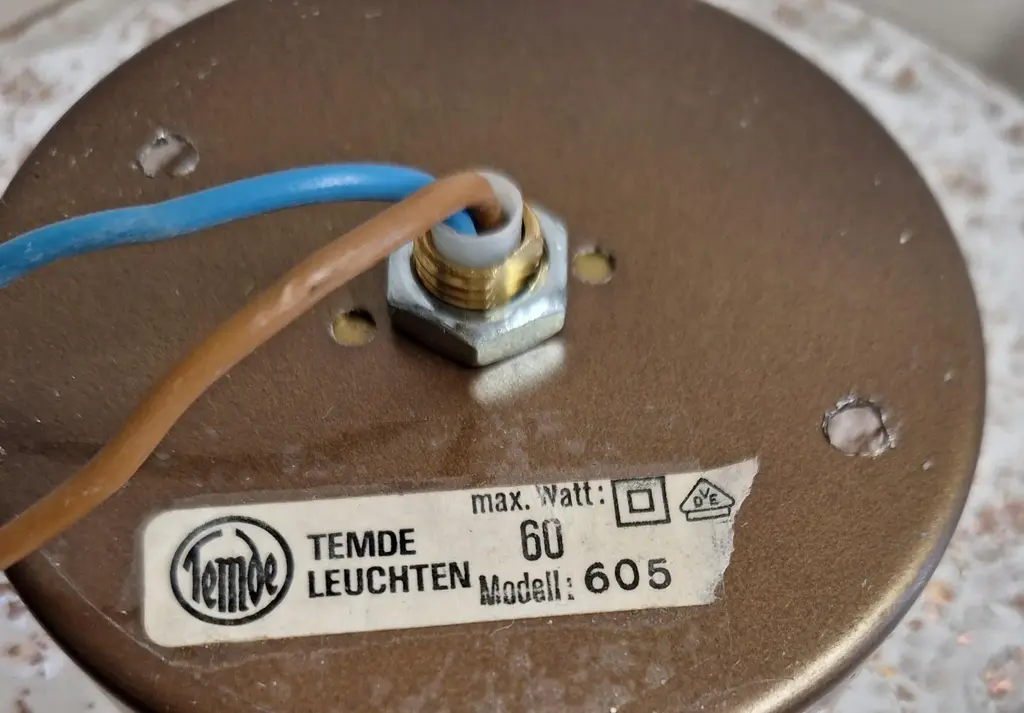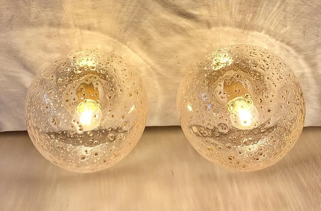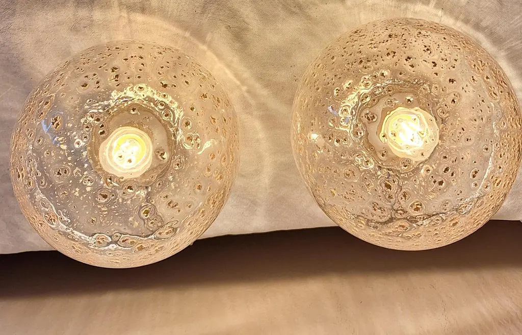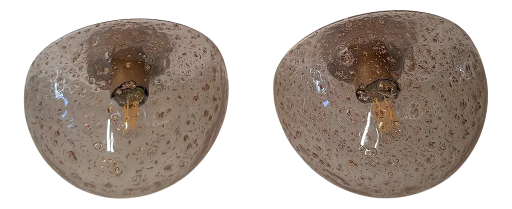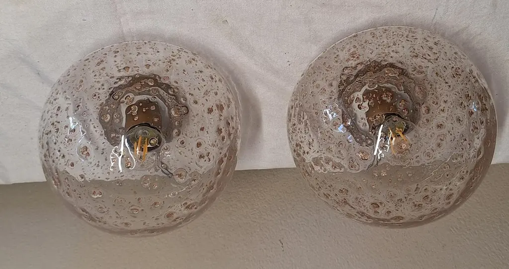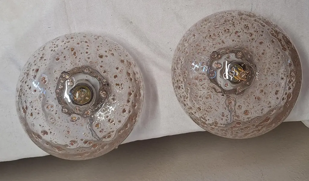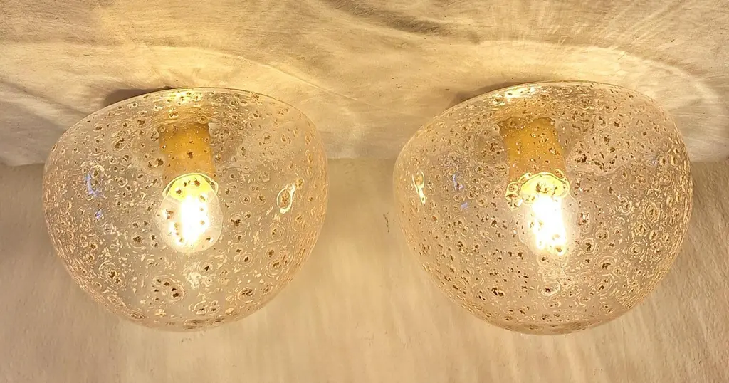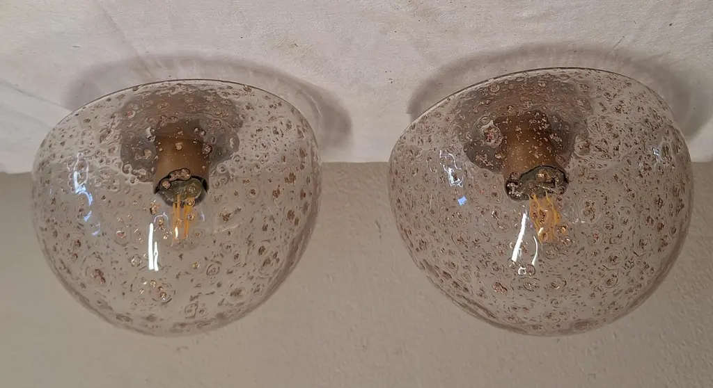 Metal Ceiling Lamps with Murano Glass and Gold Tinsel Shade from Temde, 1970s, Set of 2, in Very Good conditions. Designed 1970 to 1979 This piece has an attribution mark, I am sure that it is completely authentic and take full responsibility for any authenticity issues arising from misattribution, Up to 250V (Europe/UK Standard).The wiring of this item may be original and might need replacement, if not specified otherwise.