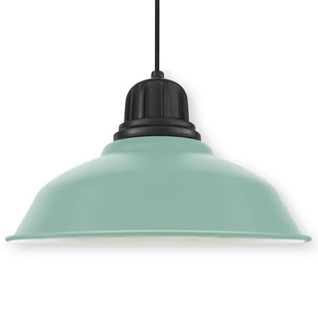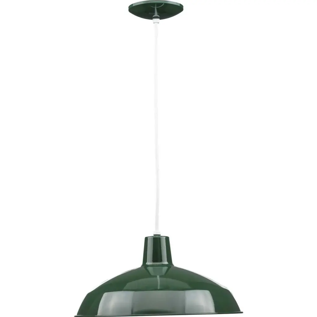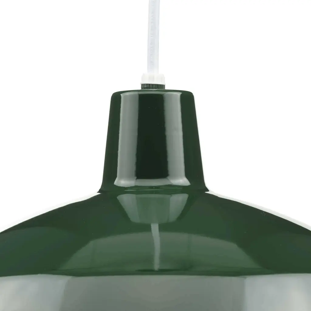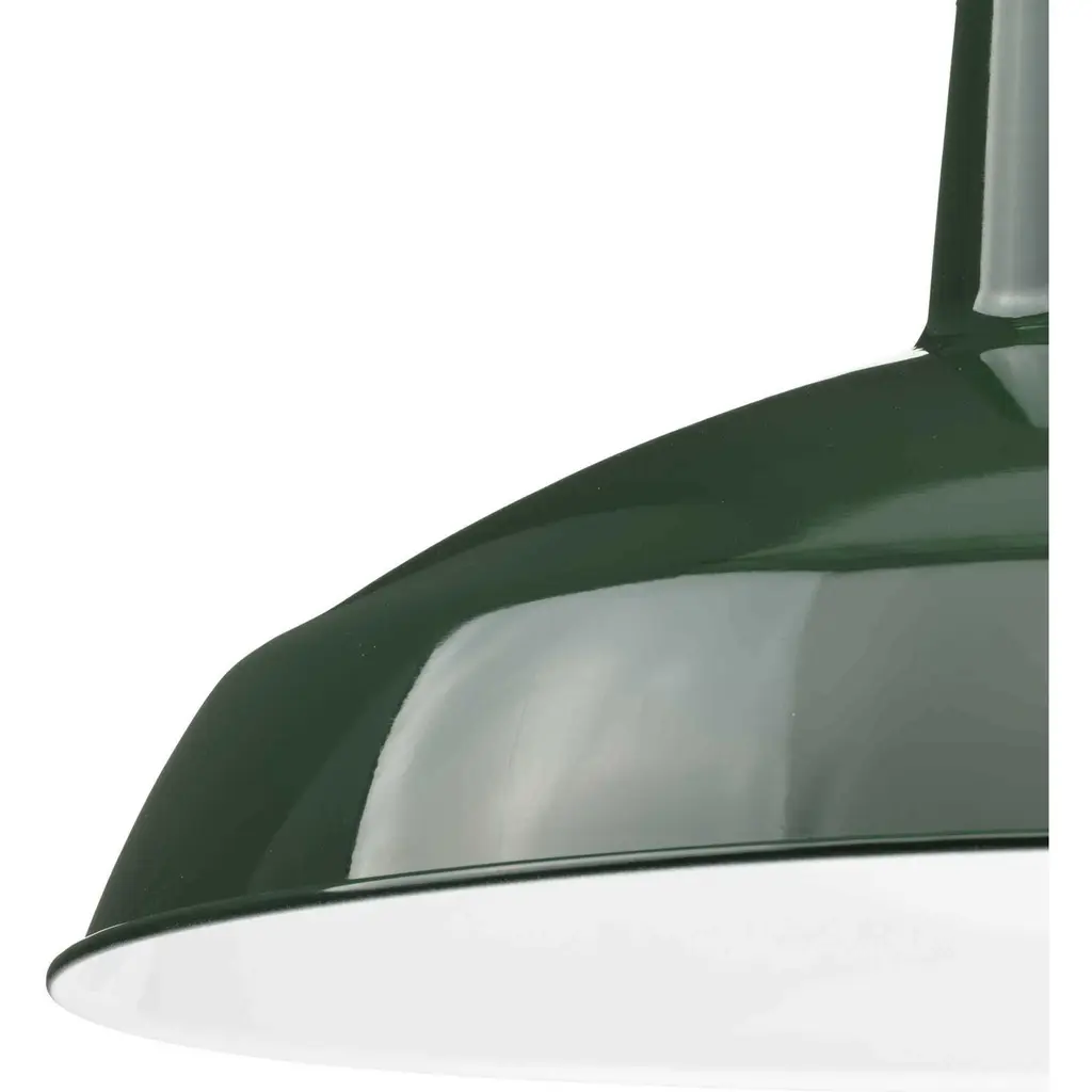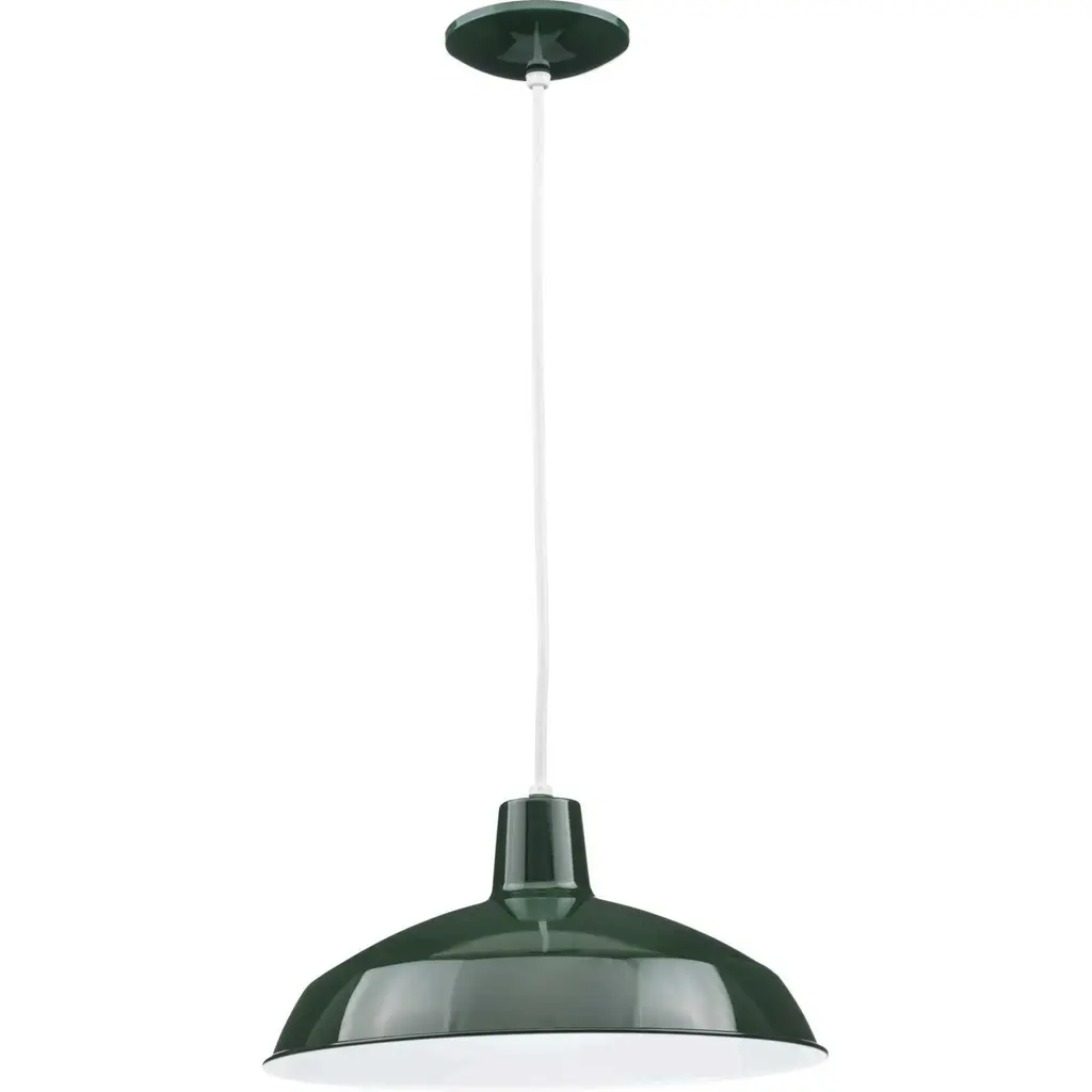 One-light industrial style warehouse cord-hung pendant with spun metal shade. Gloss white inside shade for reflectivity. 3 Conductor SVT white cord. Dark Green finish.