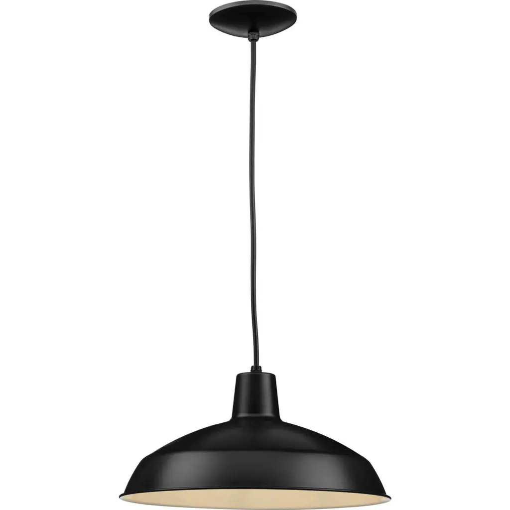 One-light industrial style warehouse cord-hung pendant with spun metal shade. Gloss white inside shade for reflectivity. 3 Conductor SVT black cord. Black finish.
