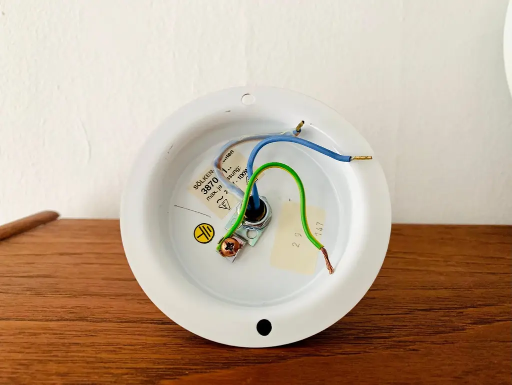 Very nice wall or ceiling lamp from the 1970s.Nice reduced design.Very high quality processing.Manufacturer: SoelkenCondition:Very good vintage condition with slight signs of wear consistent with age.Minimal signs of wear.The pictures are part of the description.If you have any further questions, I'm happy to help.1x E27/ E26 socket.Delivery without bulb.