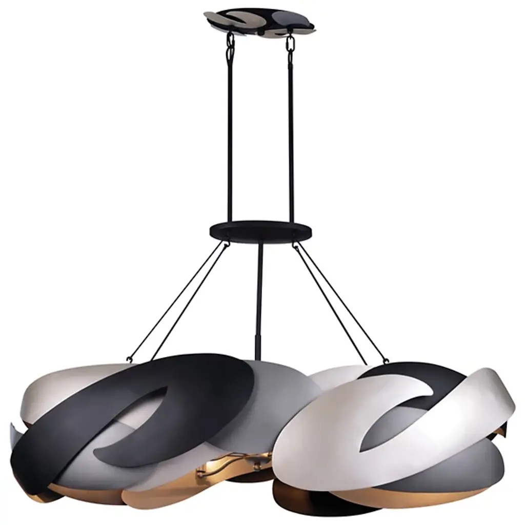 The Metalo Misto Linear Suspension from George Kovacs stretches the boundaries of linear lighting with its horizontally arranged steel panels that appear to swim through space. The elongated composition maintains perfect balance while suggesting constant motion. Light emerges from between the overlapping curved segments, creating patterns that shift depending on the viewing angle. The dimmable fixture provides gentle, inviting illumination, while the suspended design emphasizes the floating quality of the curved forms.