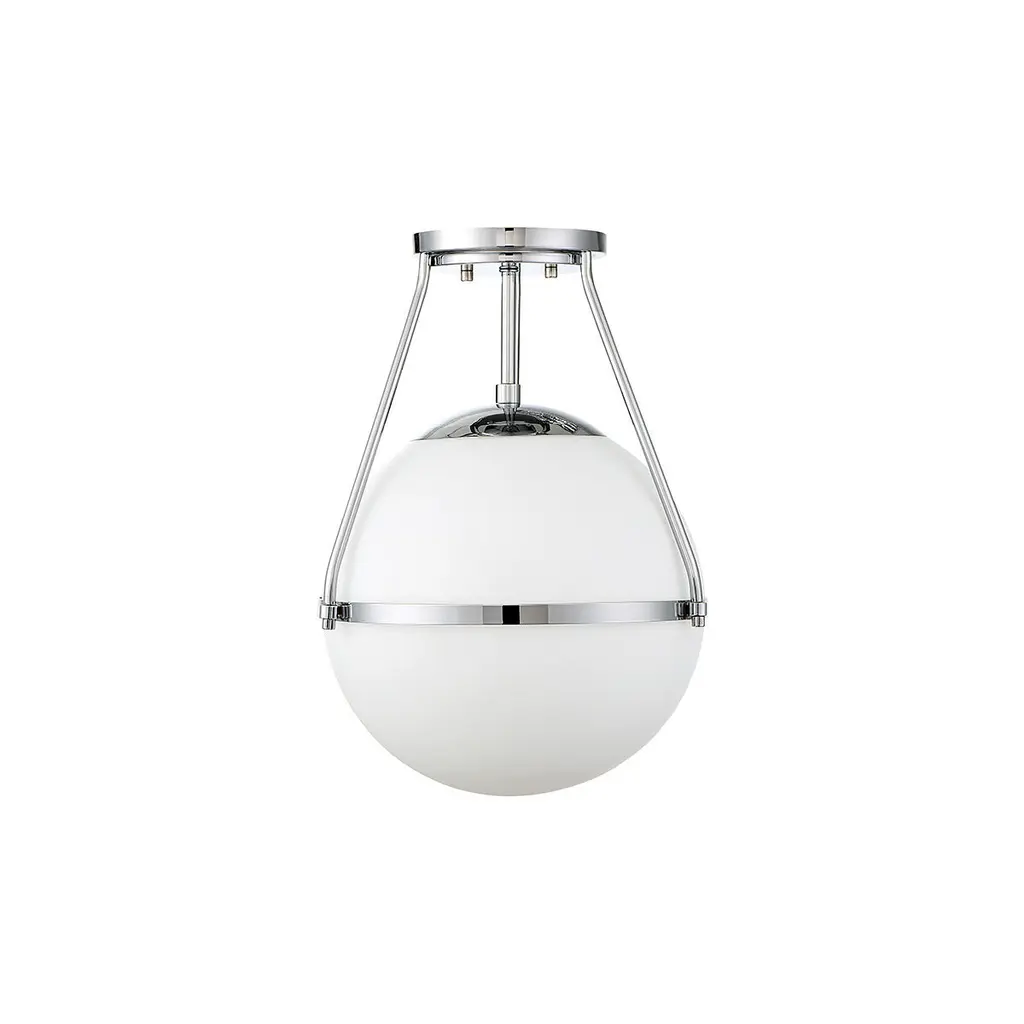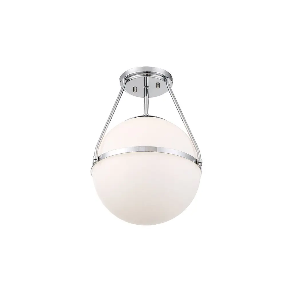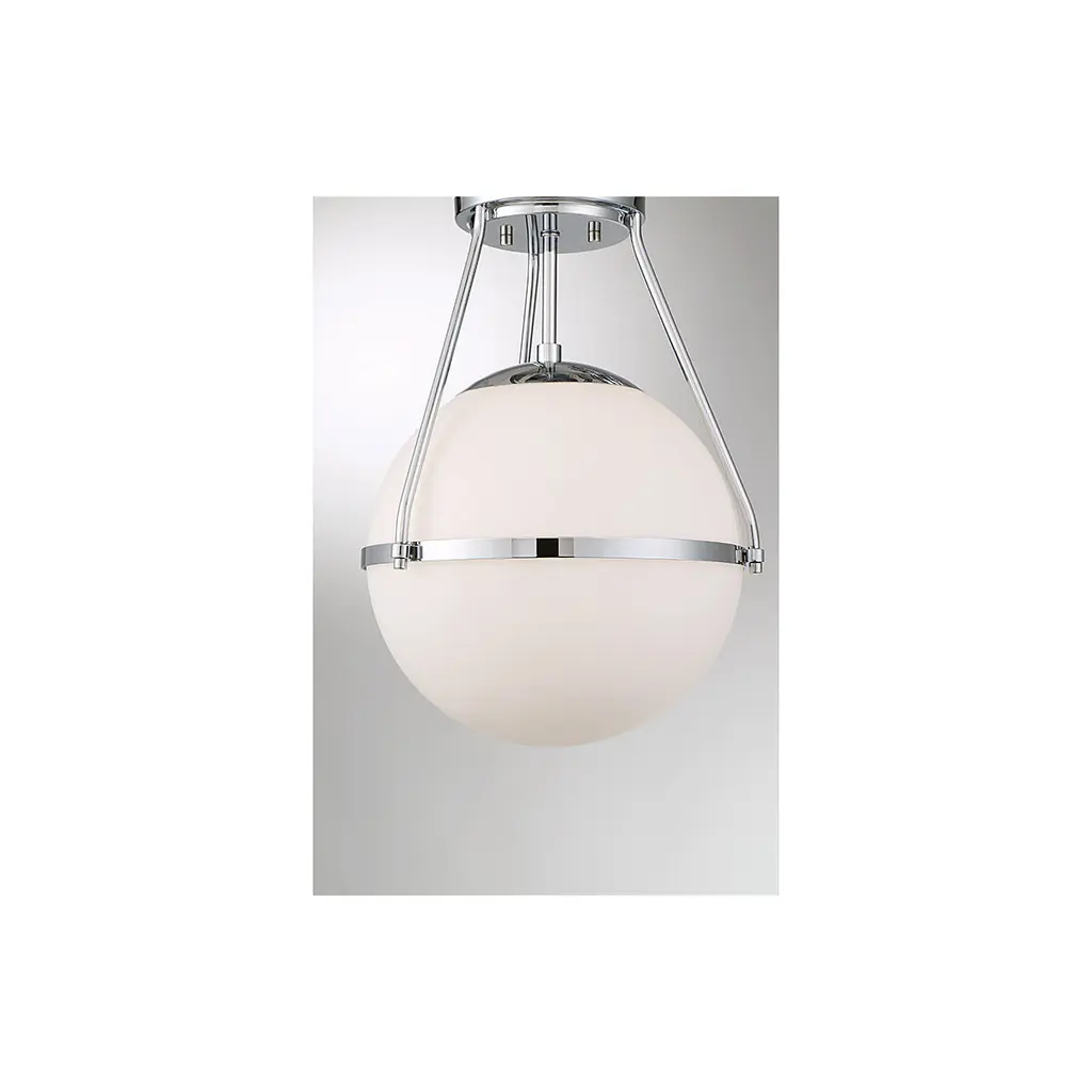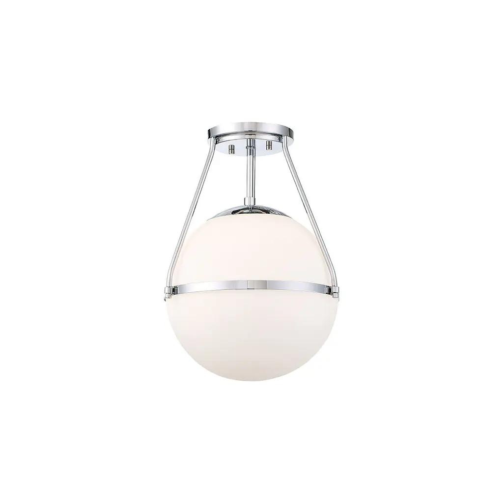 Find a gorgeous, retro-inspired glow with this 1-light ceiling semi-flush mount light. Its orb shade of white opal glass wears a thin metal band accent perfectly to add another little touch of style. Chrome finish. 17.13" in height and 13.25" in width.