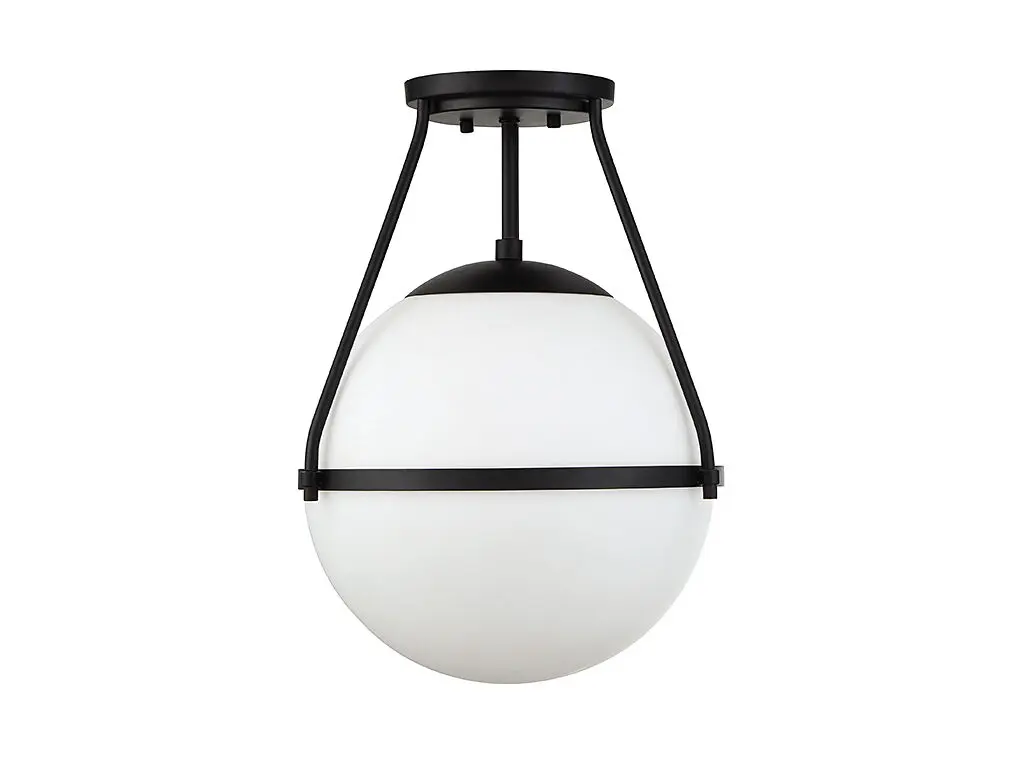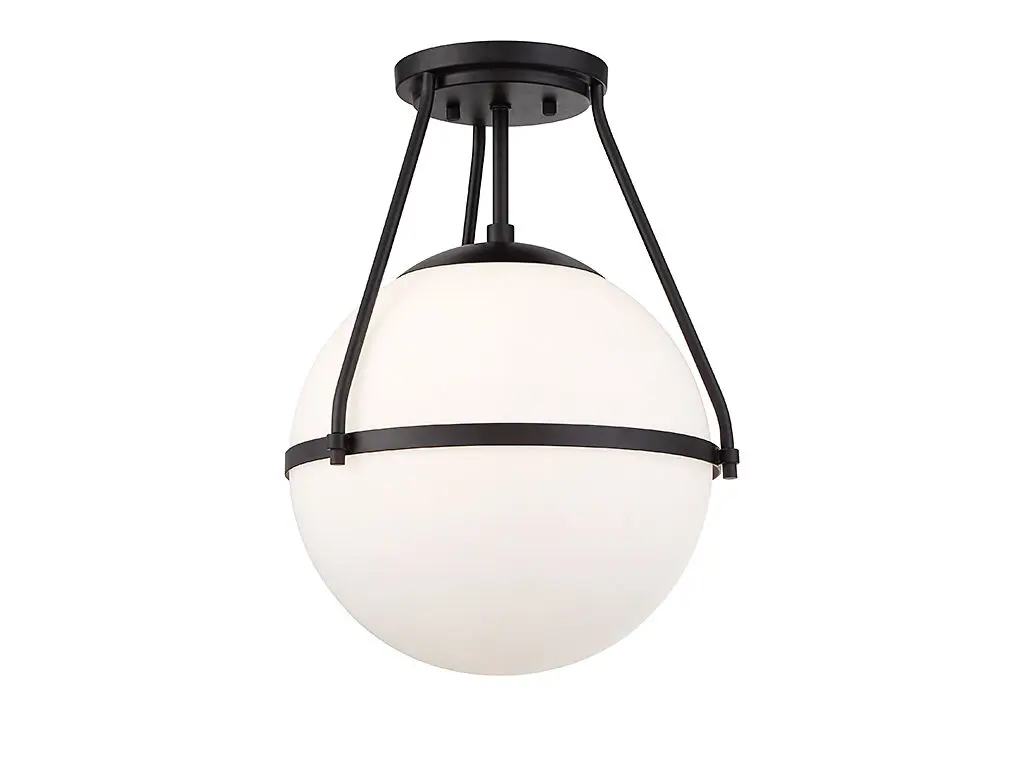 Find a gorgeous, retro-inspired glow with this 1-light ceiling semi-flush mount light. Its orb shade of white opal glass wears a thin metal band accent perfectly to add another little touch of style. Matte black finish. 17.13" in height and 13.25" in width.