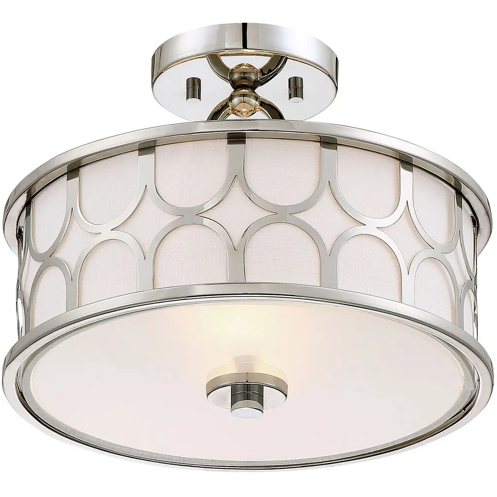 This 2-light ceiling semi-flush mount will add lots of style and useful light to any room It flaunts a geometric pattern with mid-century inspiration and a crisp white fabric shade. Polished Nickel finish. 10" in height and 13" in width.