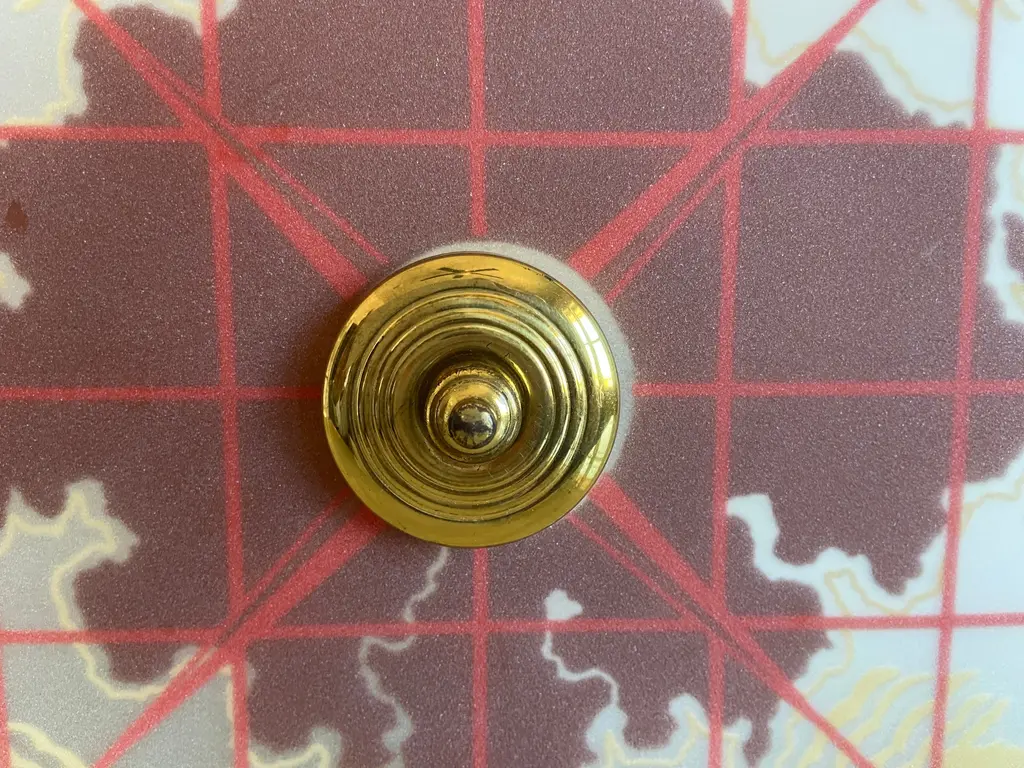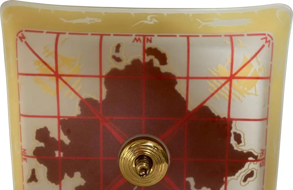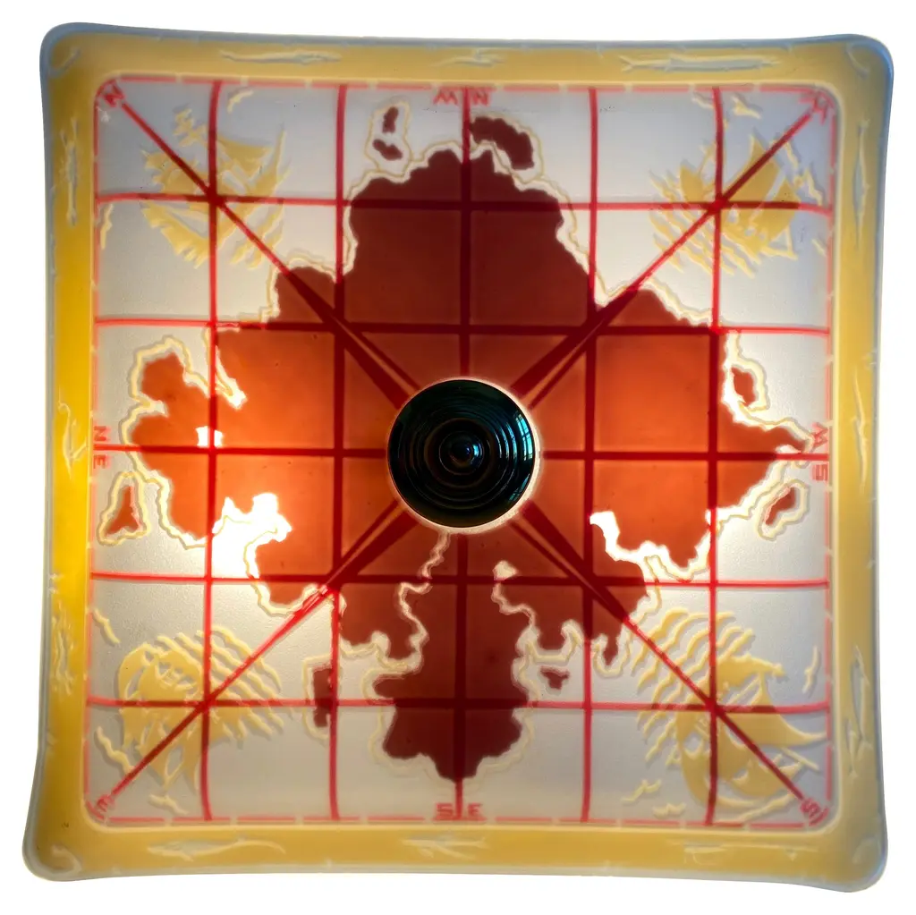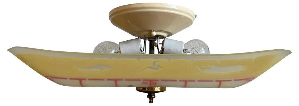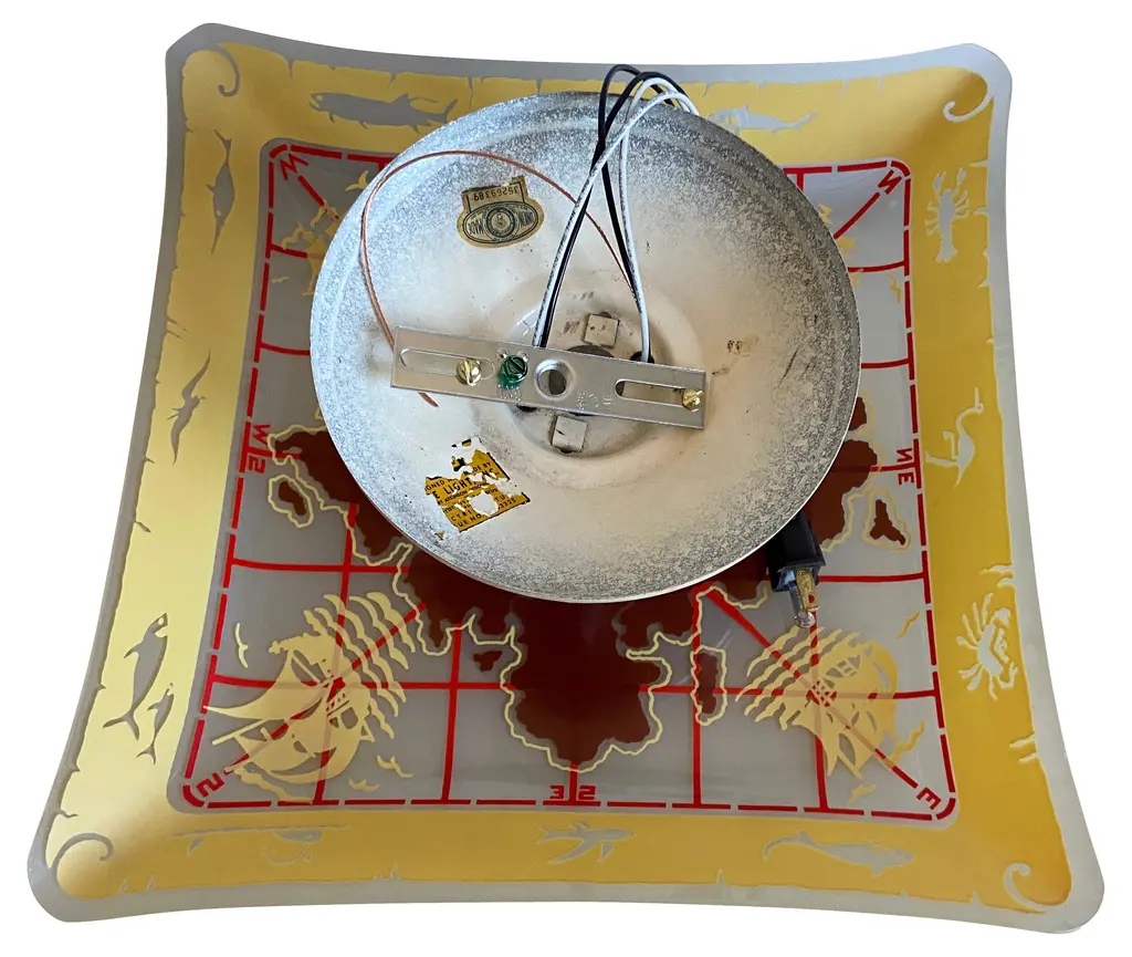 Midcentury nautical semi-flush mount light by Moe featuring a textured rounded square glass shade accented with a reverse-painted marine life border, sailing ships and compass points surrounding a central island map with two lights. Newly wired with new porcelain sockets for standard bulbs. Comes ready to install with original labeled mounting plate and new mounting hardware. Light patina, edge chip pictured.