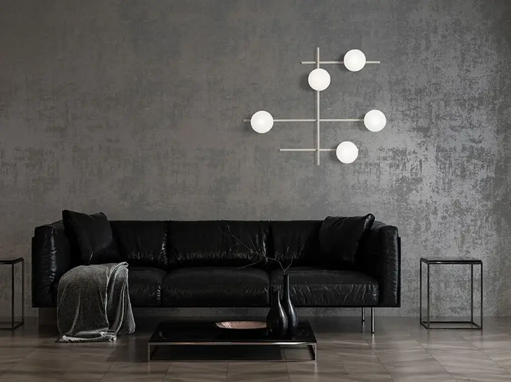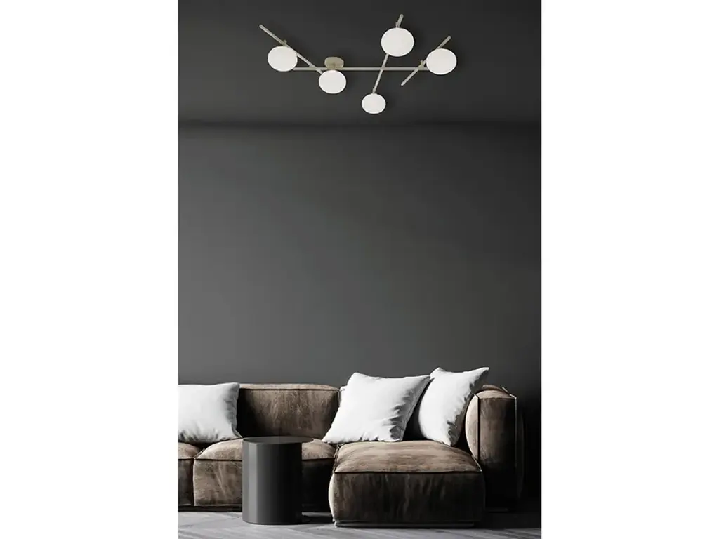 Wall or ceiling lamp from the MIKADO collection with matt powder-coated powder-coated metal frame. Milk-white blown glass diffuser diameter 14 cm. The rotation of the secondary arm allows to choose the preferred position.Light source: G9, Wattage: 5x10W LEDCompositional flexibility. MIKADO embodies the very essence of expressive and creative freedom: the ability to orient the rods at will allows the creation of orthogonal or dynamic geometries, exploring more rigid or more fluid solutions. The balance between the painted metal structure and the diffusers is completely disengaged from any formal constraints. This extreme autonomy is the reason why MIKADO was awarded the Good Design Award.