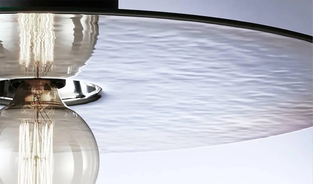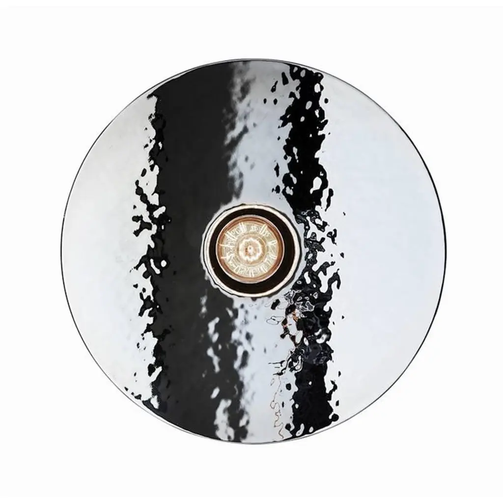 Silver thermoformed glass (also available in gold) mounted on a base available in lacquered black metal or solid oak.Can be used as a wall or ceiling light.Handmade in Europe Available in two sizes:Large 27.6 in diameter x 5.9 in deepMedium 15.75 in diameter x 5.9 in deep.