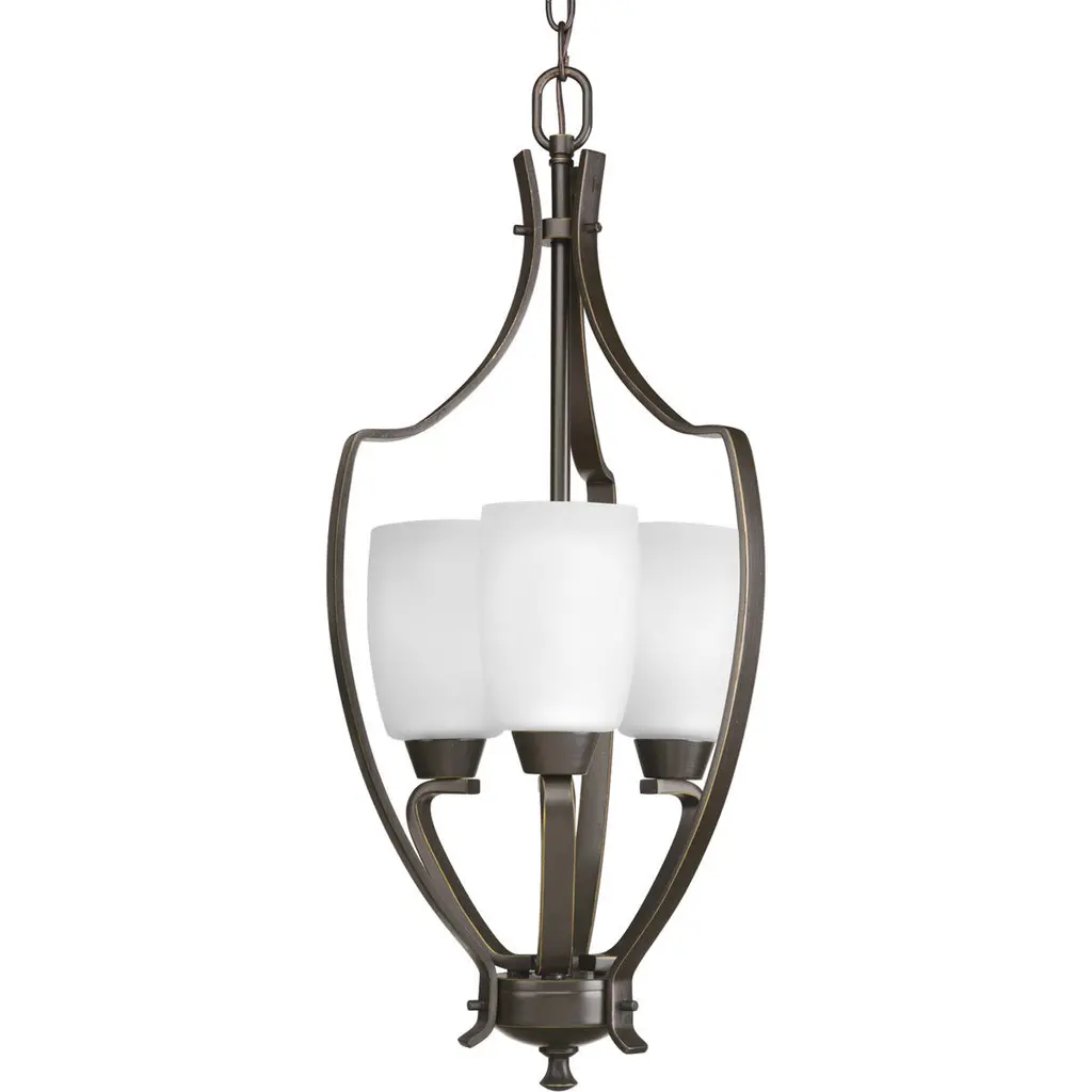 Three-light foyer with etched glass and arching rectangular arms with strap accents.