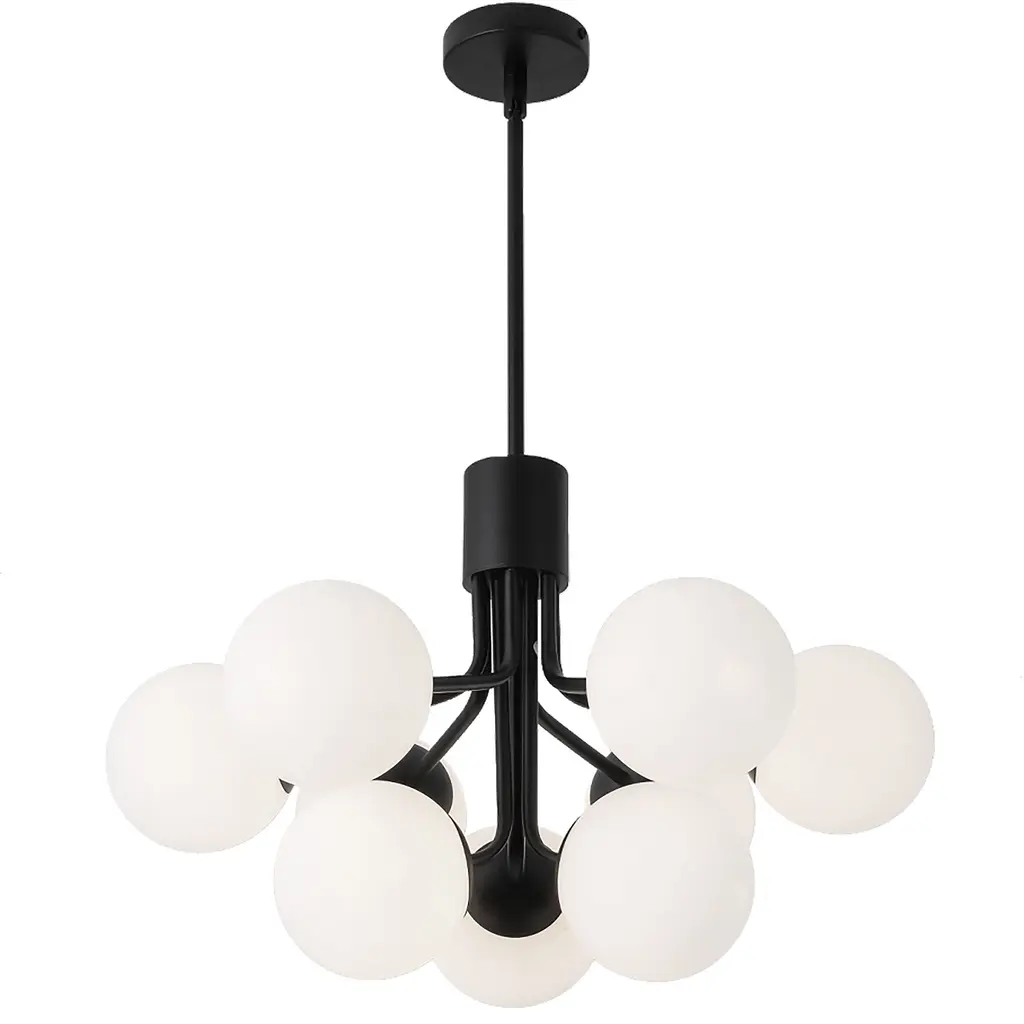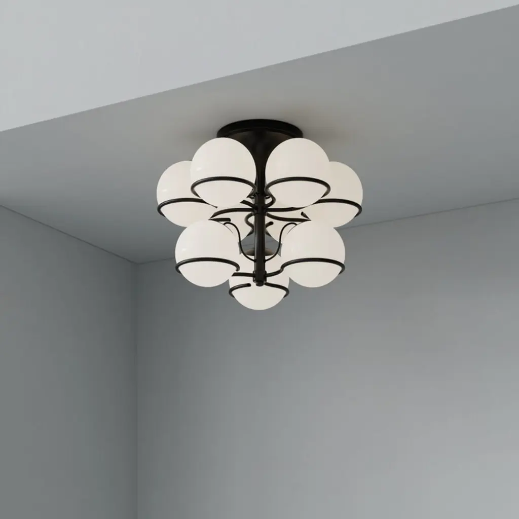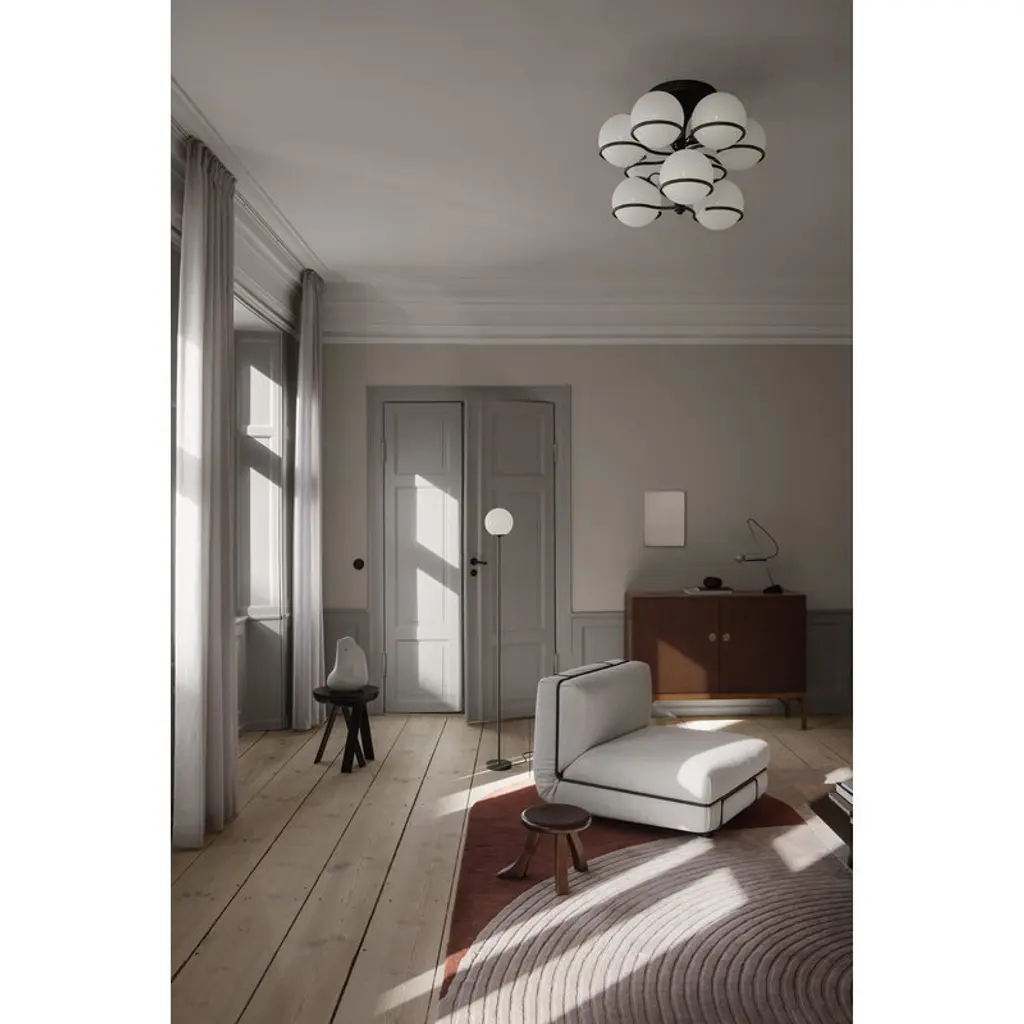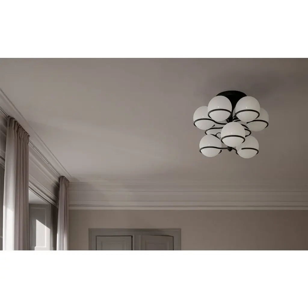 The Model 2042/9 ceiling lamp by the lighting brand Astep comprises 9 round opal glass diffusers with steel ring structures. You can place the glass spheres on the rings either way around and thus alter the lamp's look and intensity of light. The bold yet streamlined Model 2042 will find its place in many kinds of spaces, be it a living room, hallway, kitchen or bedroom. The Model 2042 ceiling light is part of the Le Sfere collection created by the legendary Italian lighting designer Gino Sarfatti in 1959. Sarfatti sought inspiration for his work from natural light and the sky, and the lamps of the Le Sfere collection were influenced by the soft light and round shape of the Moon. The collection consists of a diverse range of luminaires that all have two things in common: white light diffused through opal glass and a modern, graphic touch of the metal rings. The Le Sfere lamps are made in Italy and are equally well suited for private and public spaces.