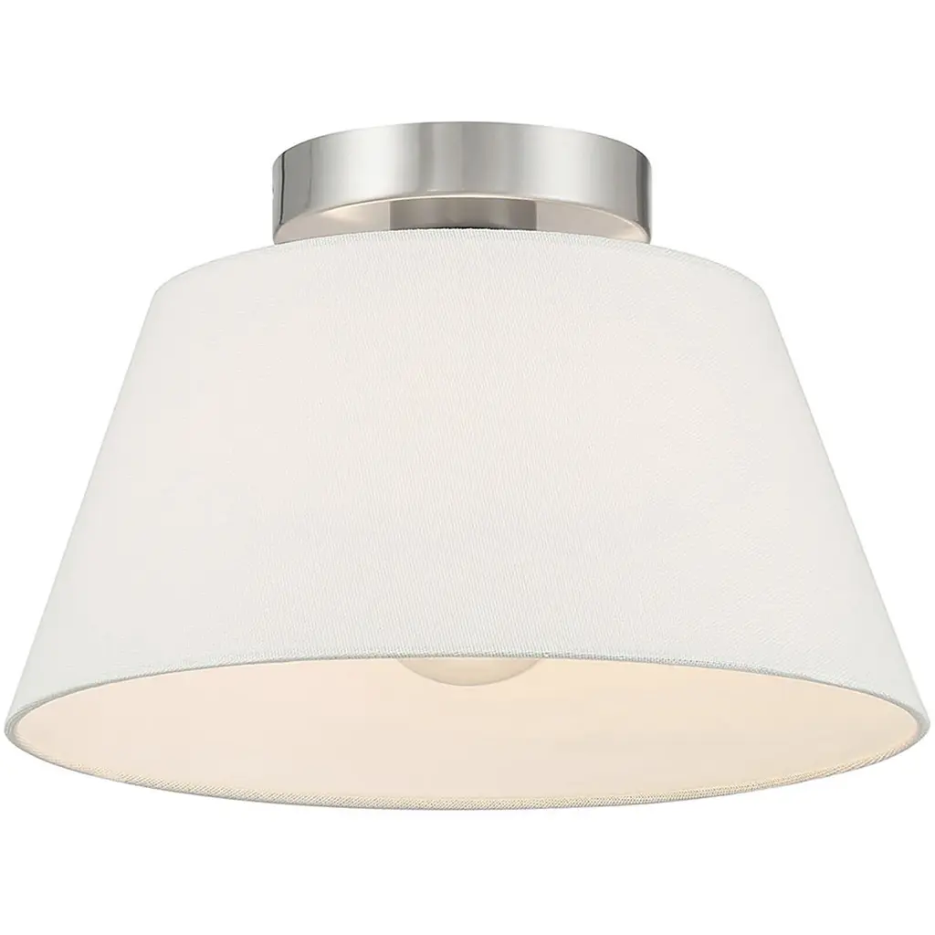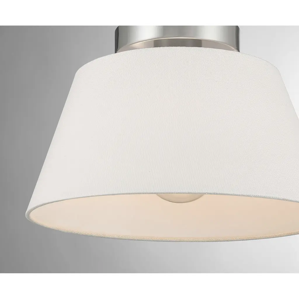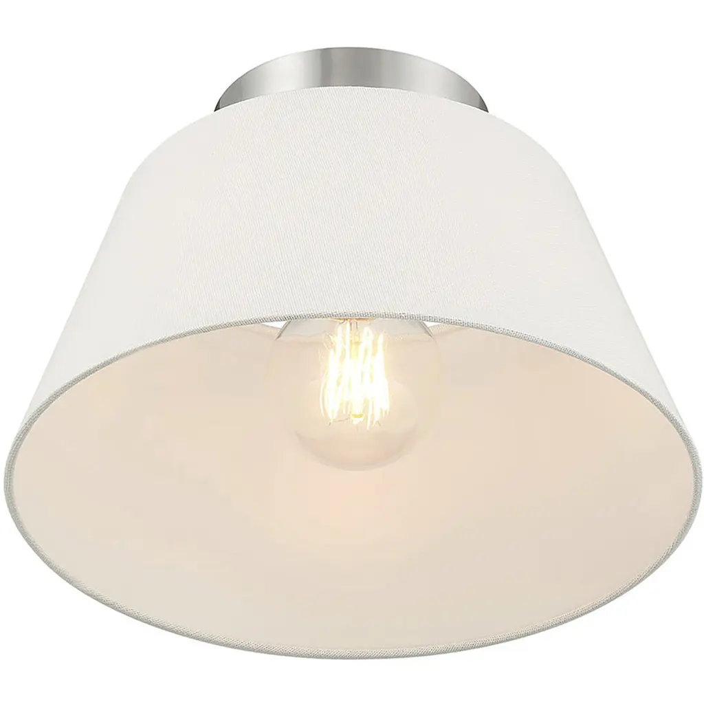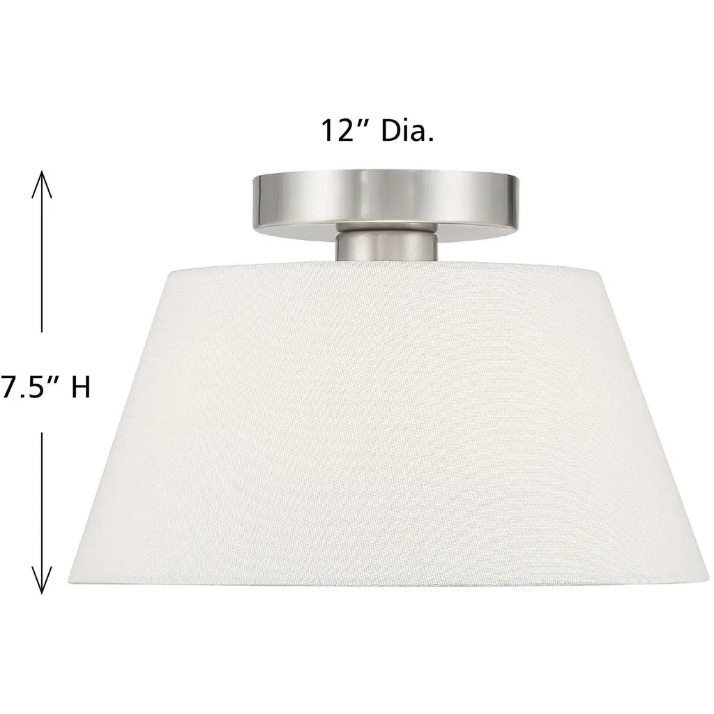 Use this 3-light ceiling semi-flush mount to freshen up any room. The elegant white linen shade provides a crisp and classic look that works beautifully with any decor and style. The Brushed Nickel finish is wonderfully versatile. 7.5" height, 12" width. Uses 1 standard size bulb of up to 60 watts. Bulb not included.