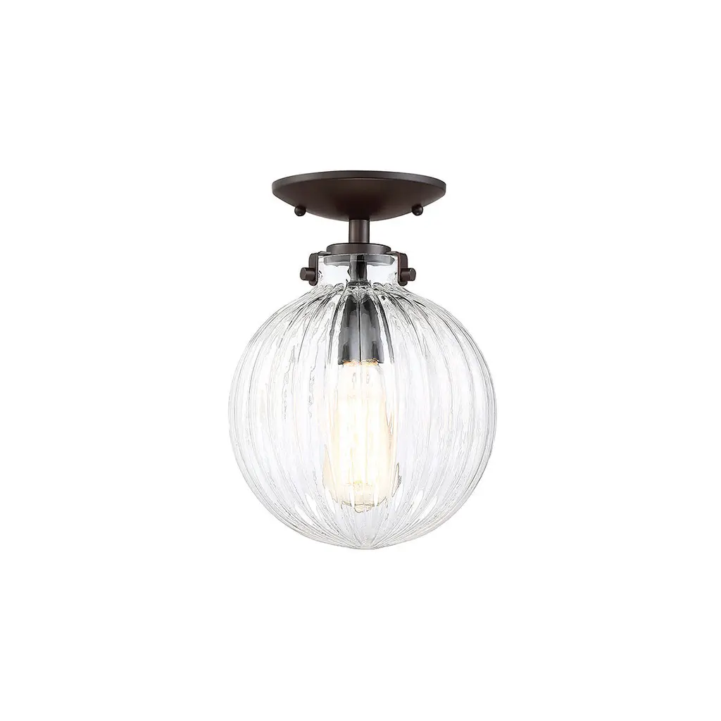 This 1-light ceiling semi-flush mount showcases an intriguing vintage-inspired look that is perfect for today's homes. Its orb-shaped ribbed clear glass shade brings eye-catching texture to go with the oil rubbed bronze finish. 11" in height and 8" in width.