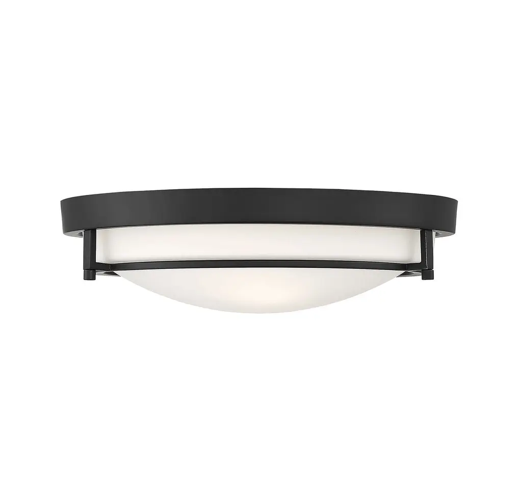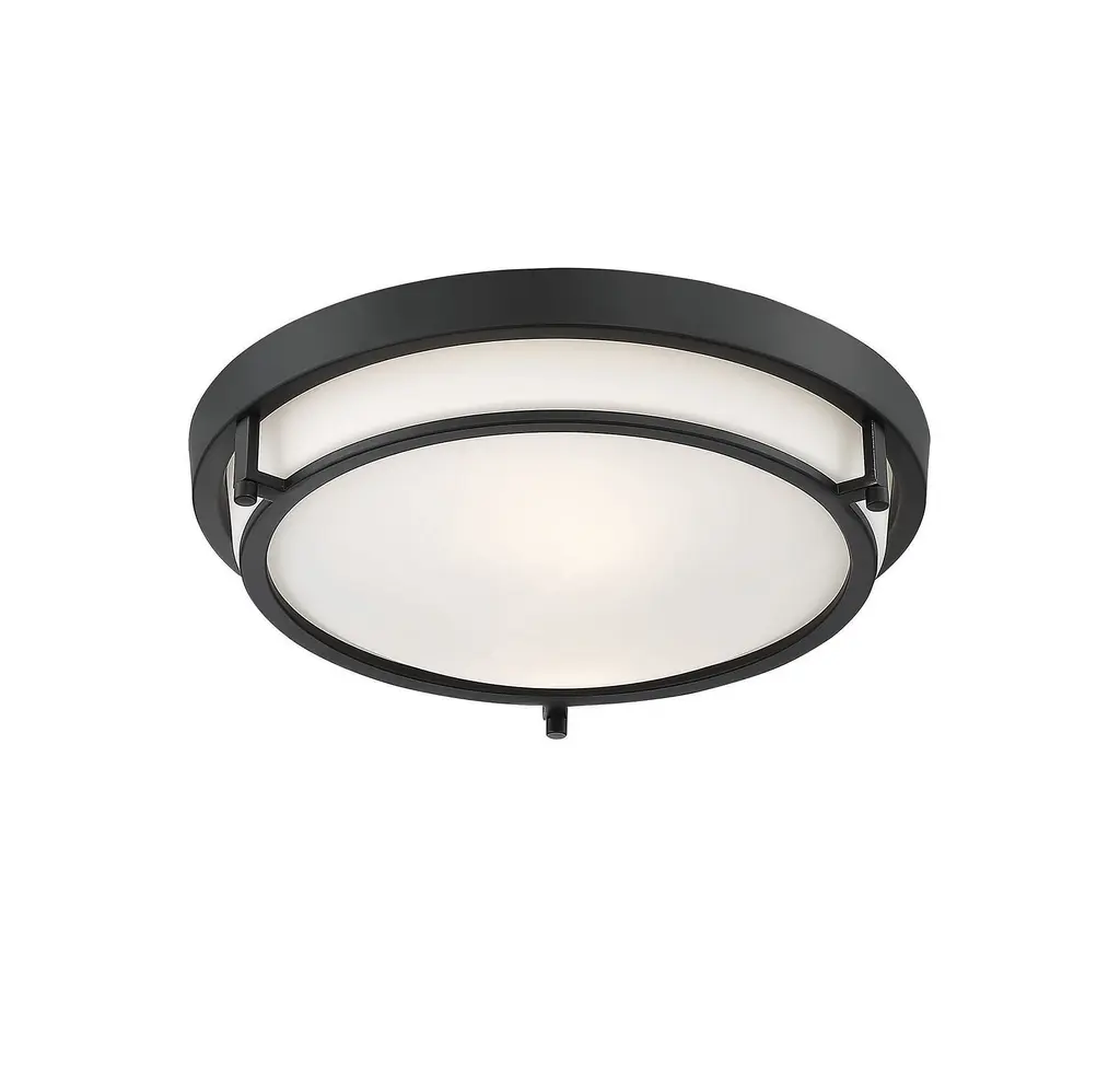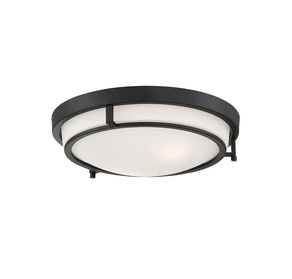 This slim and sleek 2-light ceiling flush mount offers a white glass shade and Matte Black finish to beautify any room. It is 4" in height and 13" in width. This light uses 2 standard size bulbs with a maximum of 60 watts per bulb, is LED compatible and is dimmable.