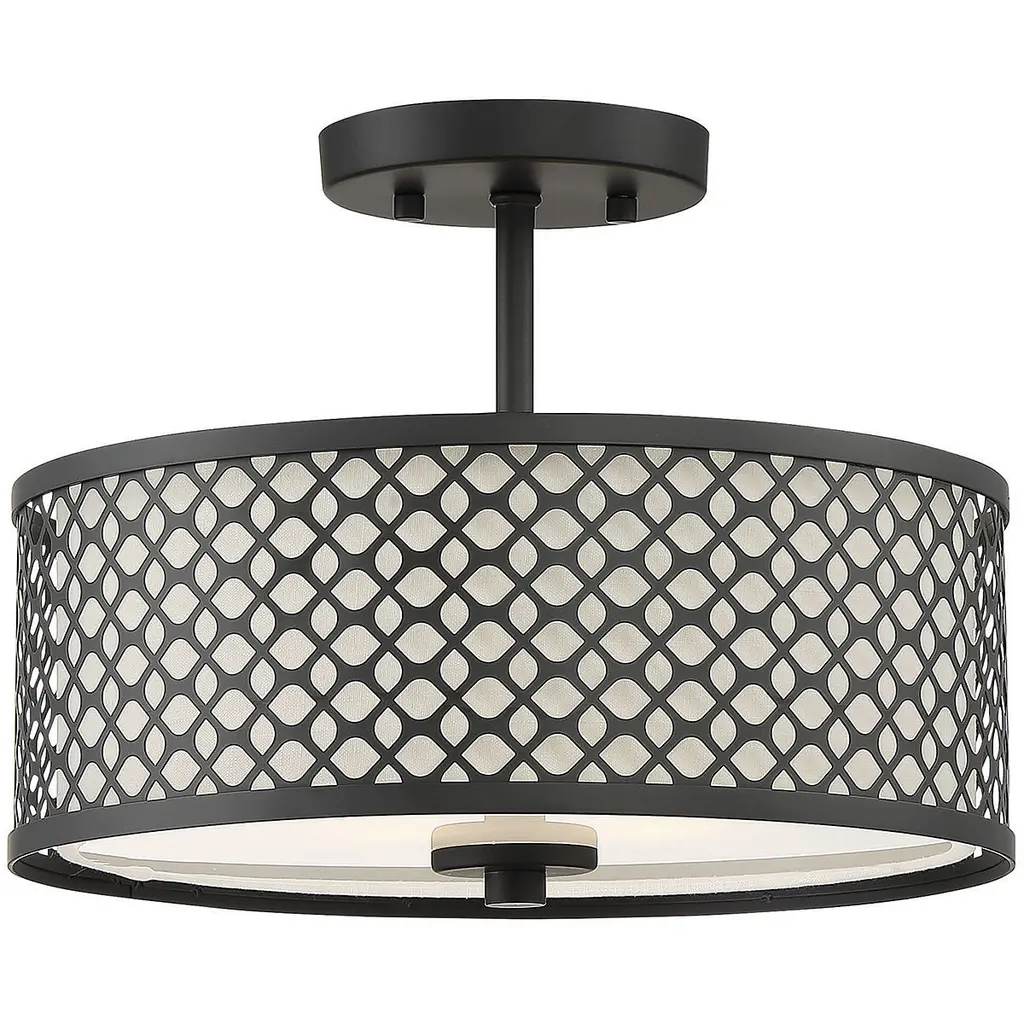 This 2-light ceiling semi-flush mount will add lots of style and useful light to any room It flaunts a geometric pattern with mid-century inspiration and a crisp cream fabric shade. Oil Rubbed Bronze finish. 10" in height and 13" in width.