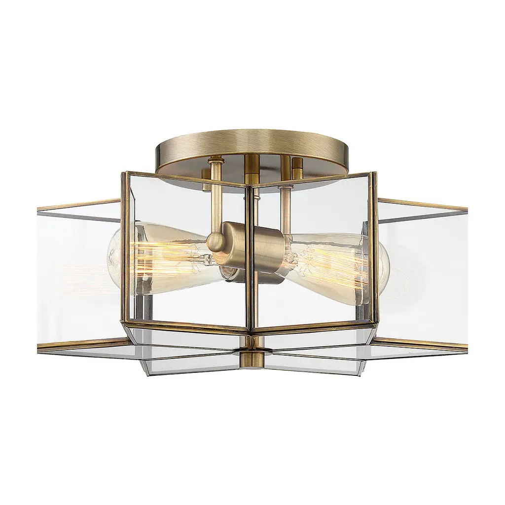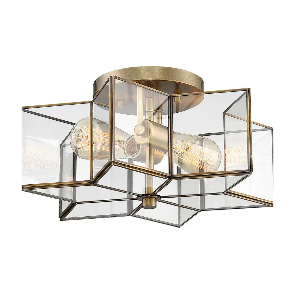 Make your home shine like the stars with this bold 2-light ceiling semi-flush mount. Its 8-point star design features panes of clear glass and a Natural Brass finish. 7" in height and 16" in width.