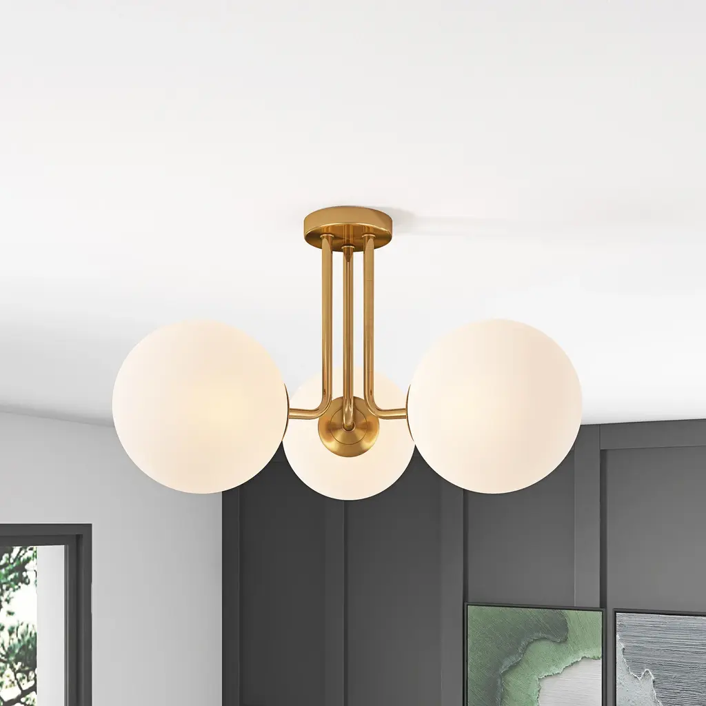 Modern Brushed Brass Semi Flush Mount Ceiling Light Fixture With White Globe Glass Shade - Brass
