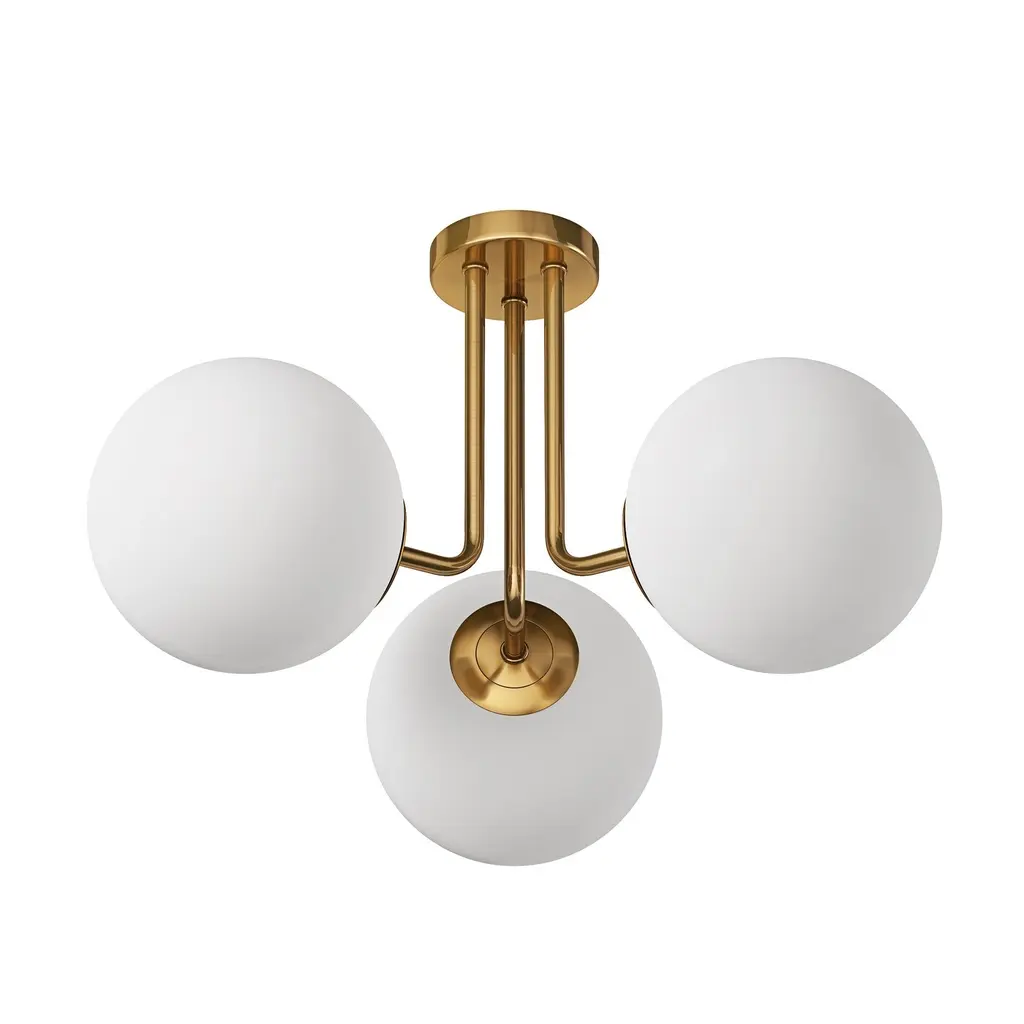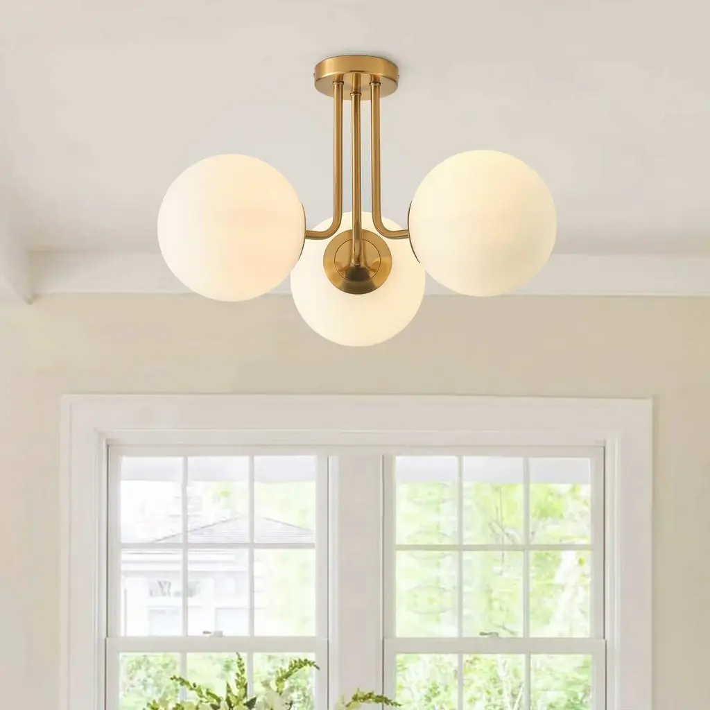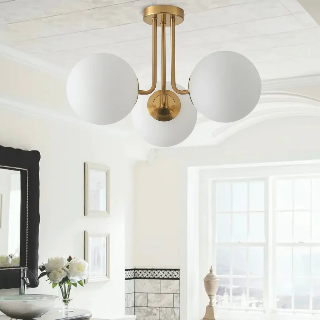 Specifications: Brushed Brass Design: The modern light fixture features a brushed brass finish lamp arm with a white globe glass shade. The contemporary 3-light gold ceiling light adds a stylish look while illuminating your room to create the perfect atmosphere.Quality Assurance: High-quality metal and glass were used to craft the ceiling light. All products in the factory have to undergo rigorous safety monitoring, to ensure quality and safety, which is beautiful, corrosion-resistant, and durable for a long time.Easy to Install: Don't worry about the installation difficulty. All necessary accessories are included, and a simple, step-by-step instruction guide is provided, taking just minutes to give your home an upgrade! If you need any help, please feel free to contact us.ETL Listed & Bulb Requirement: ETL Listed for your safety. The ceiling light is a built-in standard E12 socket, I suggest using the dimmable E12*3 base bulbs (Max 40W, 120V), it could be a fully dimmable and compatible dimmer switch. Bulbs and dimmer switch not included.Suggested Spaces: This modern-style ceiling light is durable for any space you want, highly recommended for the living room, stairs, foyer, kitchen island, hallway, dining room, bedroom, changing room, or bar, The Ceiling Light is not just a light, it's an art.