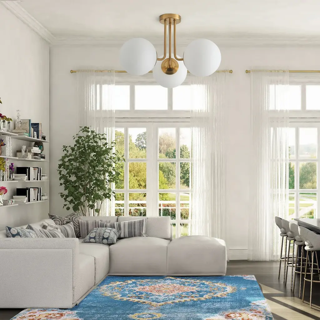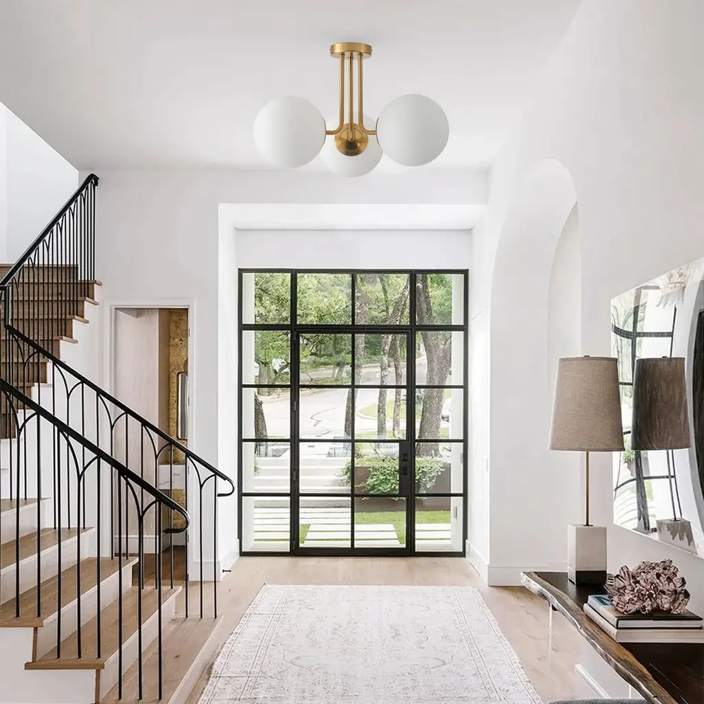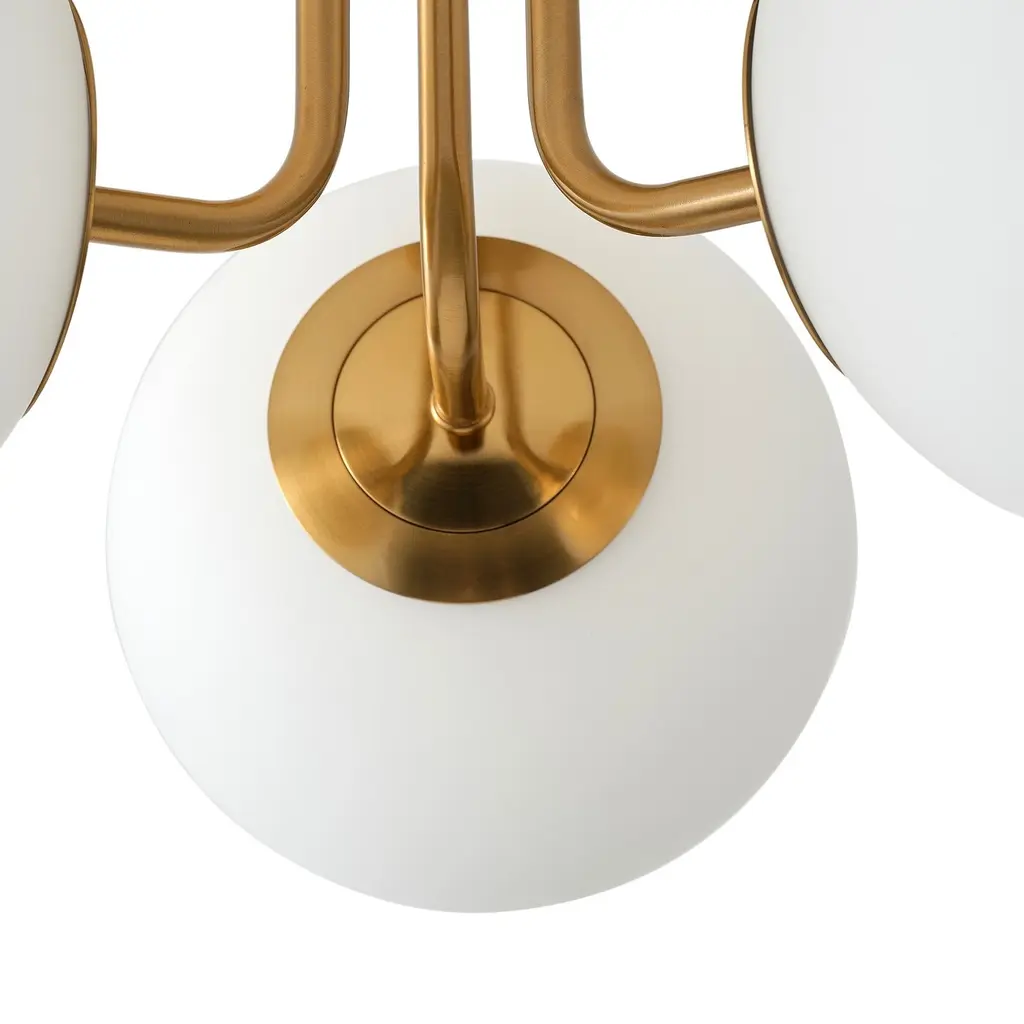 Specifications: Brushed Brass Design: The modern light fixture features a brushed brass finish lamp arm with a white globe glass shade. The contemporary 3-light gold ceiling light adds a stylish look while illuminating your room to create the perfect atmosphere.Quality Assurance: High-quality metal and glass were used to craft the ceiling light. All products in the factory have to undergo rigorous safety monitoring, to ensure quality and safety, which is beautiful, corrosion-resistant, and durable for a long time.Easy to Install: Don't worry about the installation difficulty. All necessary accessories are included, and a simple, step-by-step instruction guide is provided, taking just minutes to give your home an upgrade! If you need any help, please feel free to contact us.ETL Listed & Bulb Requirement: ETL Listed for your safety. The ceiling light is a built-in standard E12 socket, I suggest using the dimmable E12*3 base bulbs (Max 40W, 120V), it could be a fully dimmable and compatible dimmer switch. Bulbs and dimmer switch not included.Suggested Spaces: This modern-style ceiling light is durable for any space you want, highly recommended for the living room, stairs, foyer, kitchen island, hallway, dining room, bedroom, changing room, or bar, The Ceiling Light is not just a light, it's an art.