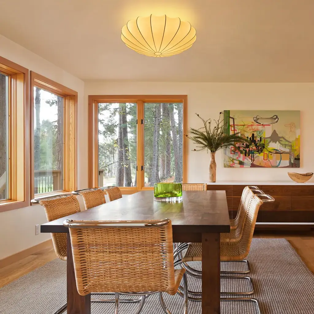 Like an elegantly pure lotus blossoming from the ceiling, this fabric semi flush mount lighting amuse whoever encounters it. This modern mid-century ceiling light features a geometric frame covered with white silk, creating a delicate and symmetrical beauty. We love the cozy ambient lighting from this silk shade ceiling light, perfect for a bedroom, dining room, living room, foyer, or rest room. Features:Specification: