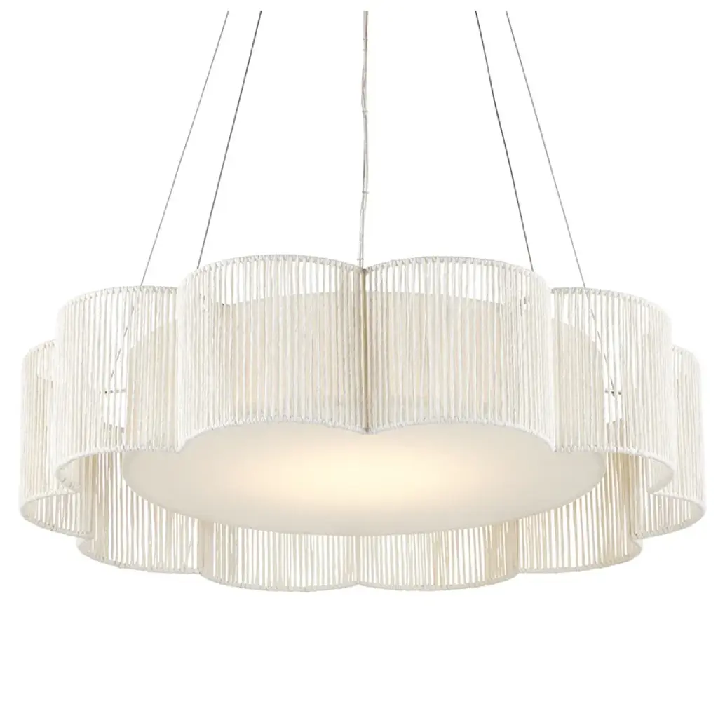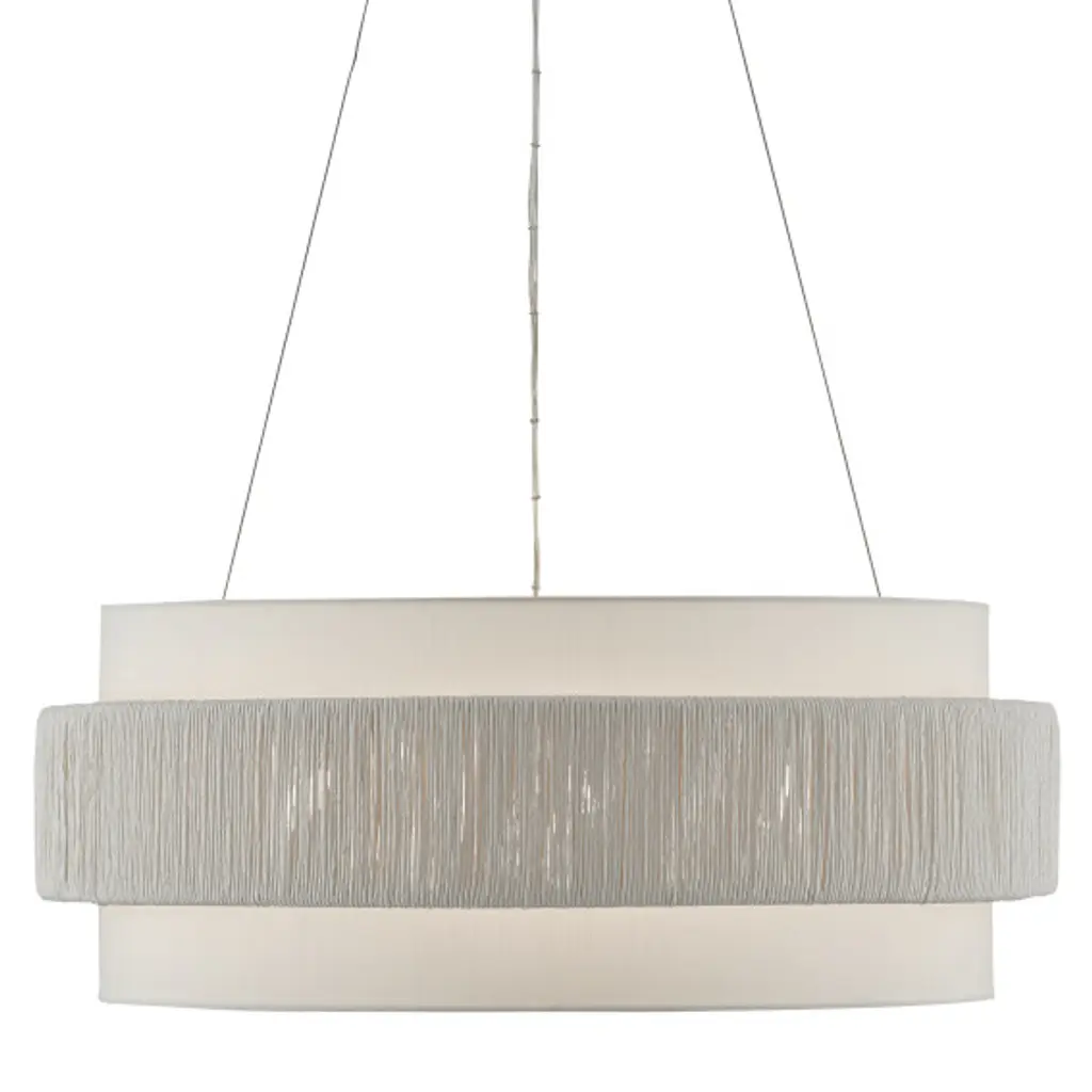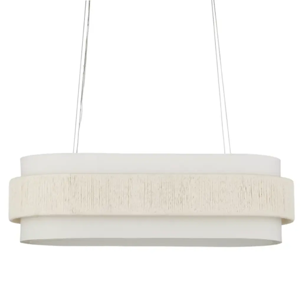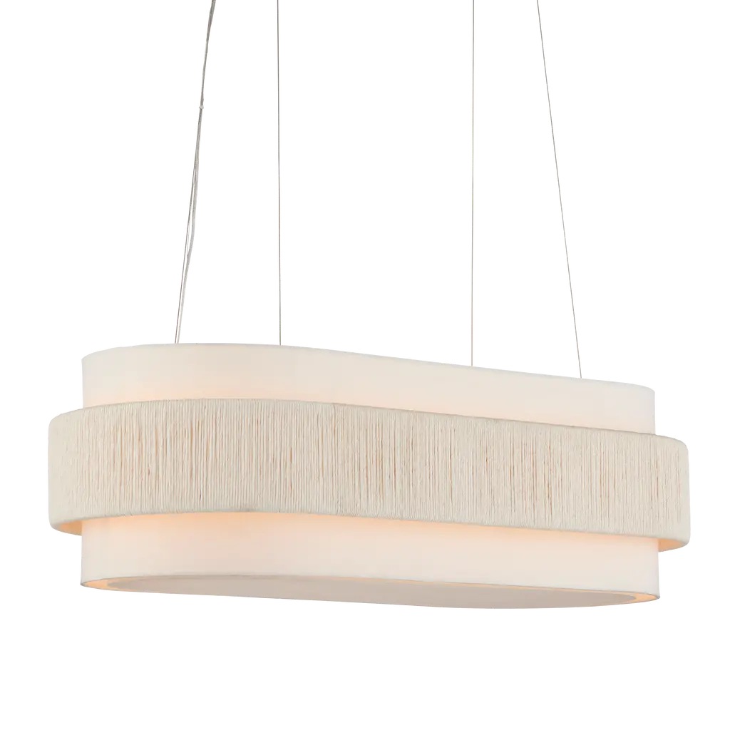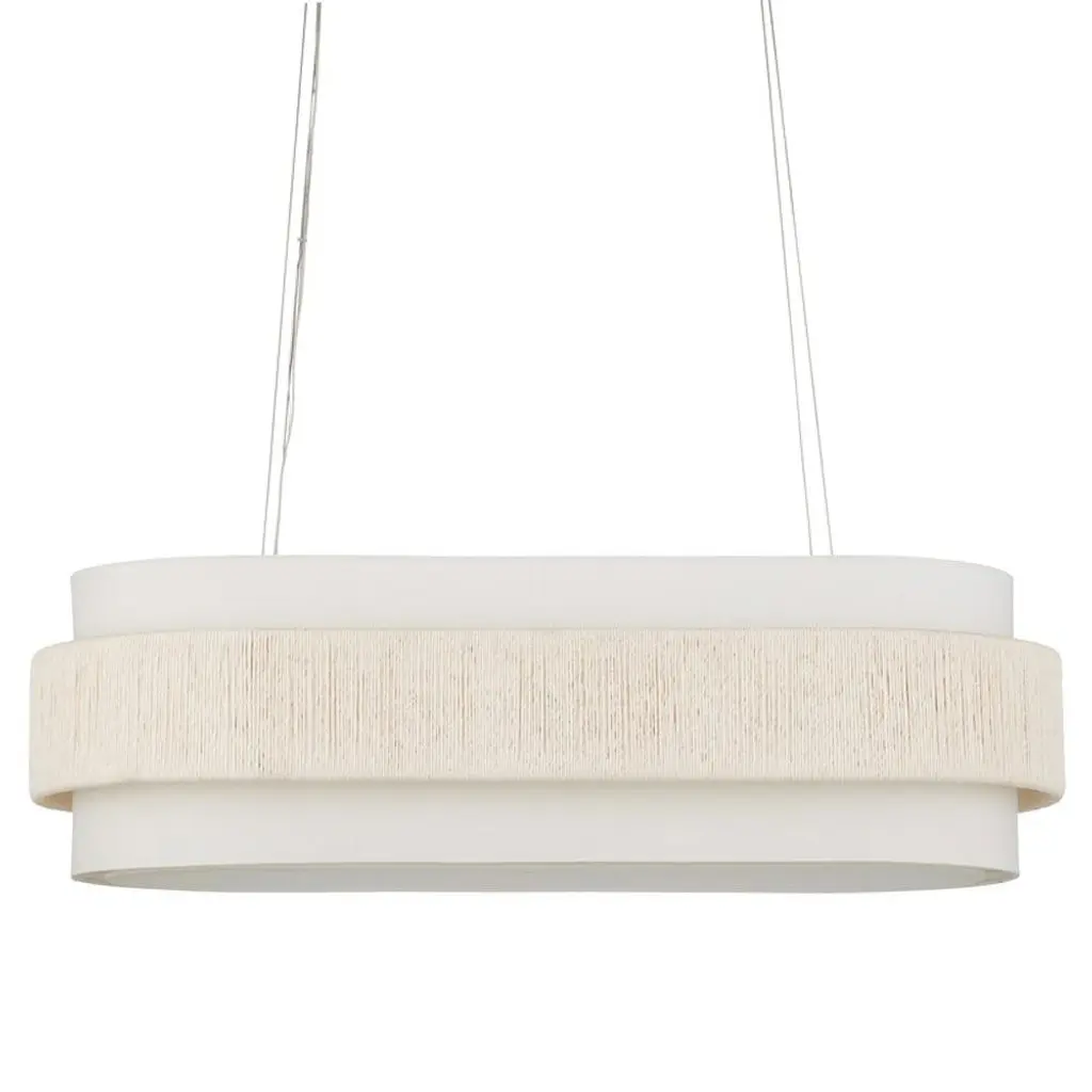 The Monreale Linear Suspension from Currey & Company is a captivating lighting fixture that seamlessly blends coastal charm. Illuminated by LEDs, this linear suspension offers a warm and inviting glow to your space. Handmade with care, it may exhibit variations in color and size, adding a distinctive touch to each piece. It is composed of kraft paper, twine, and wrought iron. With an off-white shantung fabric shade, this linear suspension is a statement piece.