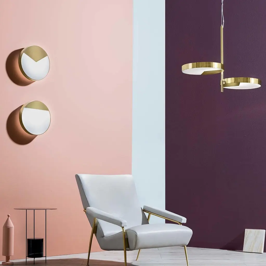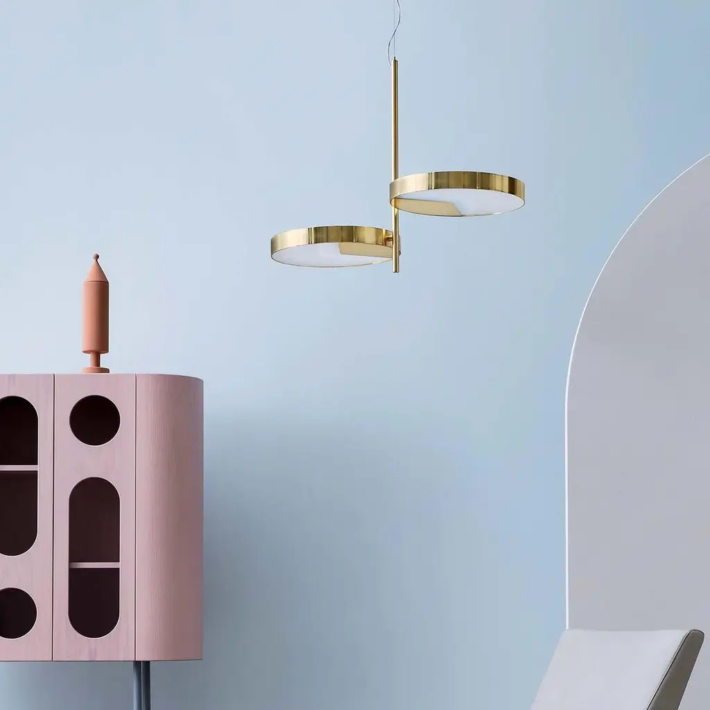 Part of the Moonlight collection, this two-light ceiling lamp poetically evokes the romantic ambiance of a moonlit landscape. Its Minimalist and geometric Silhouette in metal with a satin brass finish comprises a vertical element with two horizontal disks attached to it by means of tiny magnetic sheets, which allows to customize this object. An LED 14W 3000K strip is included. The metal can also have a black matte finish upon request - please ask the Concierge.