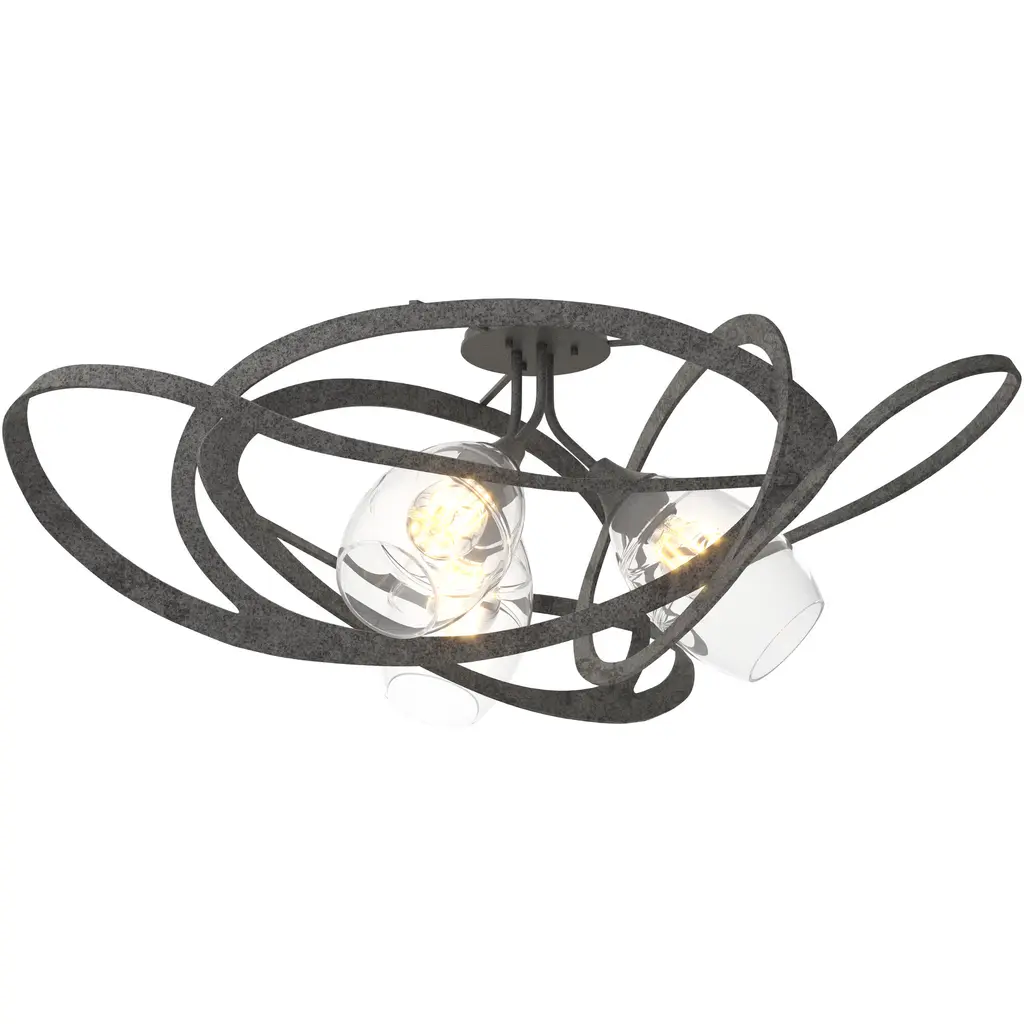Delicately sculpted steel lends itself to the free-flowing style of the Nest Semi-Flush Pendant. This hand-crafted semi-flush reflects a harmonious organic composition from every vantage point. Three thick blown-glass shades, with contoured detailing, cast a soft ambient light over a wide area.