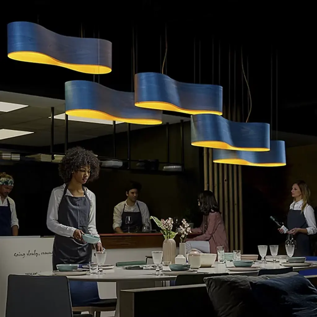 The LZF New Wave S Linear Suspension is a meandering band of wooden veneers, lending a more naturalistic approach to linear designs that can often be too stark or minimal. Two strips of wood are fitted together to create the shapely silhouette, finished on the interior. The interior shade color picks up the light remarkably well, creating a glowing interior that provides ample down lighting as well.