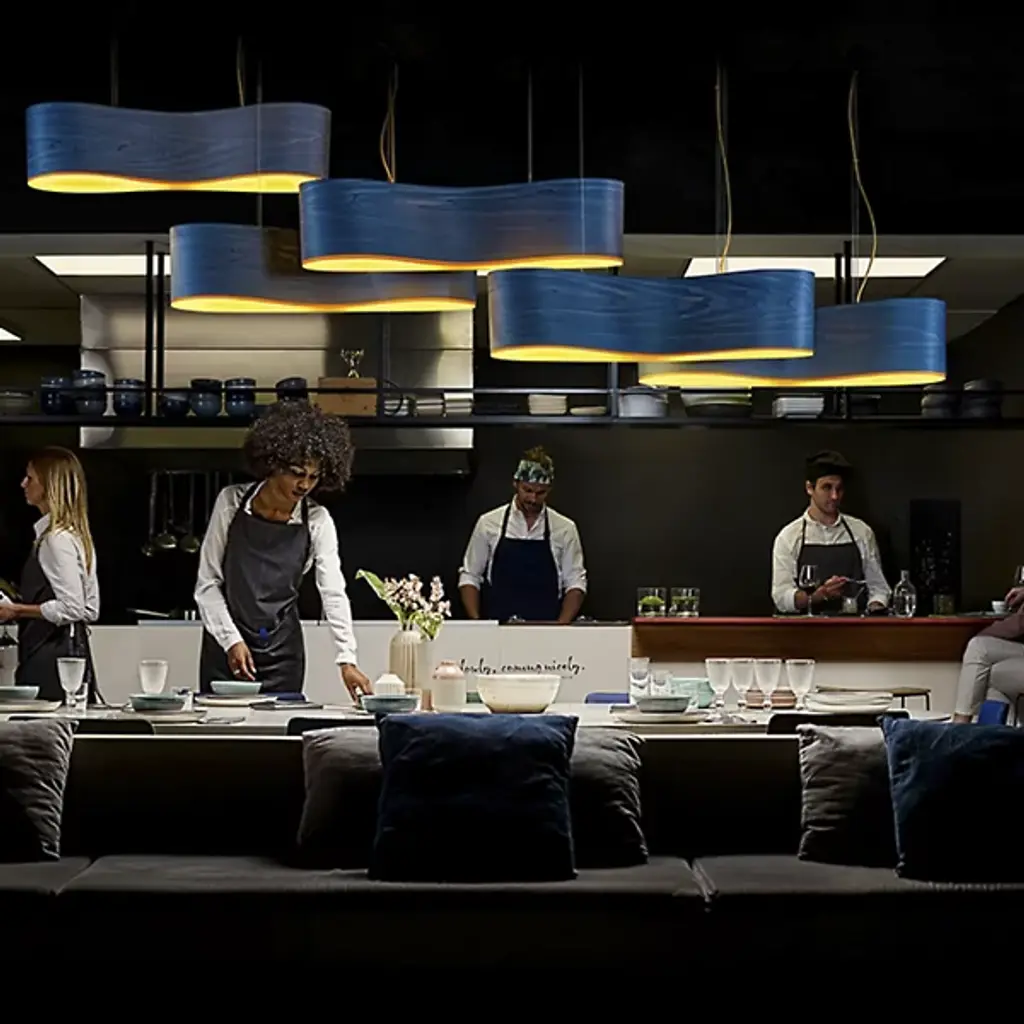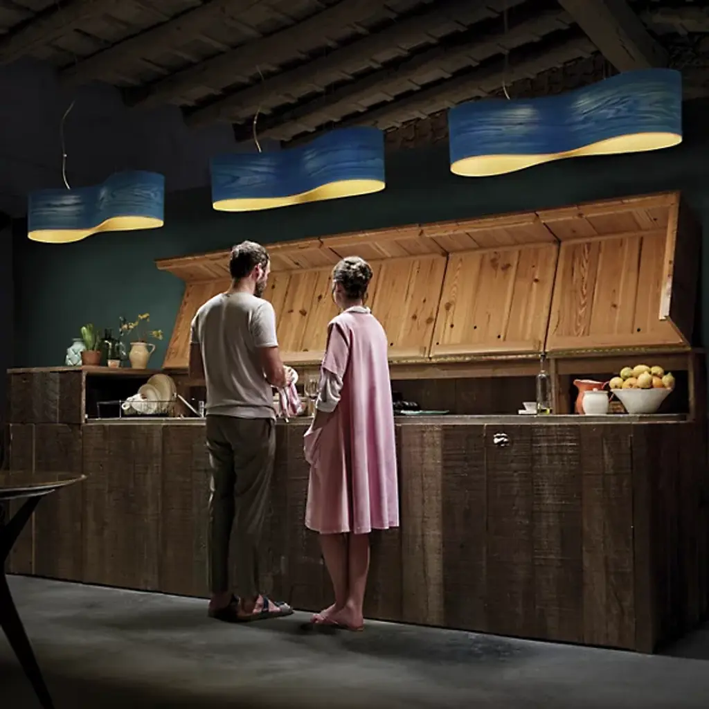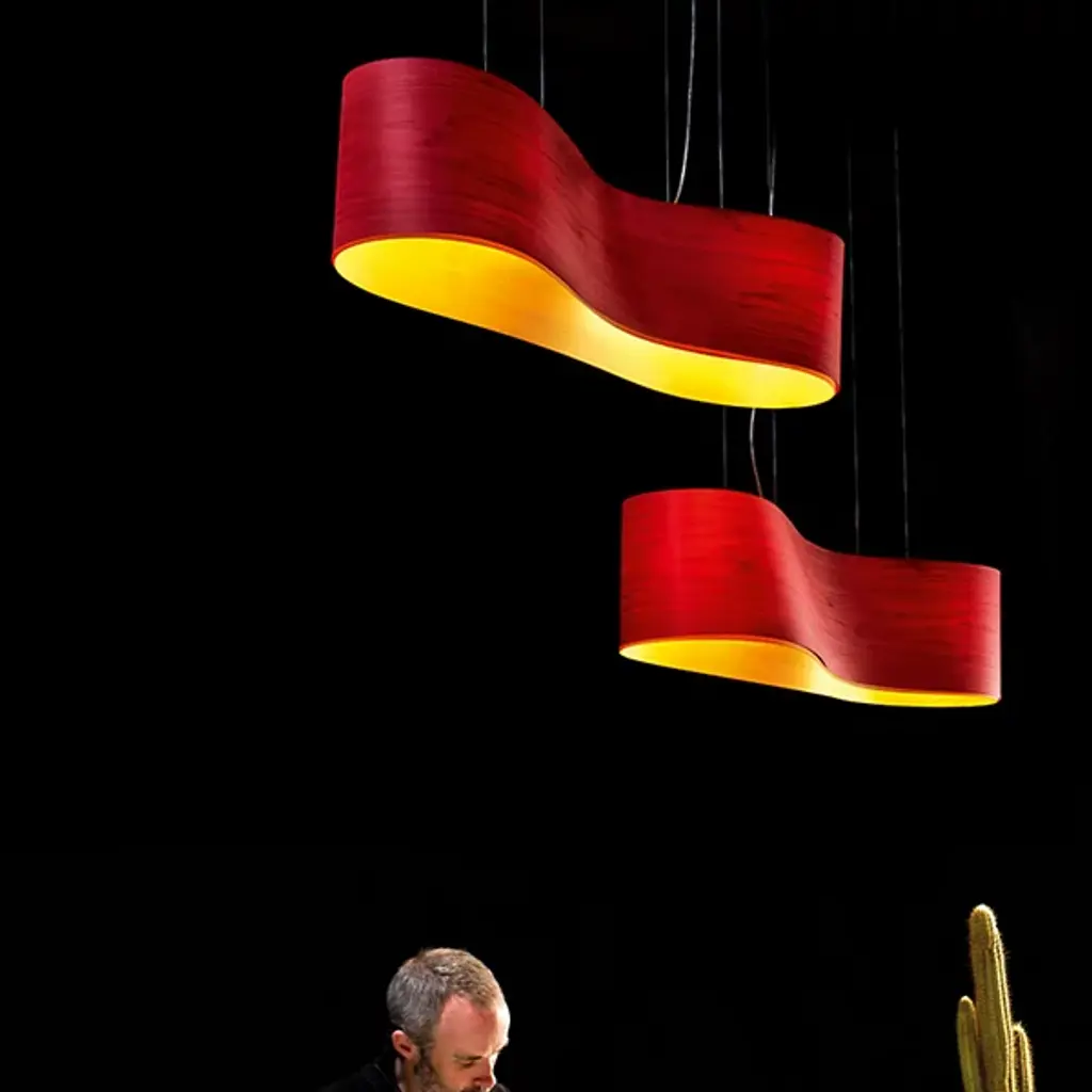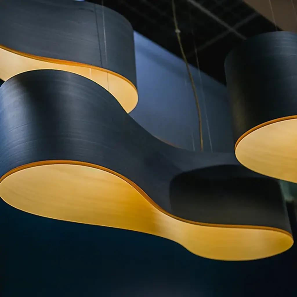 The LZF New Wave S Linear Suspension is a meandering band of wooden veneers, lending a more naturalistic approach to linear designs that can often be too stark or minimal. Two strips of wood are fitted together to create the shapely silhouette, finished on the interior. The interior shade color picks up the light remarkably well, creating a glowing interior that provides ample down lighting as well.