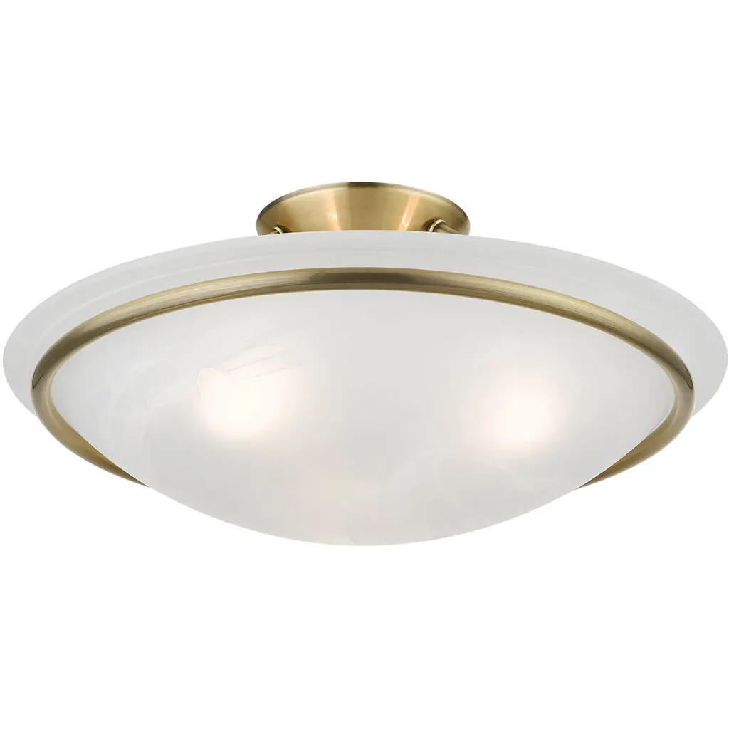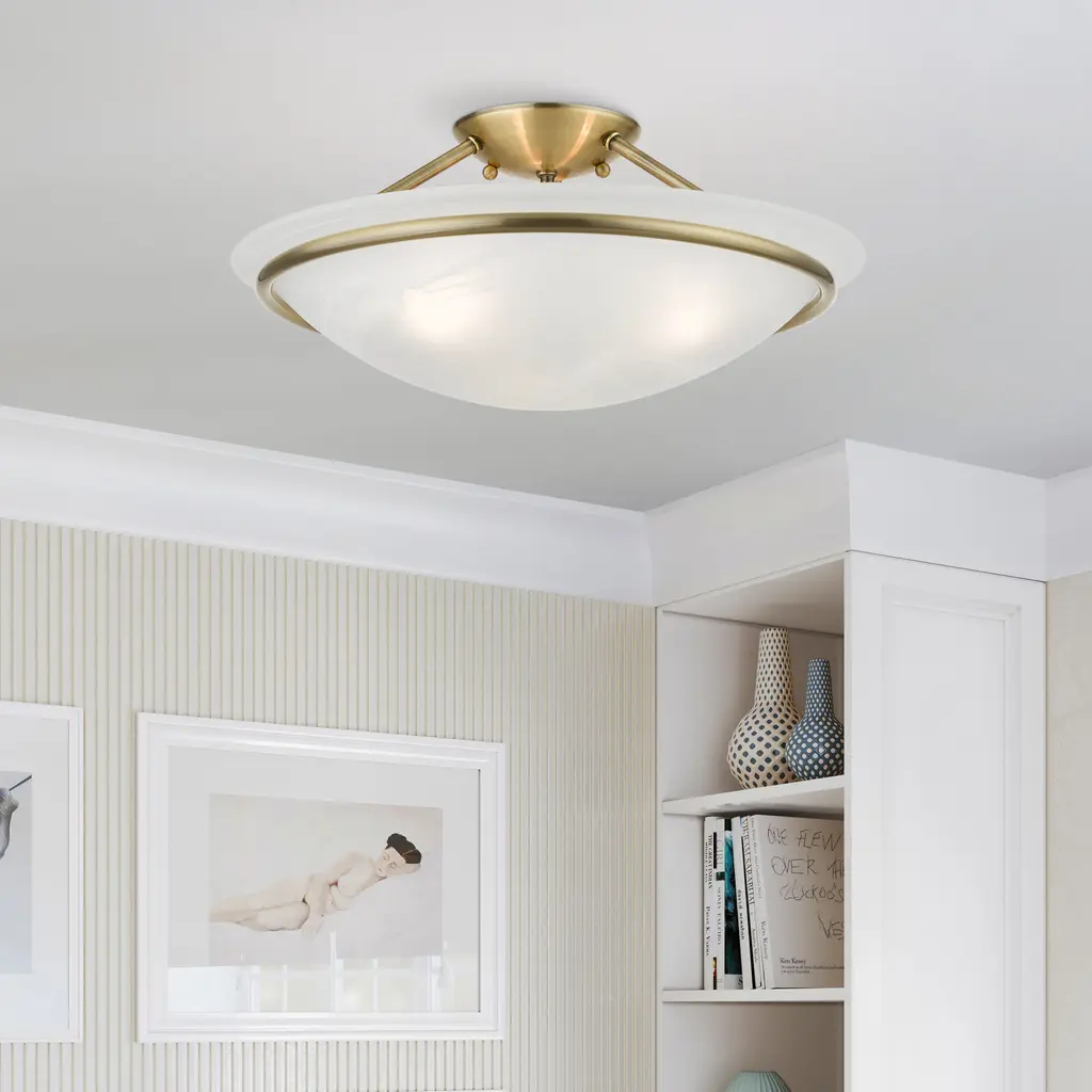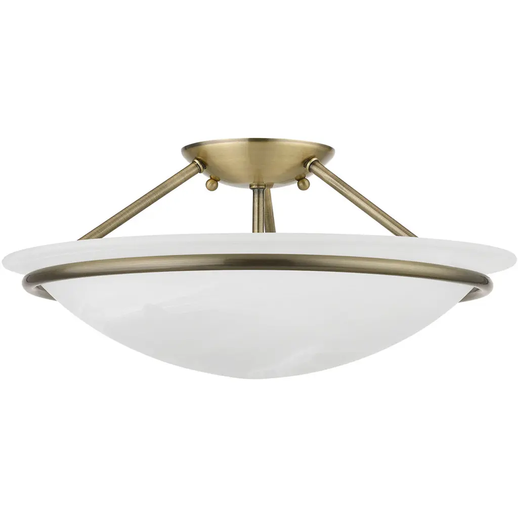 This three light semi flush mount features a lustrous antique brass finish with light glowing from within the large white alabaster glass bowl shape shade. complete a kitchen, bedroom, or any room in your house with this beautiful semi flush mount.