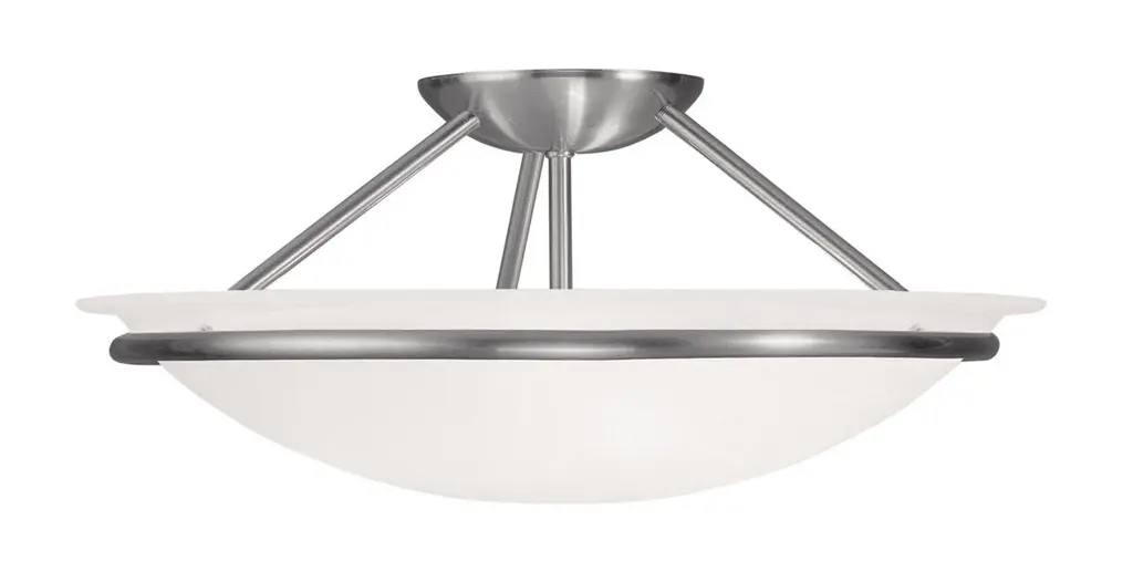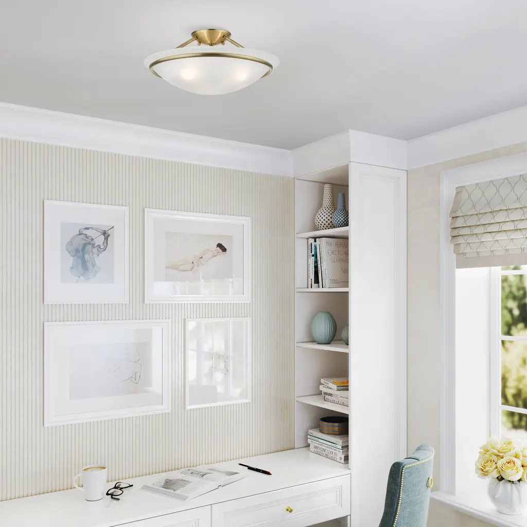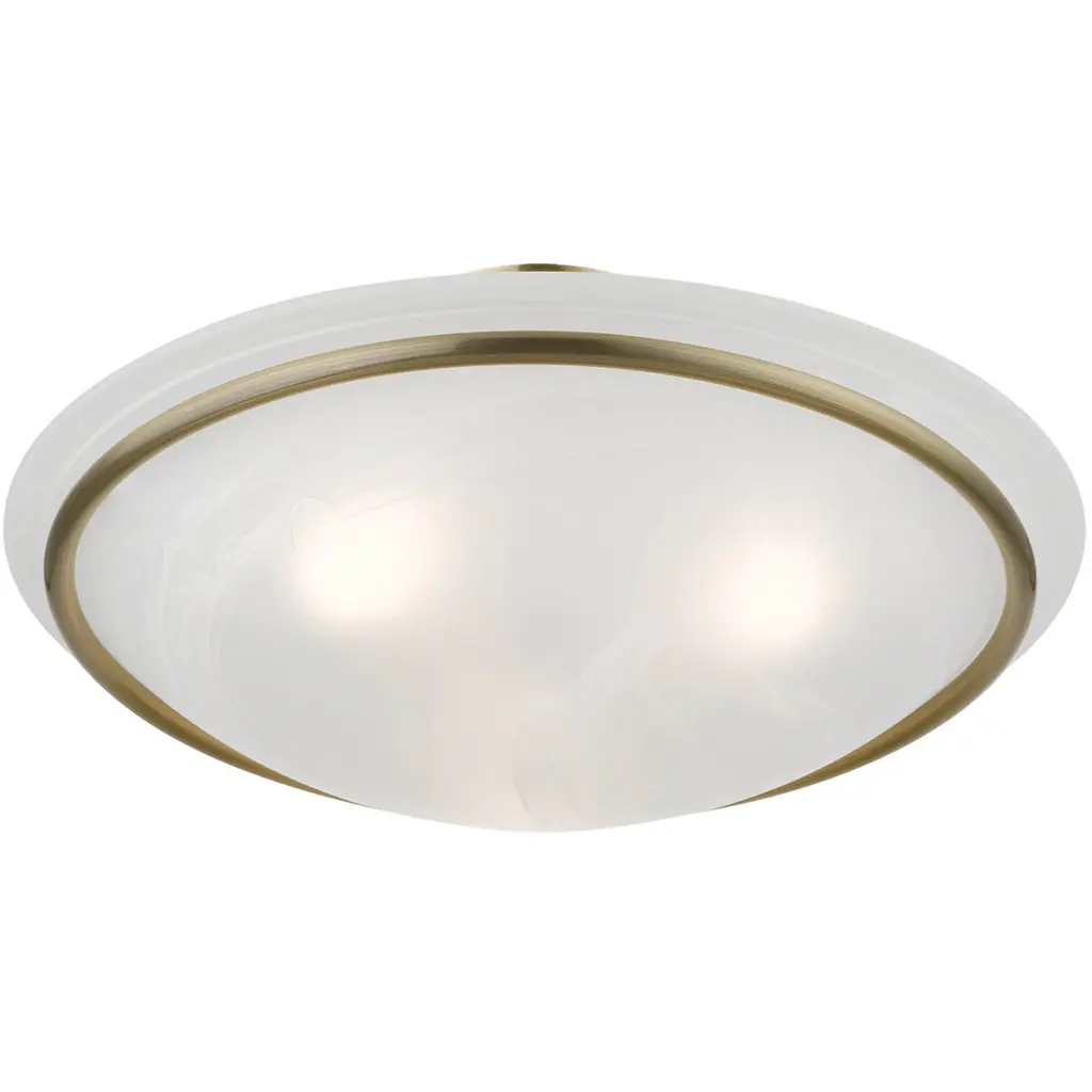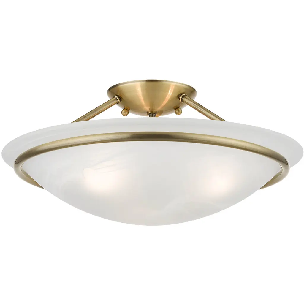 This three light semi flush mount features a lustrous antique brass finish with light glowing from within the large white alabaster glass bowl shape shade. complete a kitchen, bedroom, or any room in your house with this beautiful semi flush mount.