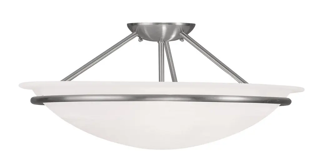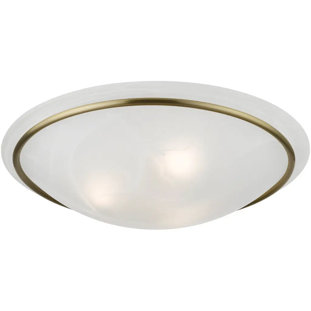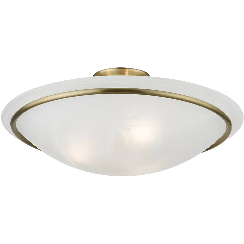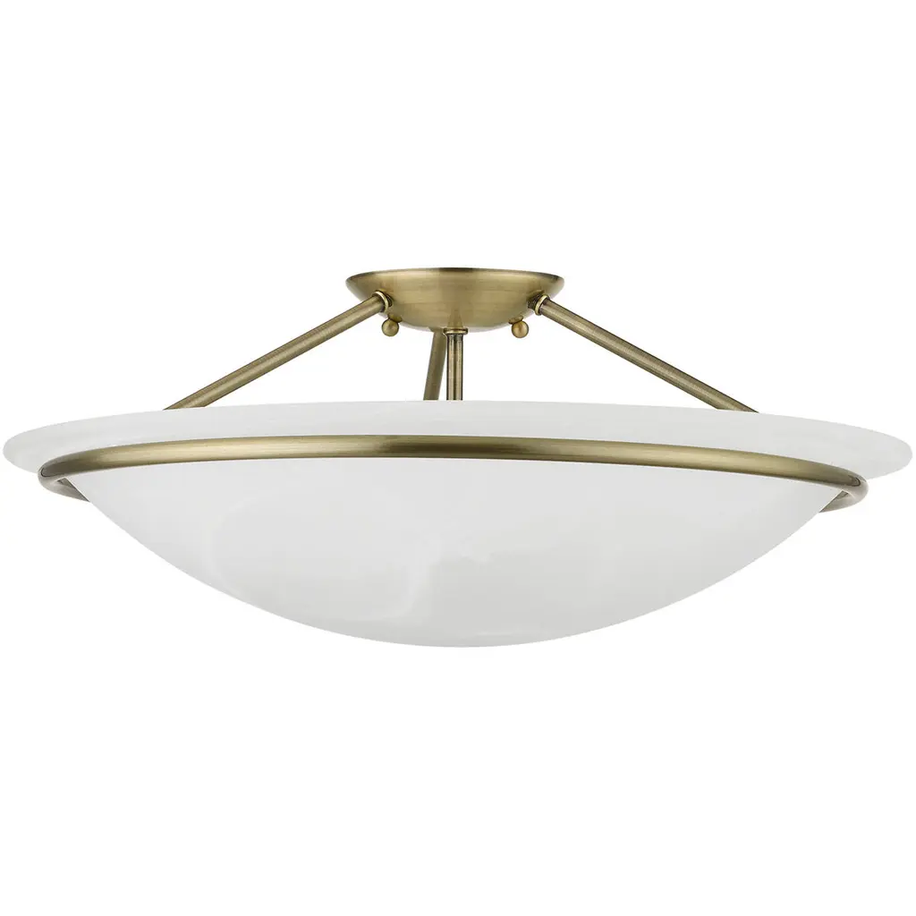 This three light semi flush mount features a lustrous antique brass finish with light glowing from within the large white alabaster glass bowl shape shade. complete a kitchen, bedroom, or any room in your house with this beautiful semi flush mount.