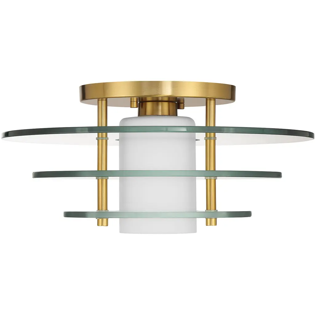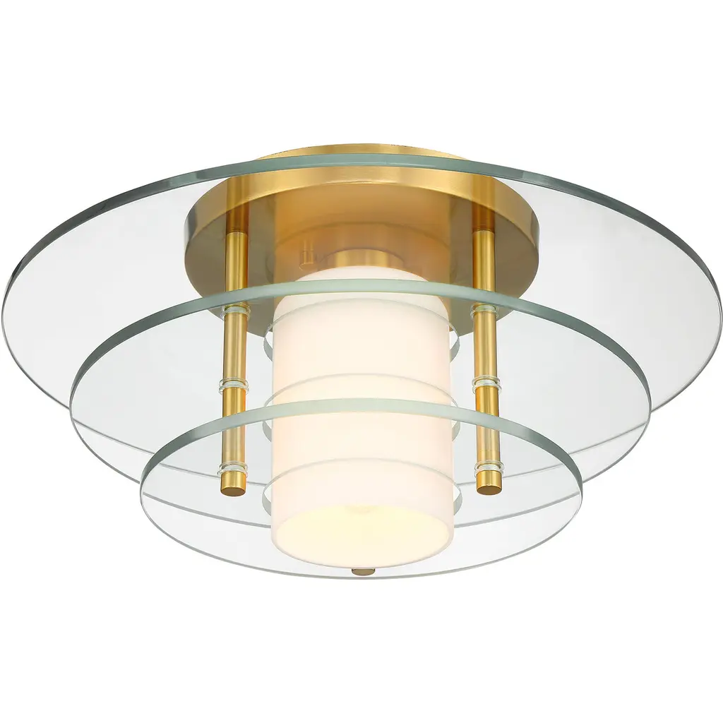 The Newell 1-light ceiling semi-flush mount from Savoy House is a standout example of Art Deco style. Three sleek discs of clear glass surround a core shade of opal glass to create a bright and intriguing glow. The Warm Brass finish is bright and chic. Newell is 7" in height and 16" in width. It uses one standard size bulb of up to 60 watts. The bulb is not included.