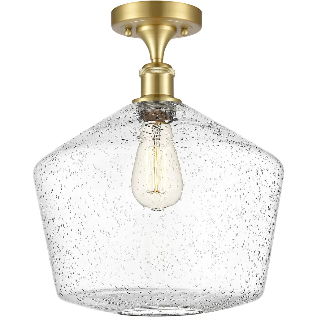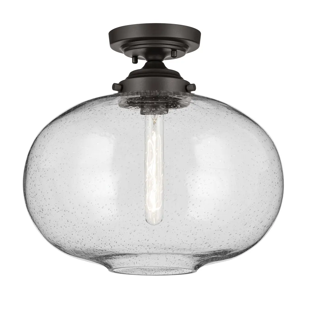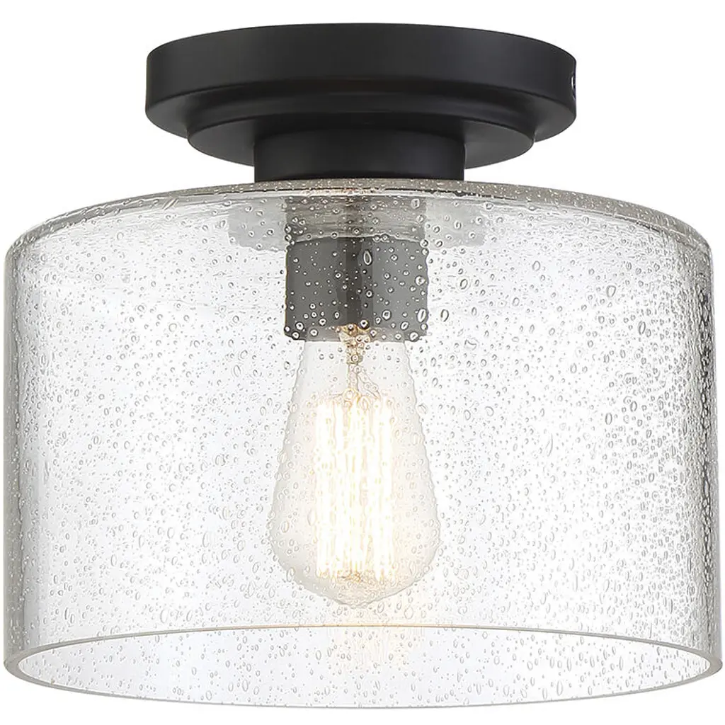 The Niles Clear/Opal is composed of a broad clear glass cylinder, with an interesting bubble pattern blown randomly throughout the glass and an inner opal cylinder for concealing the light source. The pleasing play of light through the bubble accents make for a striking affect, along with the popular theme of this transitionally designed pendant. The semi-flush fixture is equipped with a socket on a low profile flat canopy, with machined and plated glassholder hardware. These stylish and functional luminaries are offered in a beautiful brushed Bronze finish.
