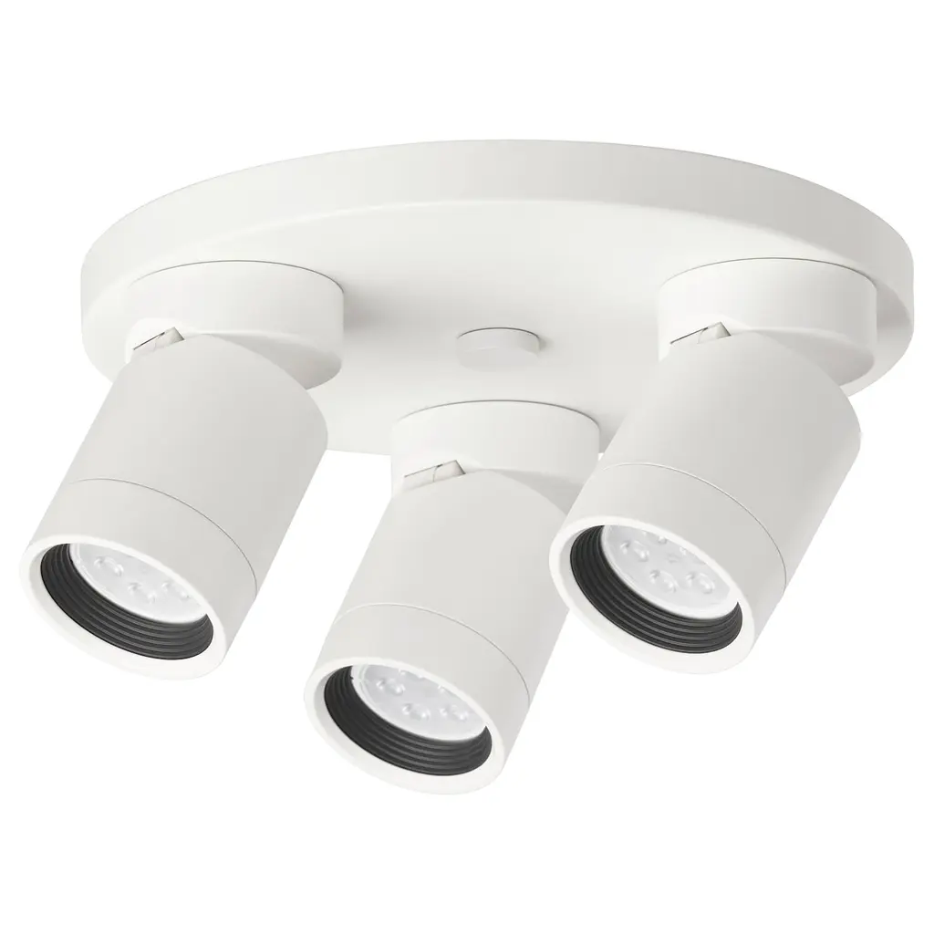 NYMÅNE Ceiling spotlight with 3 lights - white. You can easily direct the light to different places since each spotlight can be adjusted individually. Light bulbs sold separately. IKEA recommends LED bulb GU10 (3 pcs). Hardwired installation. May be completed with other lamps in the same series.