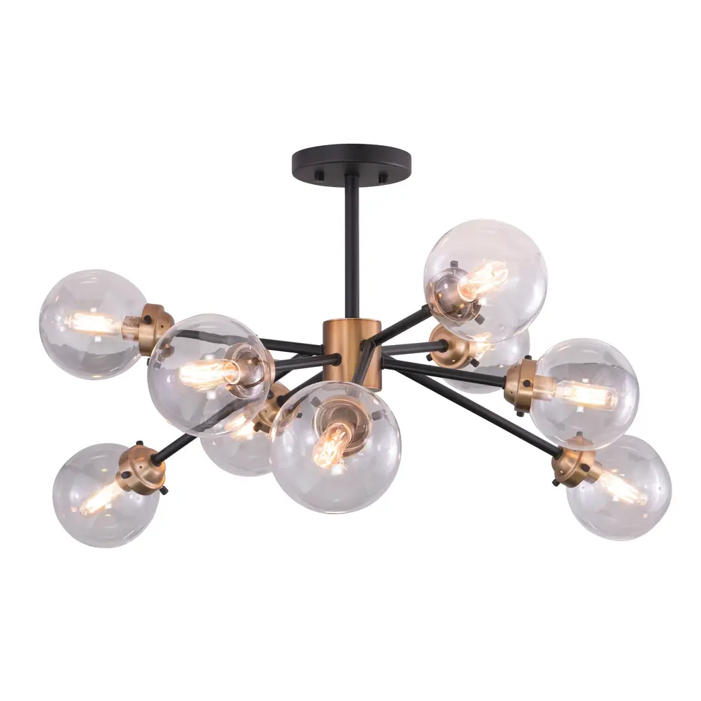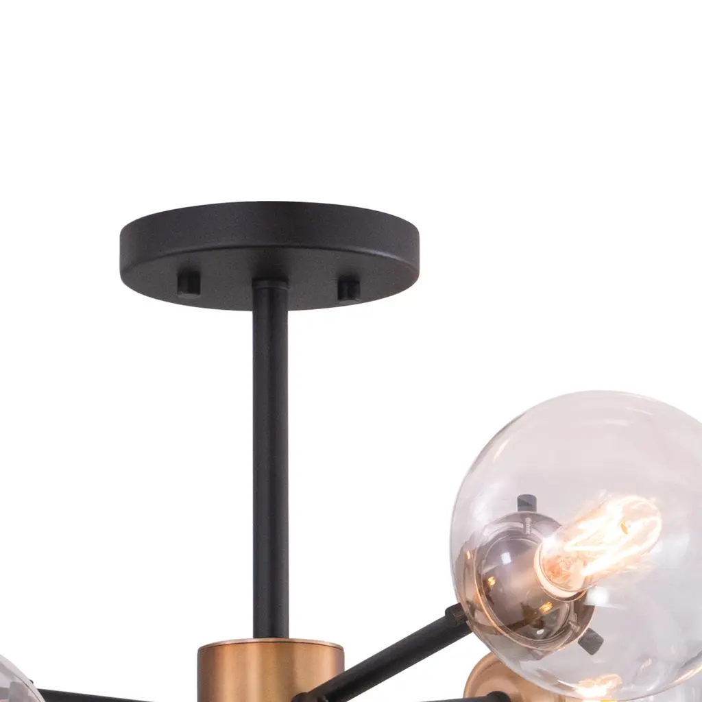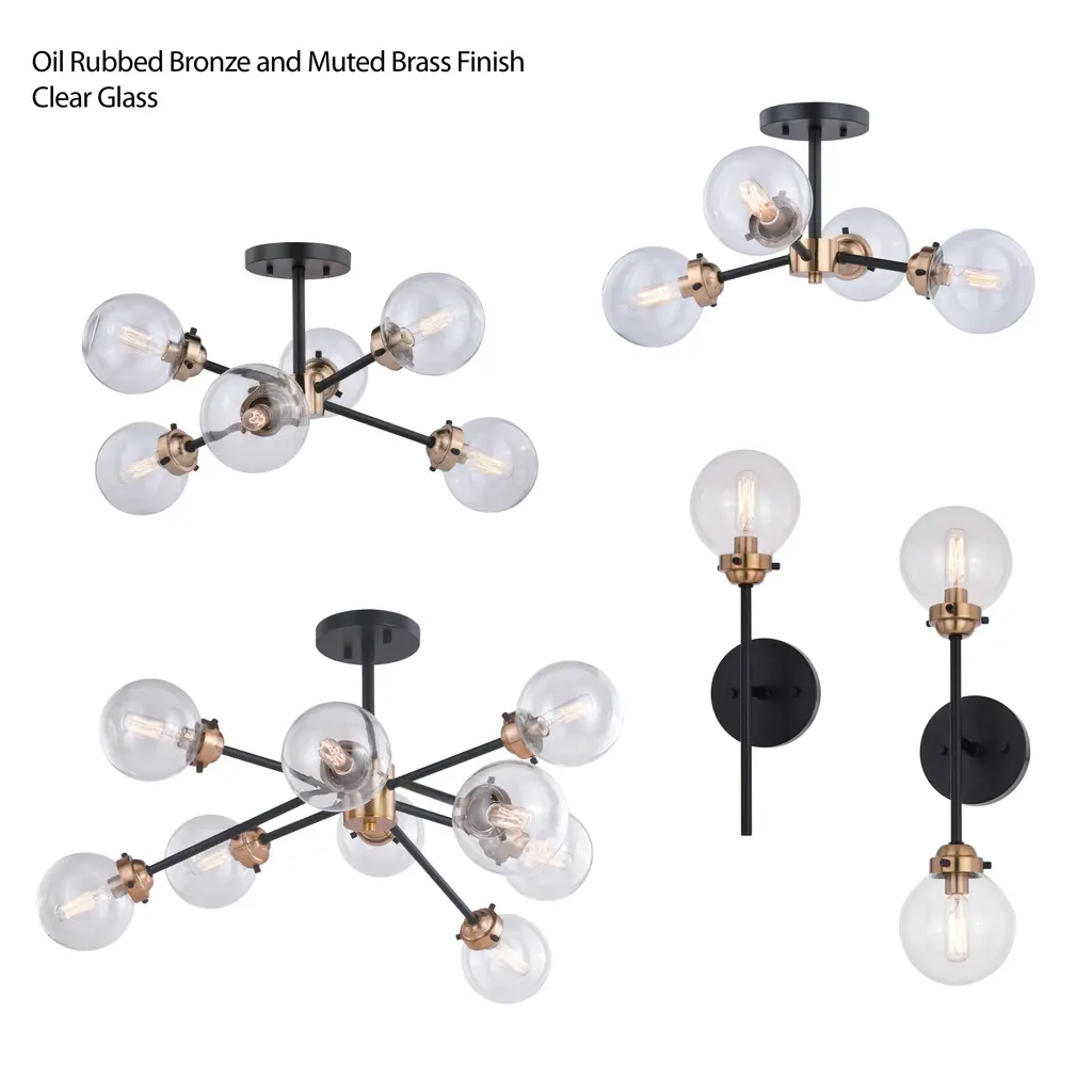 This semi-flush light fixture boasts a delightful retro flair, as its outstretched arms are punctuated with clear glass globes. Combine that with a vintage Edison-style filament bulb to complete the look. Muted brass accents and an oil-rubbed bronze finish showcase a familiar look from a mid-century era.Features:Size Options: