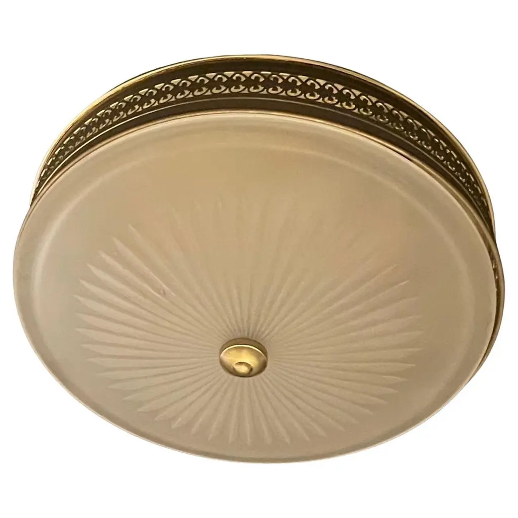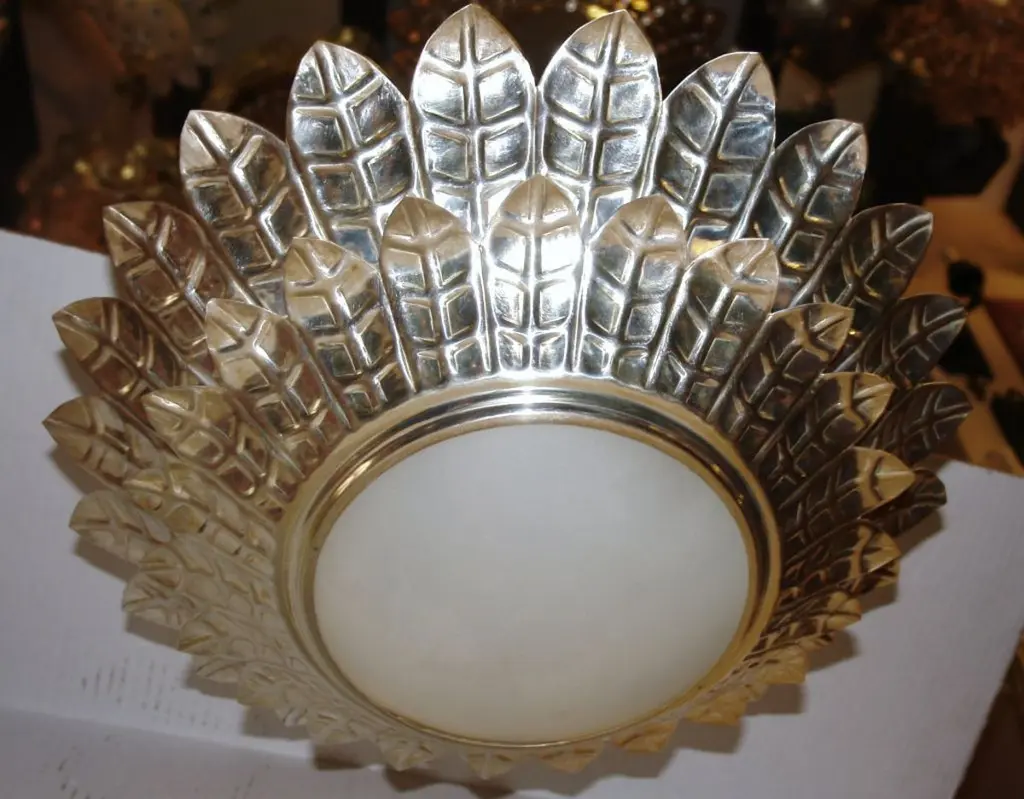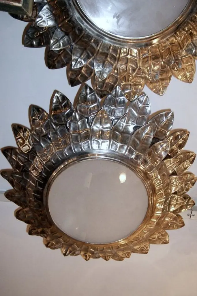 Pair of circa 1940's silver plated sunburst shaped light fixtures with double tier and with frosted glass inset. Interior lights. Sold individually.Measurements:Diameter 17.75"Height 11" (adjustable drop).