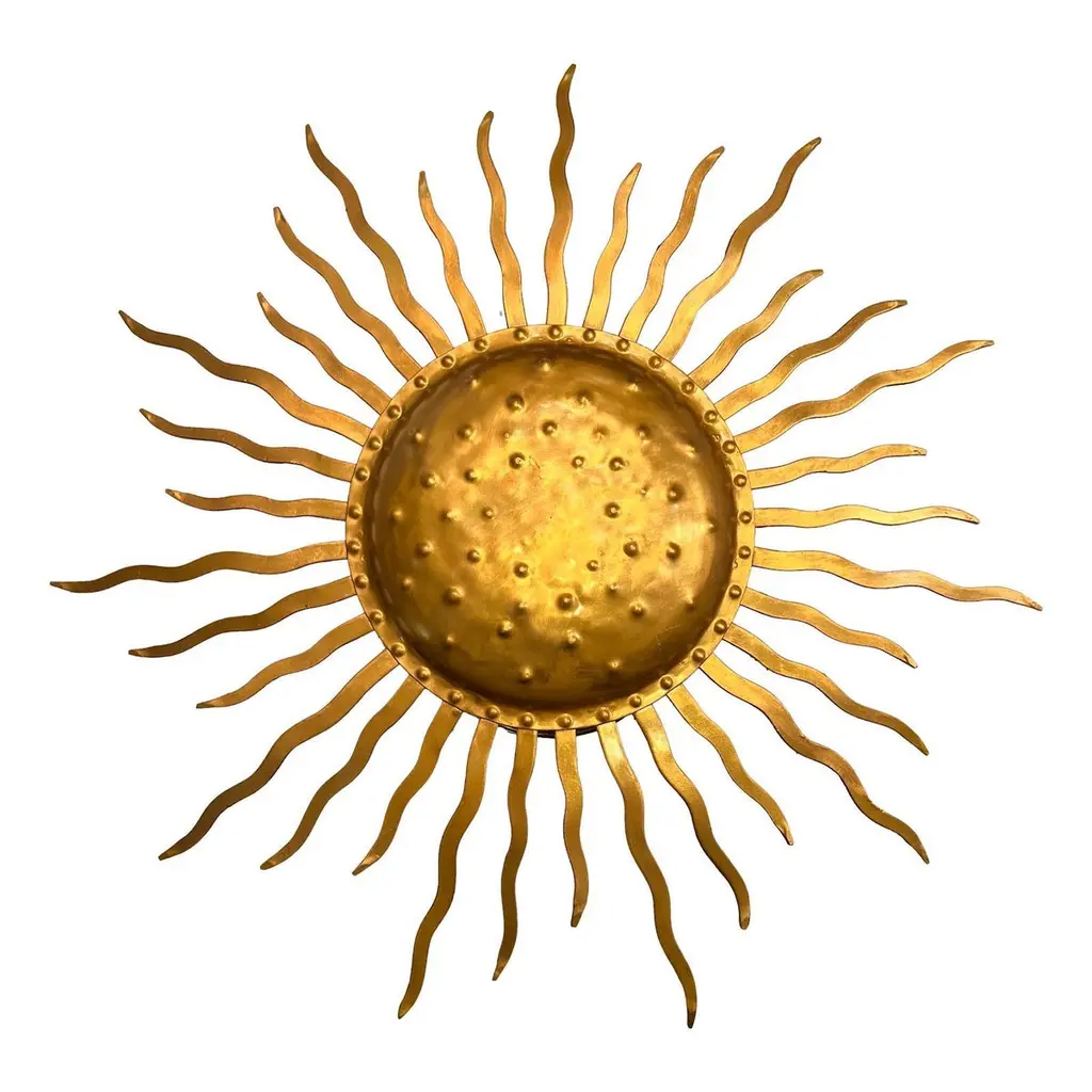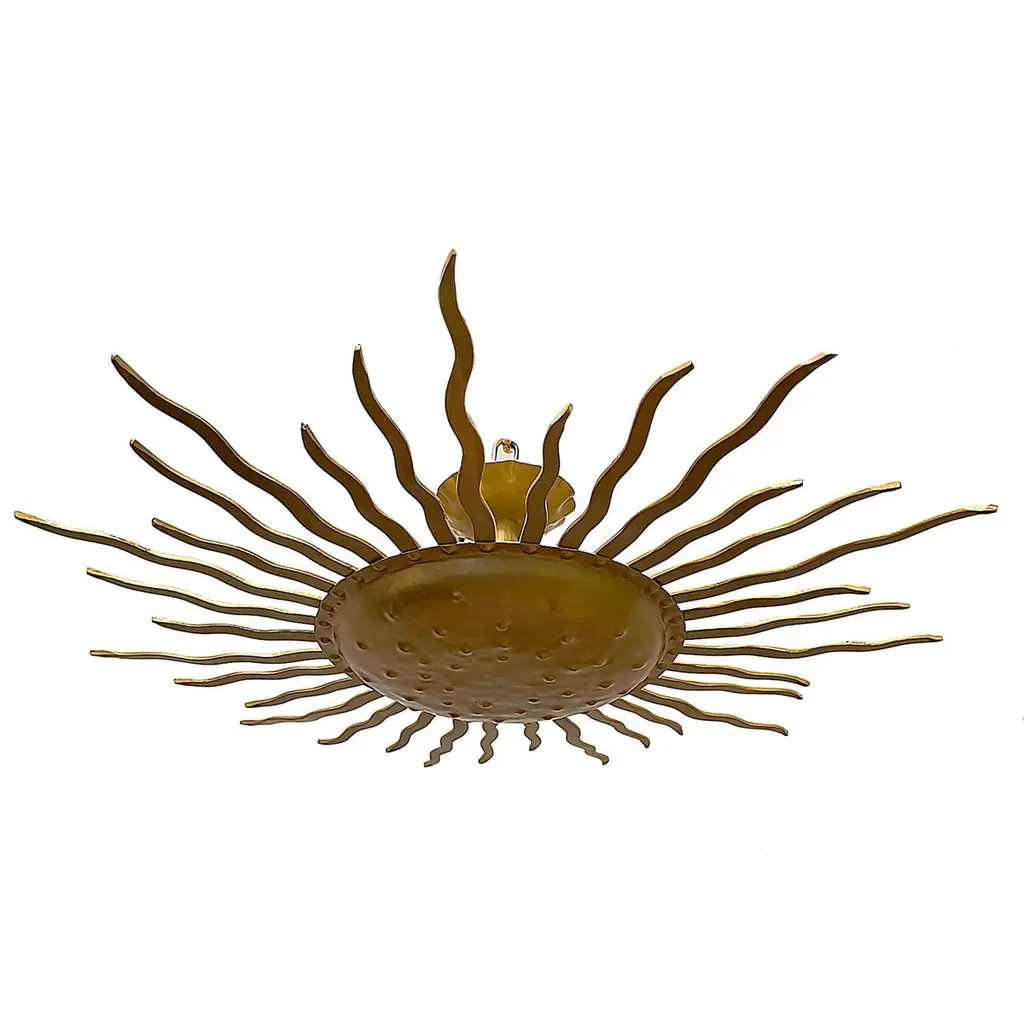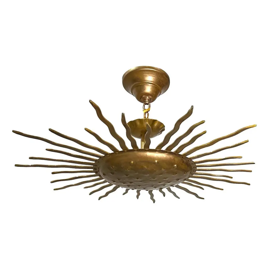 Pair of circa 1940's French gilt metal sunburst shaped light fixtures with interior lights and original patina. Sold individually.Measurements:Diameter: 24"Drop: 9"