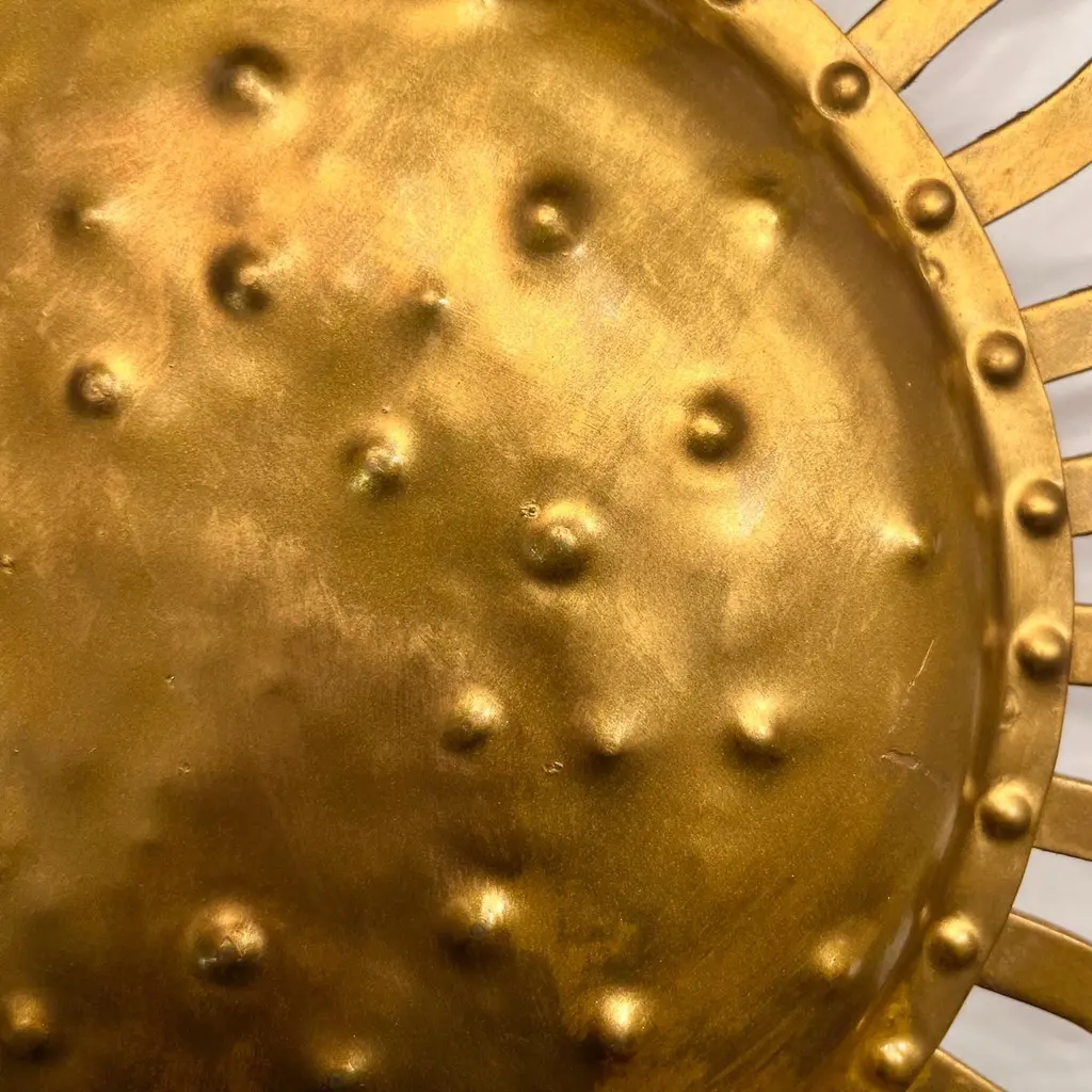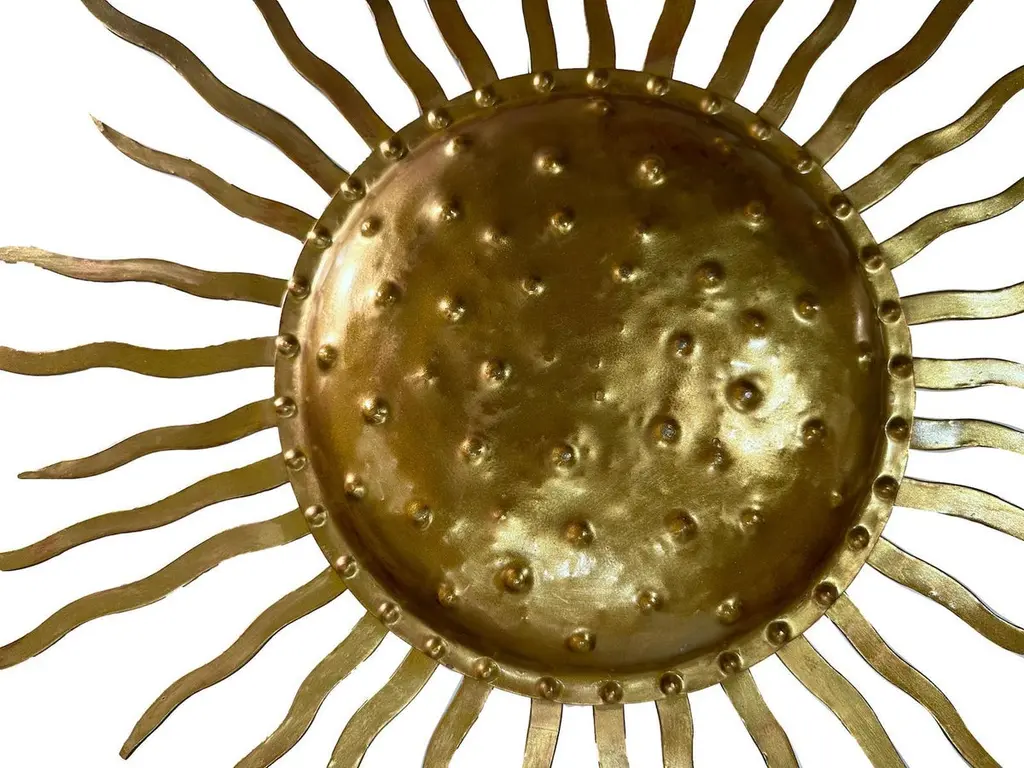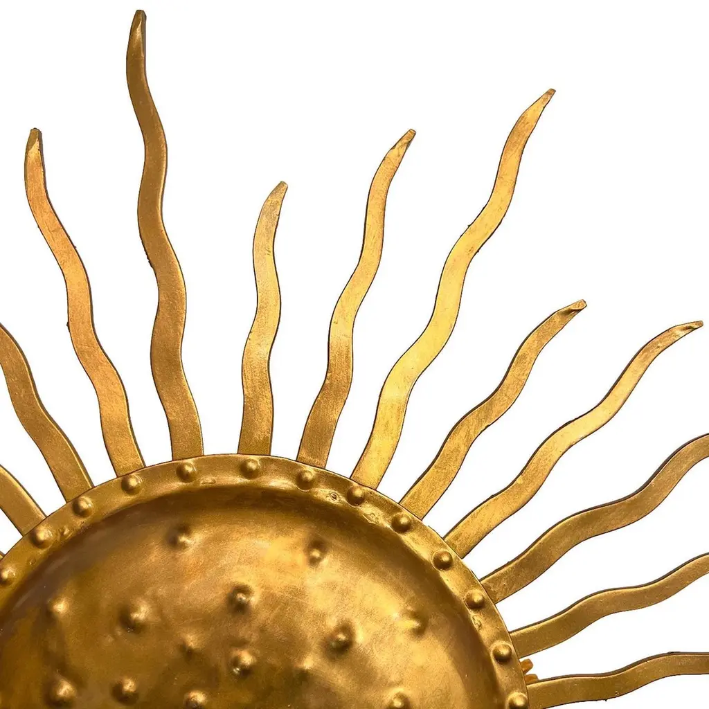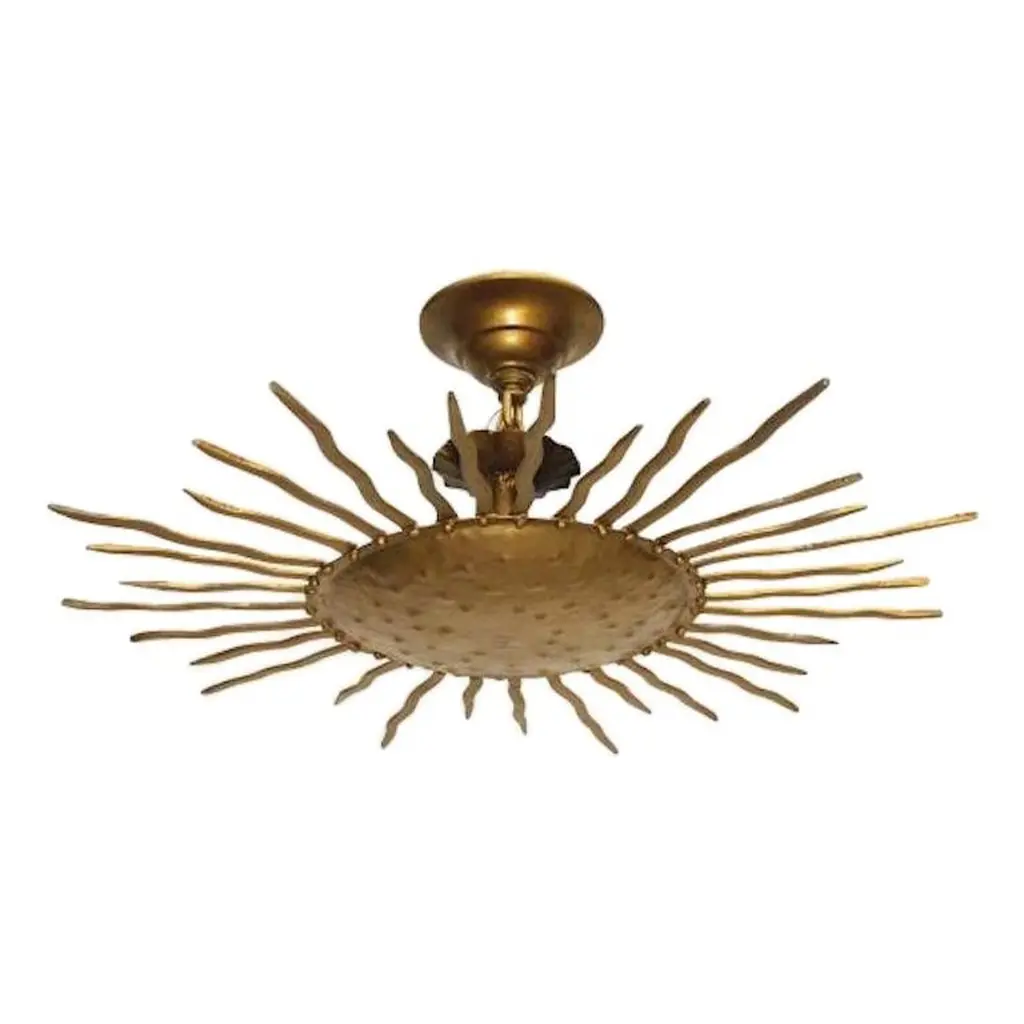 Pair of circa 1940's French gilt metal sunburst shaped light fixtures with interior lights and original patina. Sold individually.Measurements:Diameter: 24"Drop: 9"