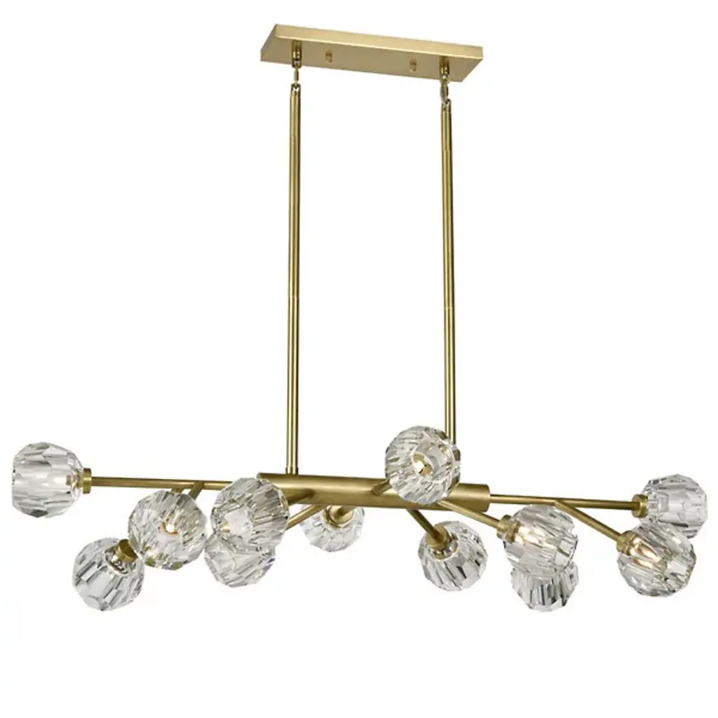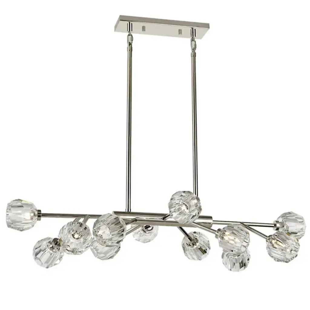 Exquisite shades of clear crystalline in the Parisian Abstract Linear Suspension by Zeev Lighting. This art deco-styled light fixture is secured by a rectangular ceiling canopy. A collection of halogen bulbs gather around a framework of sturdy iron, letting light dispense throughout your environment in an overhead fashion. Your chandelier’s lights are dimmable when used with a standard dimmer.
