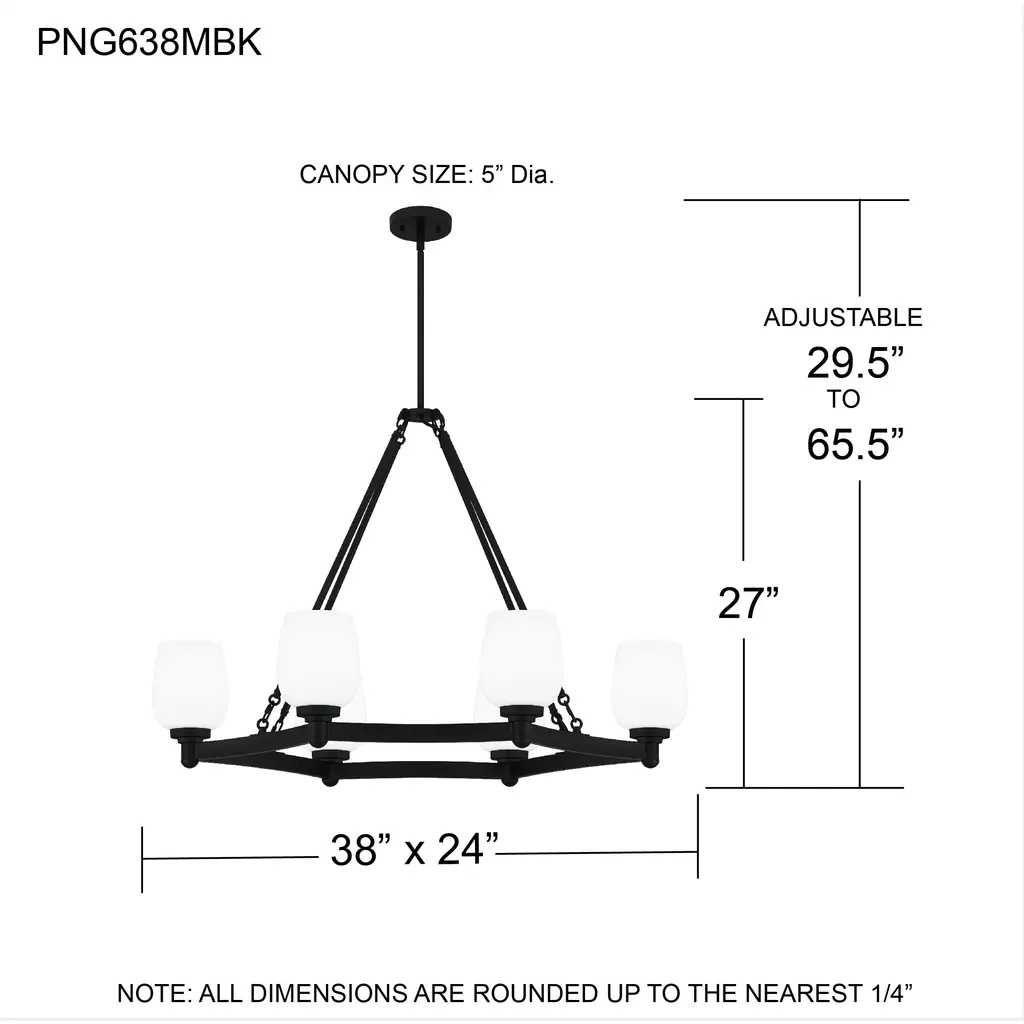 A fresh interpretation of the classic wagon wheel silhouette, Penning features opal etched glass shades that softly cast light. Whether in brushed nickel or matte black, the Penning chandelier delivers on updated traditional style. Hang this chandelier or island light in a foyer, formal dining room or kitchen for timeless style.