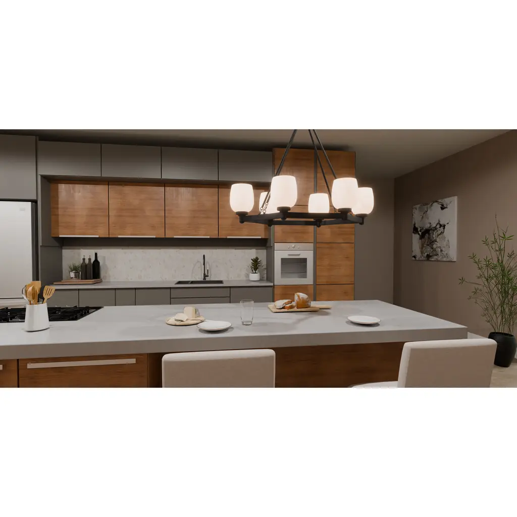 A fresh interpretation of the classic wagon wheel silhouette, Penning features opal etched glass shades that softly cast light. Whether in brushed nickel or matte black, the Penning chandelier delivers on updated traditional style. Hang this chandelier or island light in a foyer, formal dining room or kitchen for timeless style.