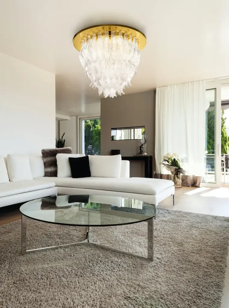 Light source: 6 x E27 (US E26) / 4 x E27 (US E26) halogen energy saving - 6 x E27 (US E26) / 4 x E27 (US E26) LED bulbs.The miracle of nature is revealed yet again to our eyes and offers our heart soft caresses. Patrizia Volpato catches this fascination and transforms it into Petali, a joyous creation full of promises like the first spring. Wind and thoughts run among the arabesques of this line, drawing petals of sunshine, overflowing with life.Available finishes: Polished chrome, Polished 24 karat gold. Murano glass colors: White, Rose, Amber.