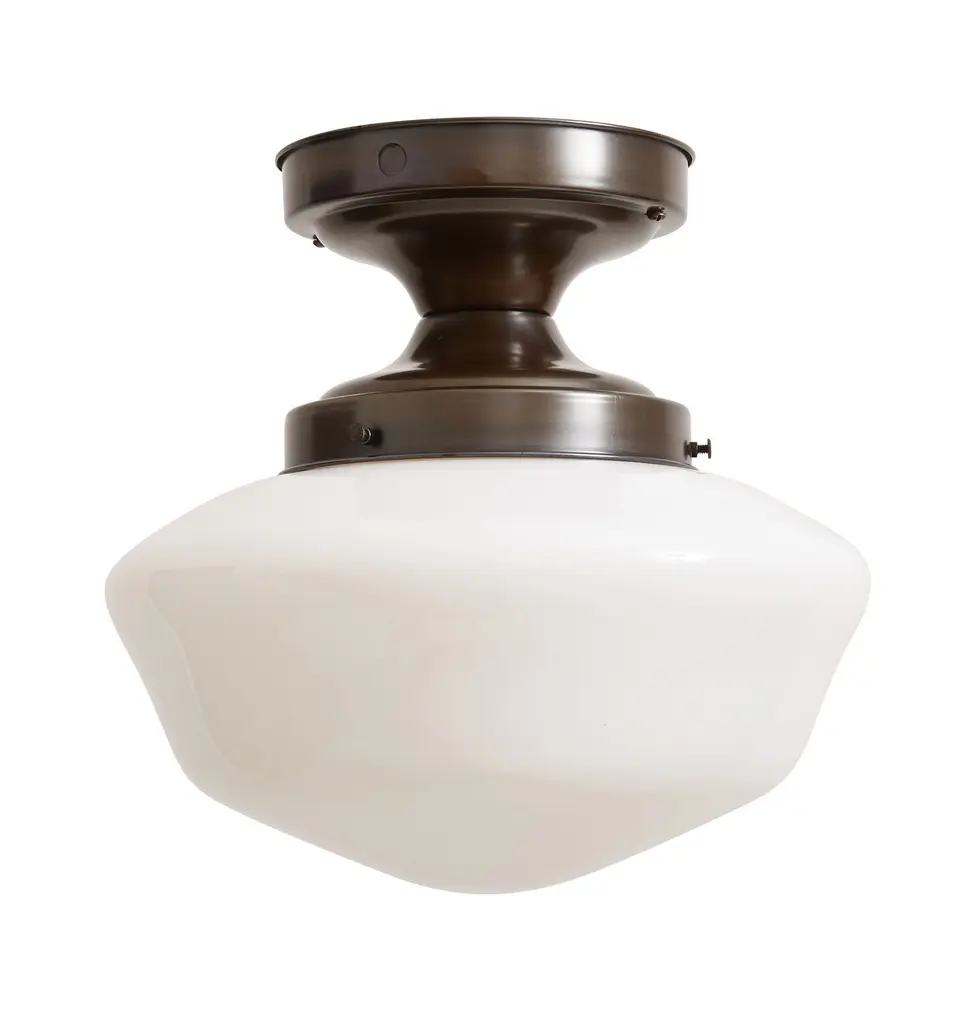 Evoking vintage schoolhouse glass, Petersburg features a mouth-blown glossy opal diffuser. To create this elaborate shape, a skilled artisan works molten glass into a special form called a “paced mold,” which is simultaneously turned by an assistant. With careful timing, the team produces a seamless piece of beautifully detailed glasswork.