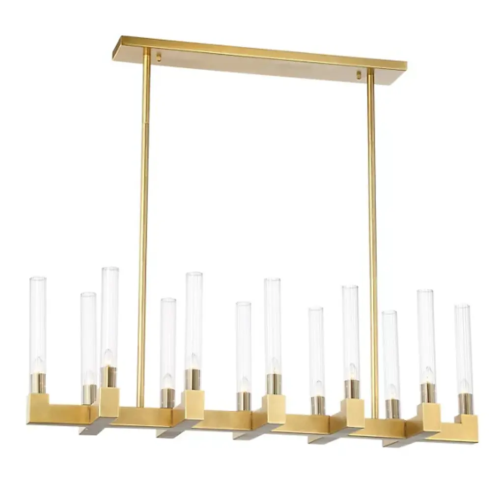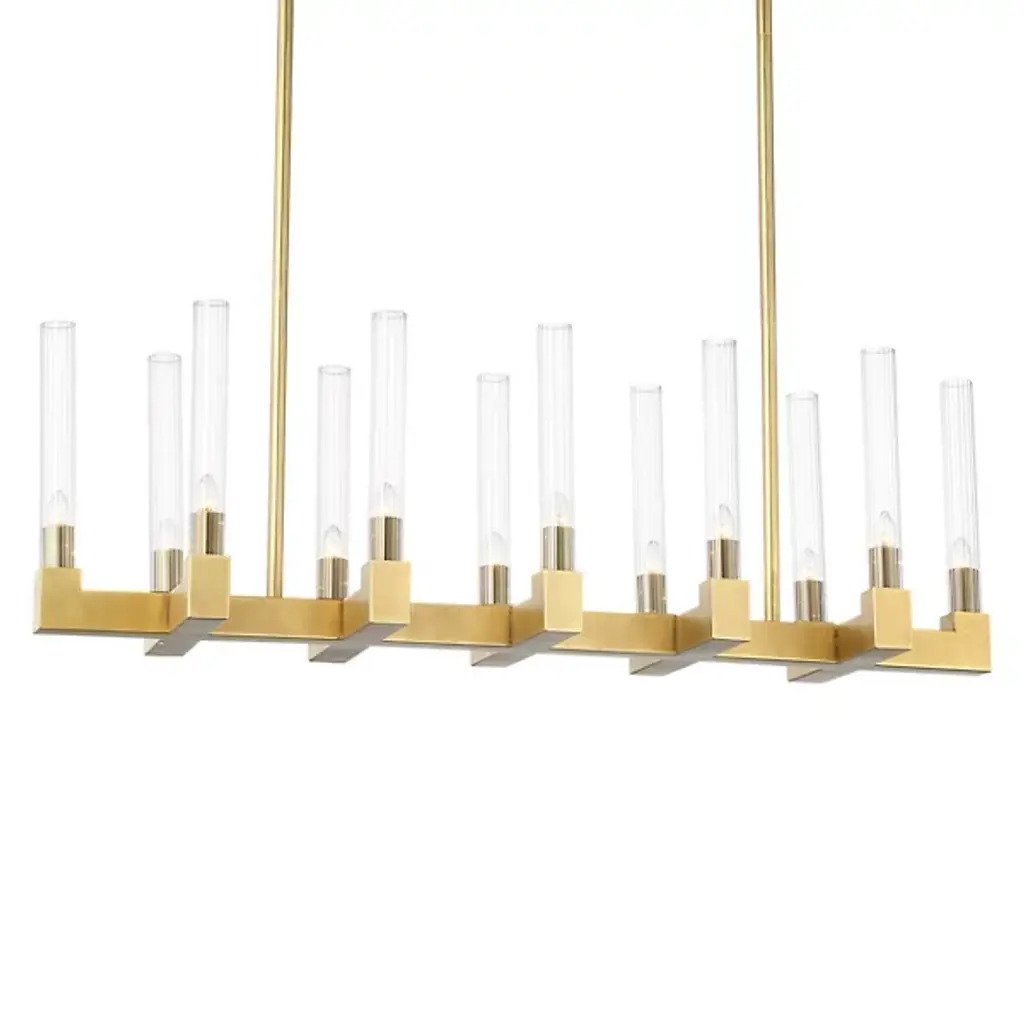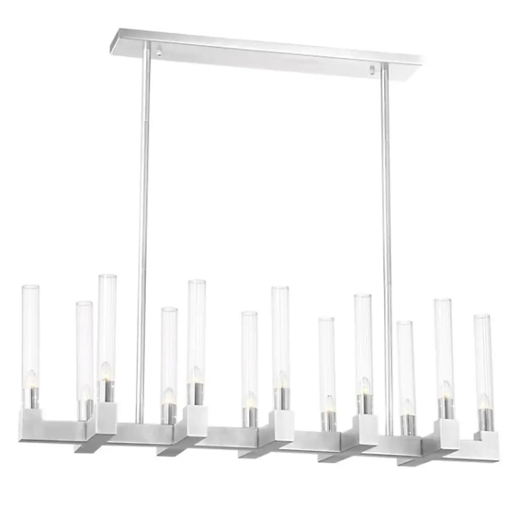 Add a totally tubular touch of the transitional to your larger living spaces with the stark lines and clean surfaces of the Placid Linear Suspension by Zeev Lighting. An angular lower bar hangs down, bound to the ceiling by a rectangular metal mount and two sturdy stems. The bar then angles upward and outward in the form of short branches to subdued candelabra-style lamping tucked under long, cylindrical shades of clear glass.